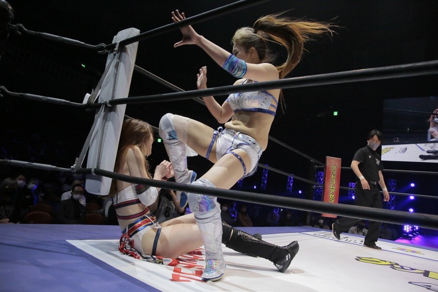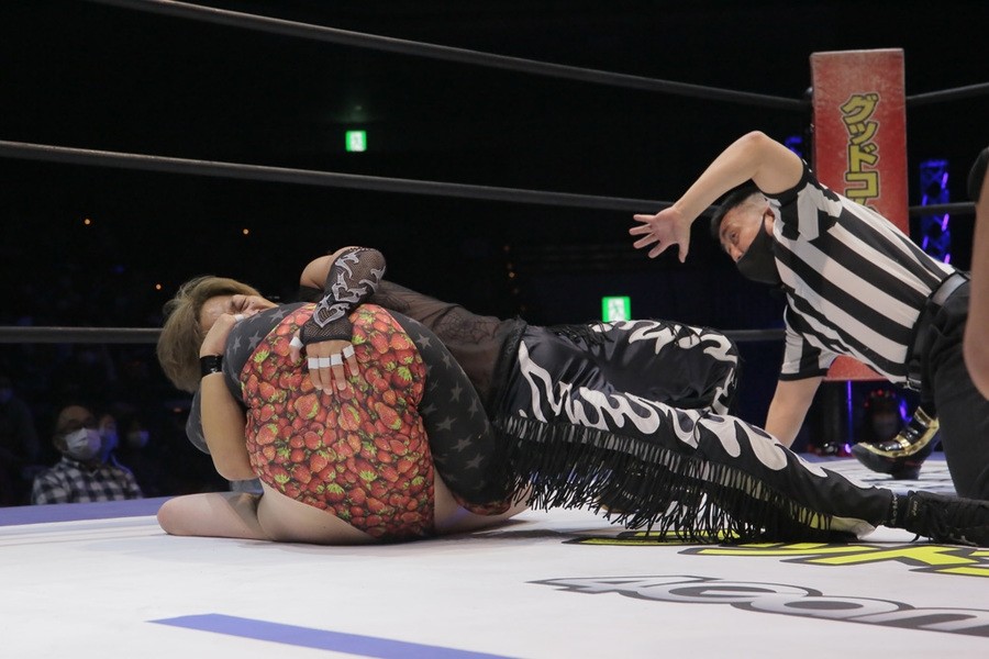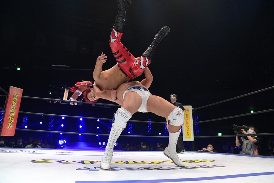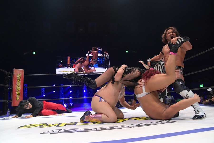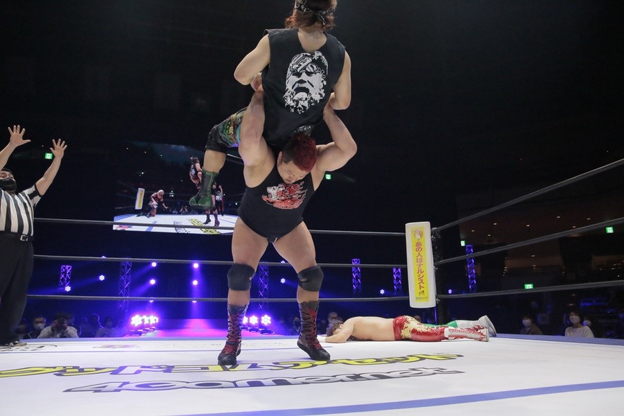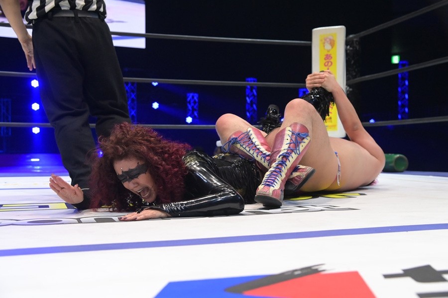 赤井がダイビング・ボディアタック、ミドルキック連打、雪崩式ブレーンバスターで攻め立てれば、雪妃は変型腕固め、スノウトーンボムで応戦。赤井が新人賞をたたき込むも、カウントは2。その後、強烈な張り合いから、赤井がハイキック、ビッグブーツを見舞い、ケツァル・コアトルをズバリと決めて3カウントを奪った。