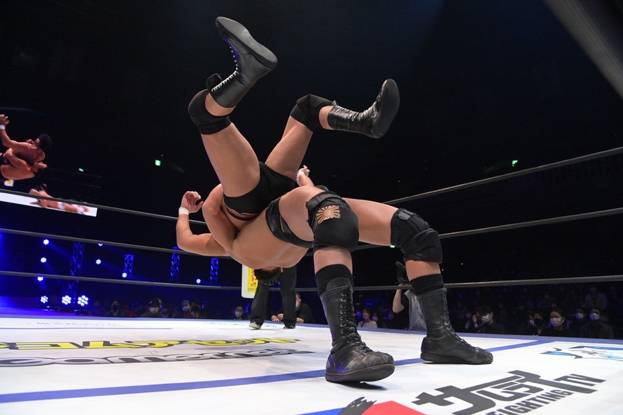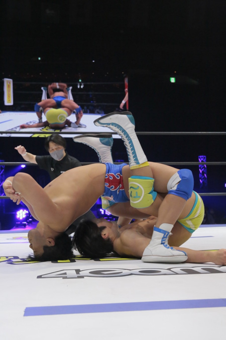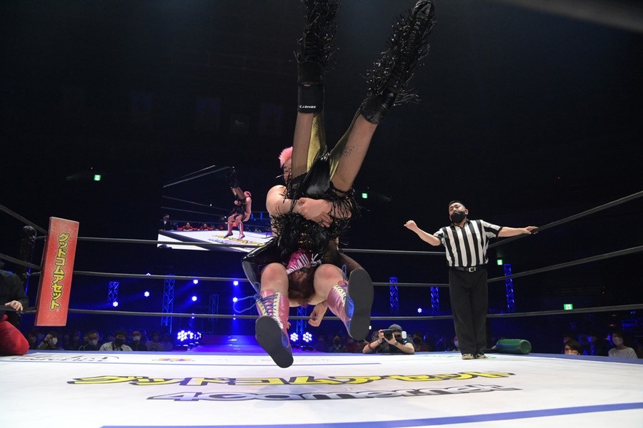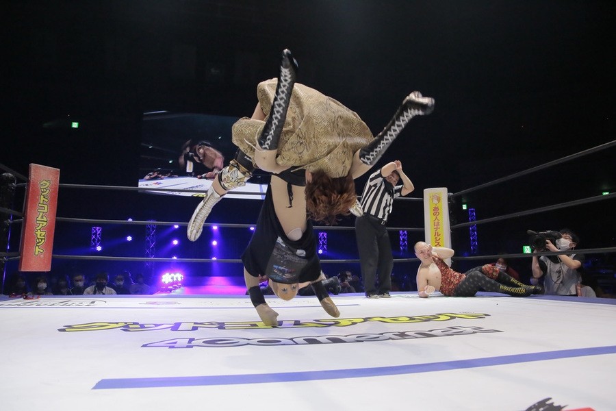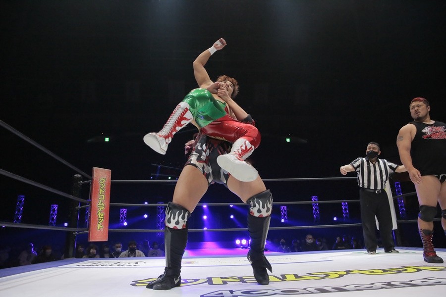 赤井がダイビング・ボディアタック、ミドルキック連打、雪崩式ブレーンバスターで攻め立てれば、雪妃は変型腕固め、スノウトーンボムで応戦。赤井が新人賞をたたき込むも、カウントは2。その後、強烈な張り合いから、赤井がハイキック、ビッグブーツを見舞い、ケツァル・コアトルをズバリと決めて3カウントを奪った。