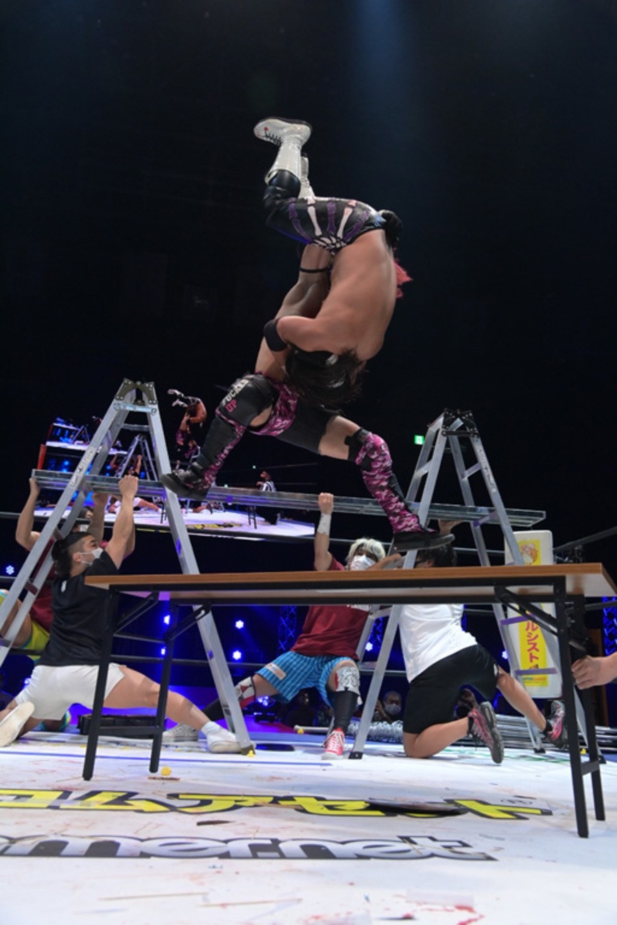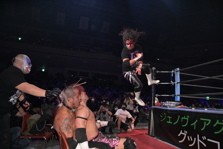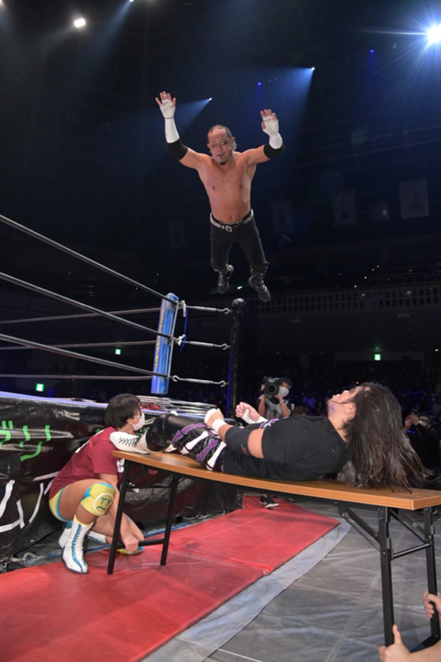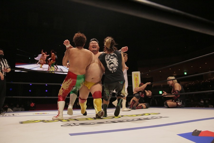 戦前からMAOが眼中になかった佐々木と葛西は、この日も2人で乱闘を展開。その間隙を縫う形でMAOも存在感を発揮。ギターを手にすると、葛西、佐々木の脳天を殴打。2つのラダーに鉄製の板を通してセットすると、リング上に立てかけたテーブルめがけて佐々木をスーパーみちのくドライバーⅡ(雪崩式みちのくドライバーⅡ)で投げて3カウントを奪取した。
