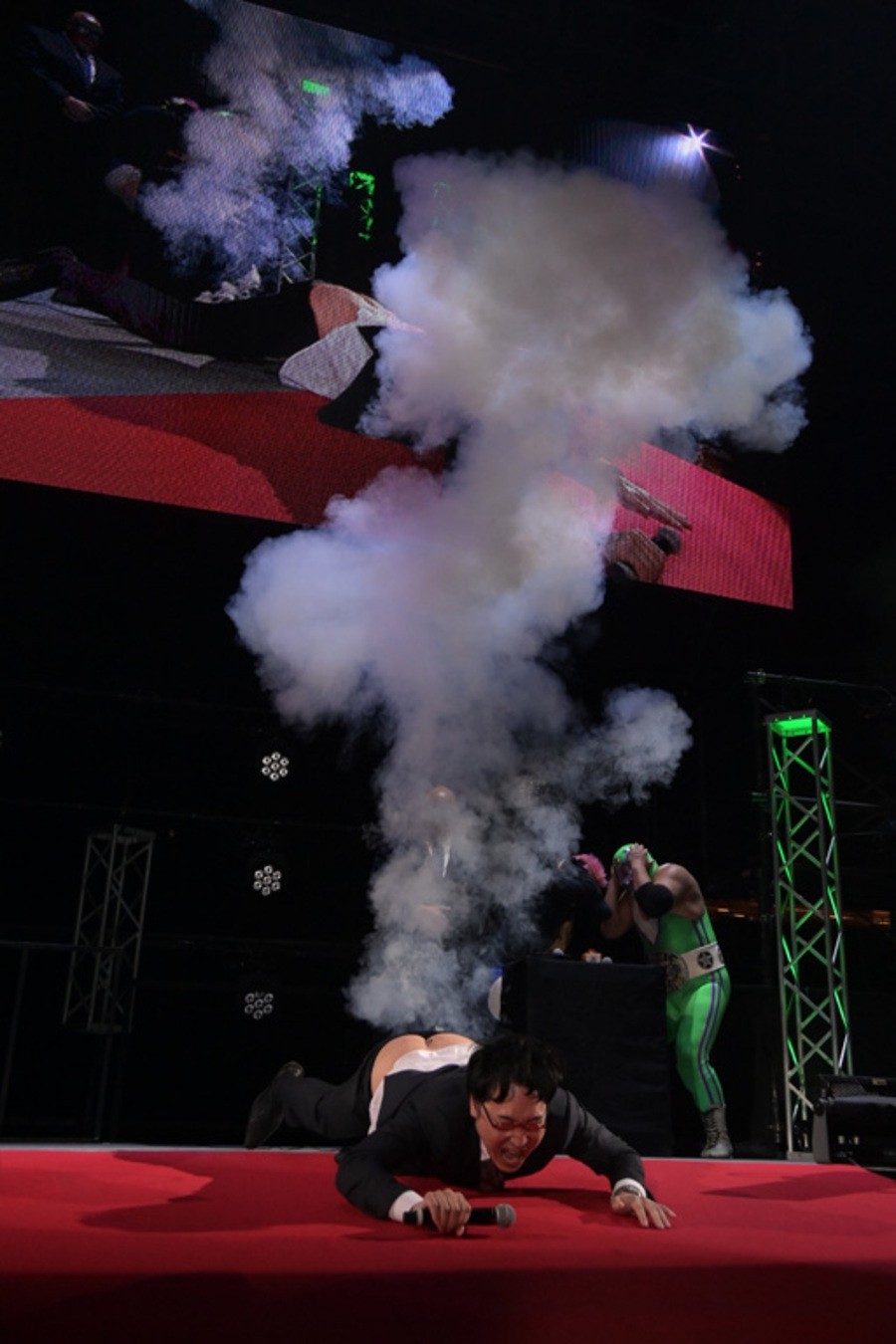 いきなりLiLiCoはディーノの急所を鷲づかみにし、自身の股間にディーノの手をもっていき精神的なダメージを与えた。小田井に代わると、攻め込まれてあっさり窮地に。すると、レフェリーが昏倒している隙に、純烈メンバーが救出に入り、今成に波状攻撃。フェロモンズはセクシーピーラー、フェロモン大放屁で攻撃も、セクシーシーソーではLiLiCoが飯野の股に噛みついて反撃。さらに逆セクシーシーソーでディーノの顔をLiLiCoの股間にぶち当てた。その後、LiLiCoと小田井の夫婦の合体技「姫SEXYチェストキック♡」が2度目のトライで、飯野にヒット。だが、これで終われないフェロモンズはディーノがLiLiCoにローキック、膝にニードロップ。男色ドライバーから膝十字固めでウイークポイントの左ヒザを絞め上げると、たまらずLiLiCoはギブアップ。引退試合を白星で飾ることはできなかった。