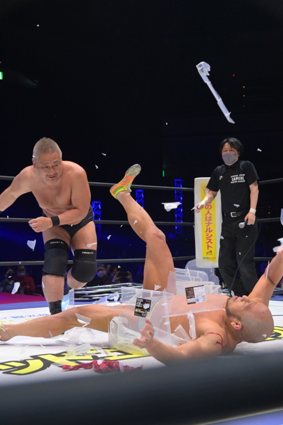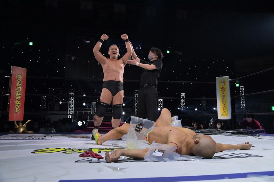 一方、大流血で王座から滑り落ちた佐々木は「葛西純、俺をこんな姿にしやがって。これがアイツの5年分の恨みか? 絶対に許さねぇぞ。必ずアイツに復しゅうしてやる。存在感ボーイ(MAO)、ジャマしやがって。見事にかっさらっていったな。アイツにも必ず復しゅうしてやる」とリベンジを期した。