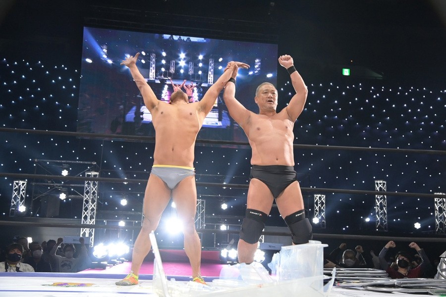 また、大会を総括した高木三四郎社長は「(メインは)60分あっても決着つかなかったんじゃないかというくらい、どうなることかと思って見ていたんですけど、やっぱりすごかった。今のDDTが誇る最高峰の試合だったと思います。DDTの最高峰はプロレス界のどこに出しても恥ずかしくないくらいの試合だった。それくらい遠藤哲哉と竹下幸之介の試合は、それだけで一つのブランドになったんじゃないかと思います。3年ぶりの両国国技館大会で、いろんな感慨深いものがあります。年1、2くらいは両国とかの規模感でやりたいというのが希望です。来年、また夏に戻したいなというのはあるんで。あと、すごくDDTを初めて見た人が多かったです。この辺はWRESTLE UNIVERSEが普及してきたのかなと思っていて。東京女子、ノアだけを見てきた人とかもいたし、ふだんは新日本、全日本しか見てないという人もいたので。やってきたことが点と点でつながってきたというか。WRESTLE UNIVERSEを伸ばしてきて、ようやく実になってきたのかなと実感できた。DDTとしては、別に終わるわけじゃないんで、30年、40年、50年、100年と続けていかくちゃいけないと思ってます」とコメント。