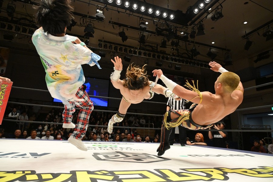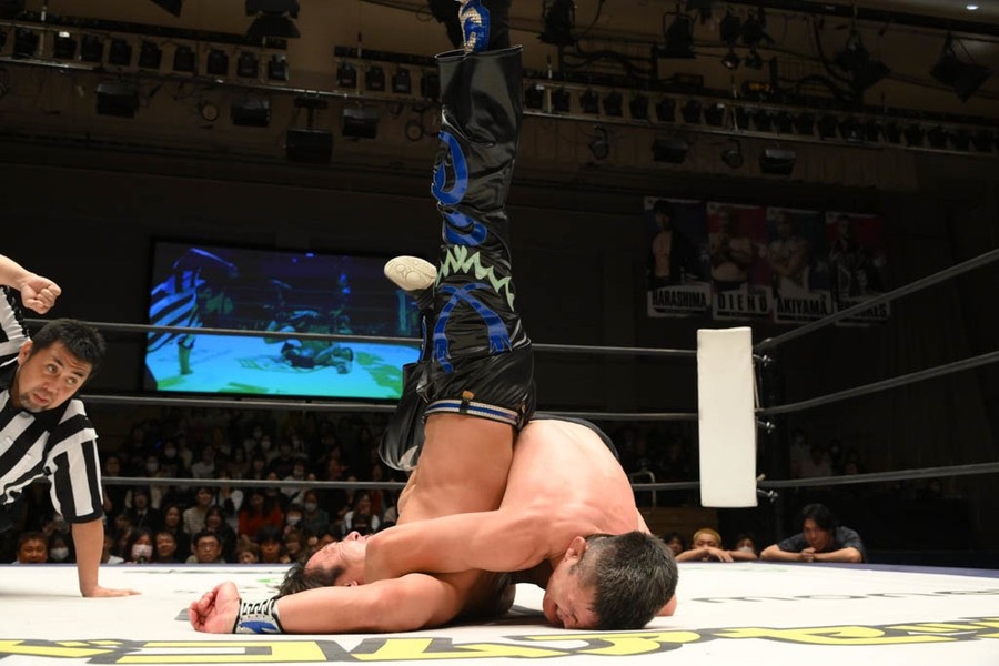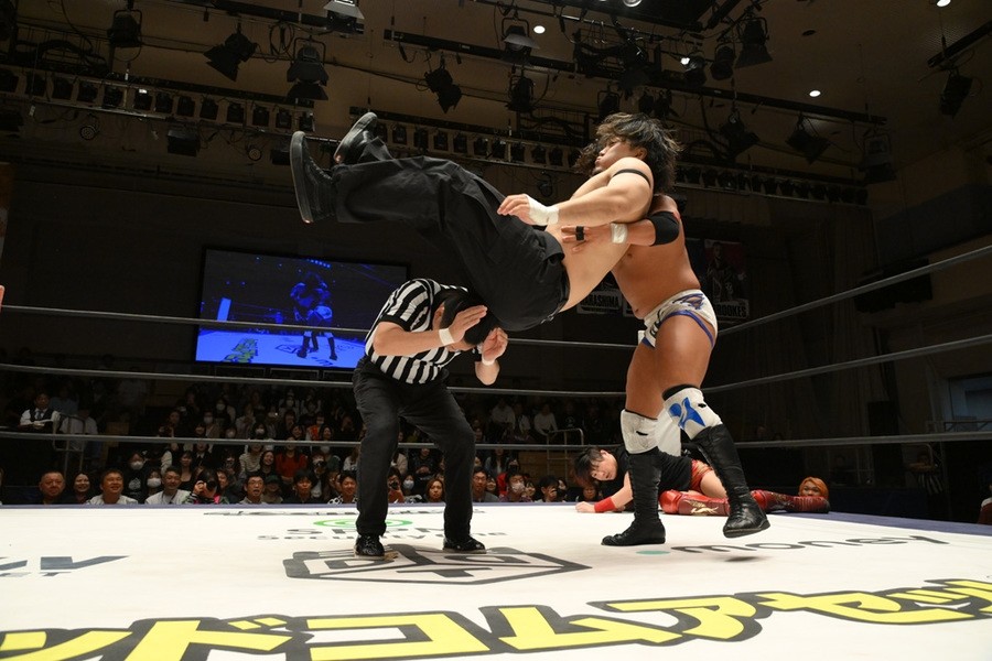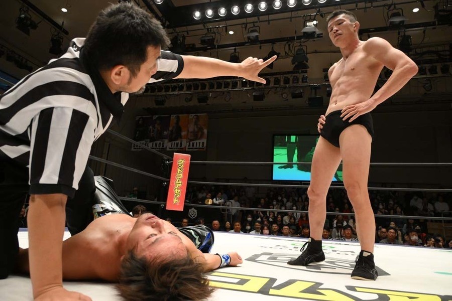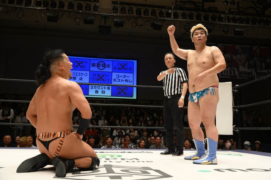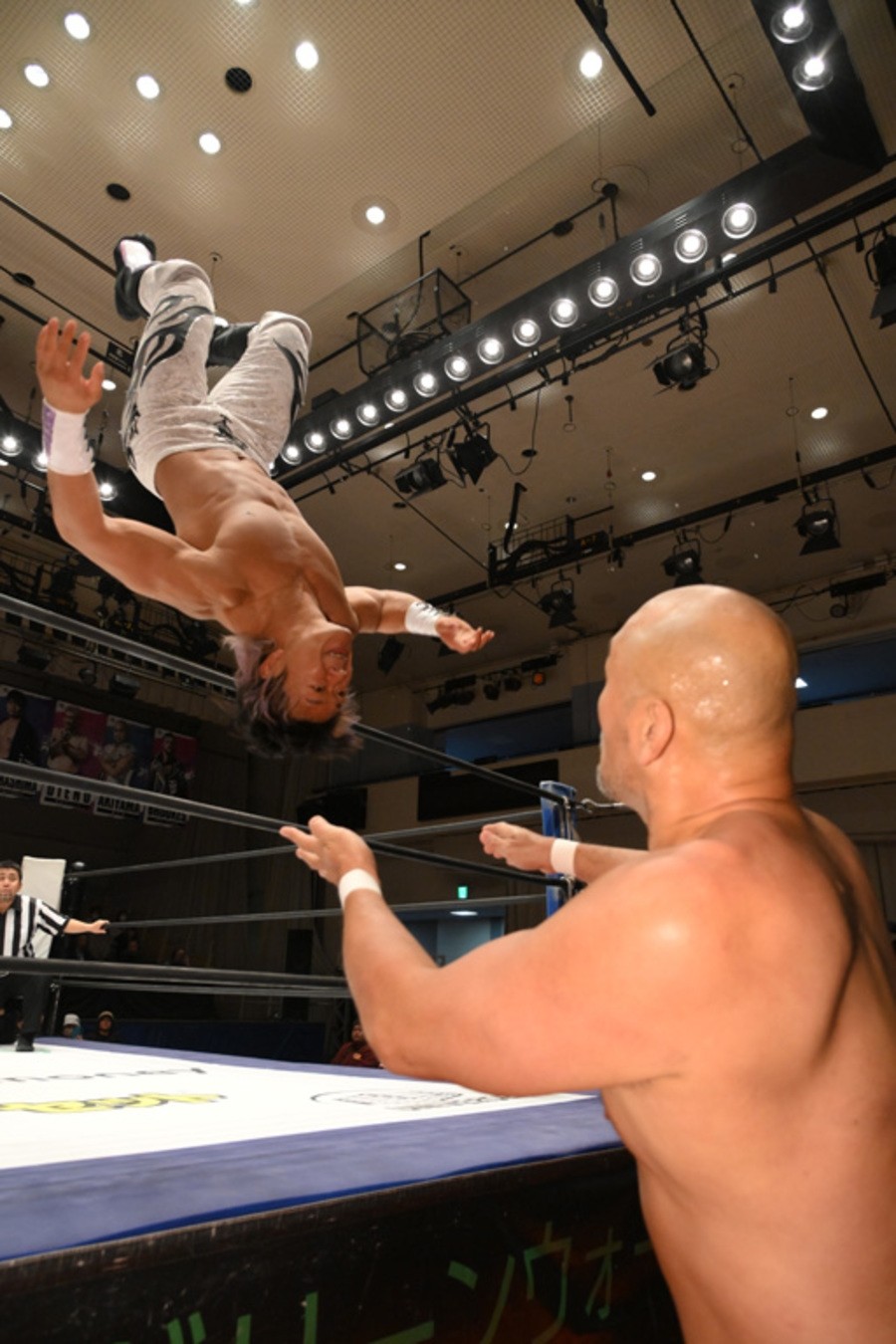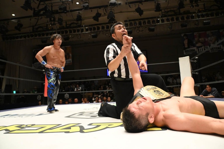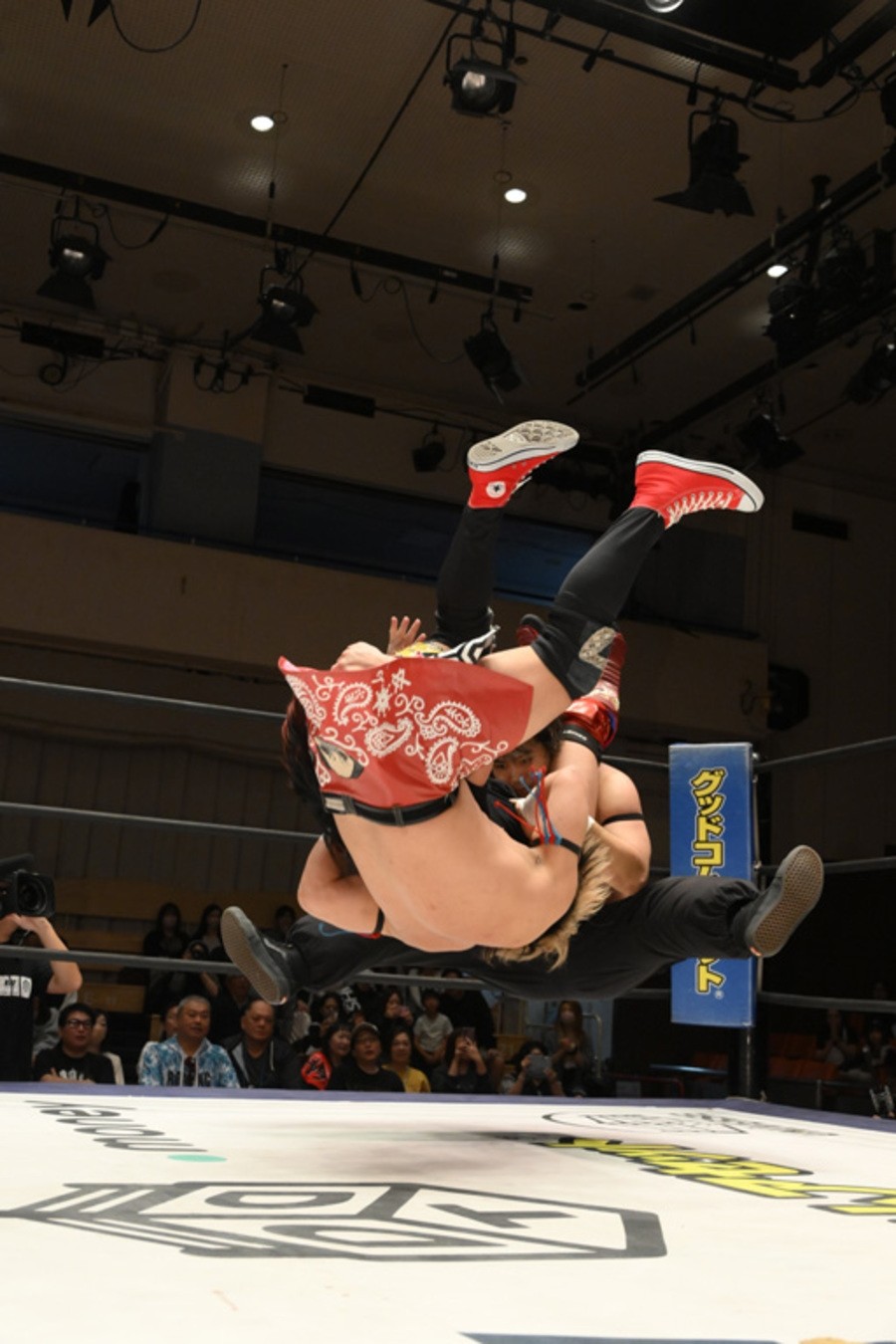 飯野はチョップ連打、ラリアットを叩き込むも、スピアはフランケンシュタイナーで切り返される。MAOは掌底を連発するが、飯野がスピアで返す。さらに飯野がスピアを狙うも、かわしたMAOは居合いキック、みちのくドライバーⅡもカウントは2。ならばとMAOはもう一発、居合いキックを見舞って3カウントを奪取。9・8名古屋で飯野にしてやられたが、その逆の形で至宝を奪い返した。