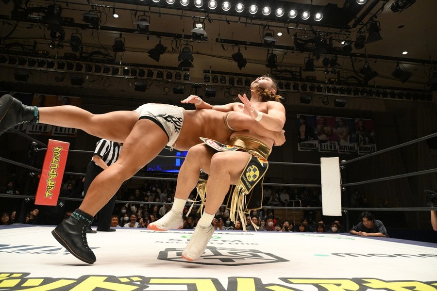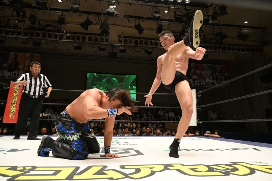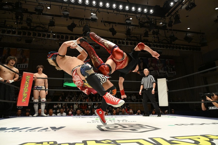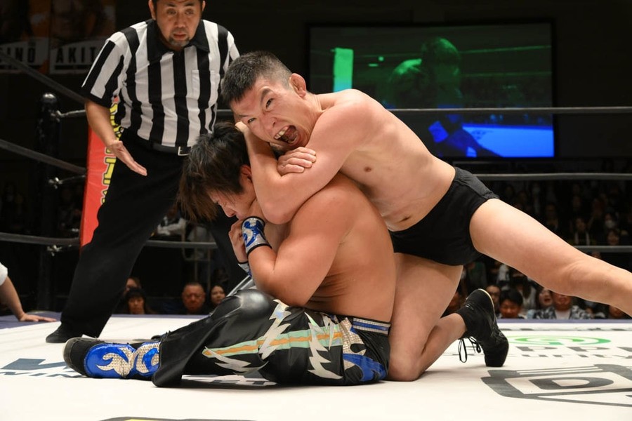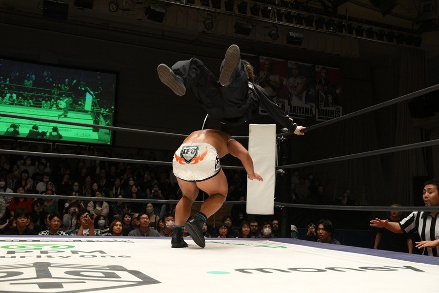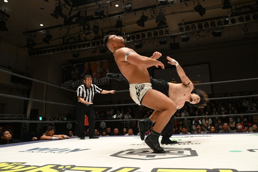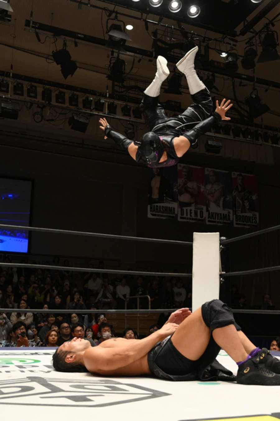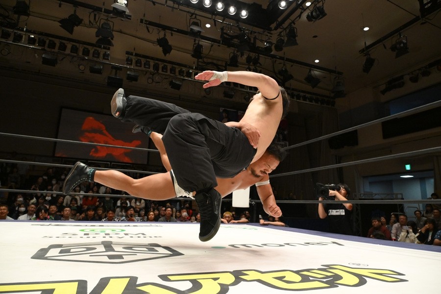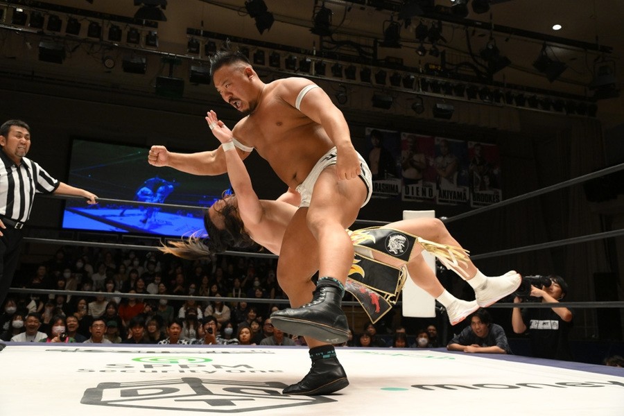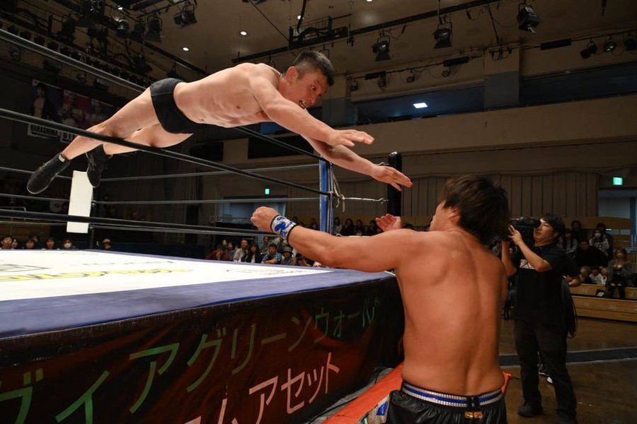 飯野はチョップ連打、ラリアットを叩き込むも、スピアはフランケンシュタイナーで切り返される。MAOは掌底を連発するが、飯野がスピアで返す。さらに飯野がスピアを狙うも、かわしたMAOは居合いキック、みちのくドライバーⅡもカウントは2。ならばとMAOはもう一発、居合いキックを見舞って3カウントを奪取。9・8名古屋で飯野にしてやられたが、その逆の形で至宝を奪い返した。