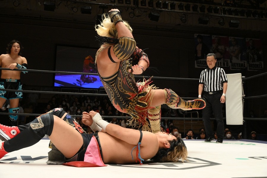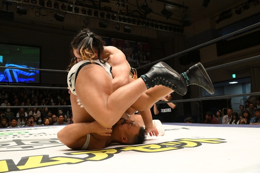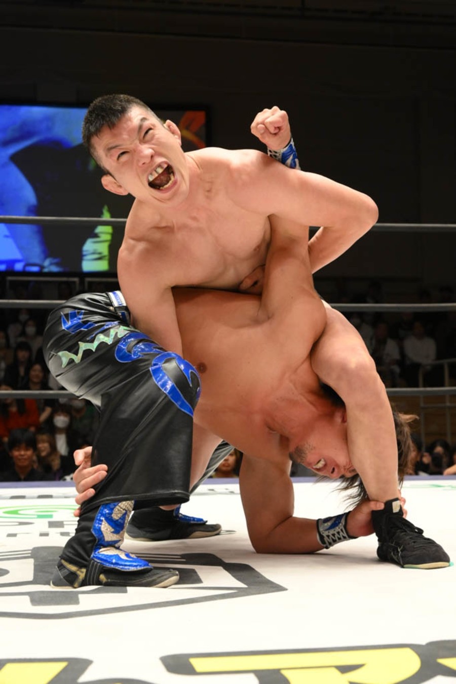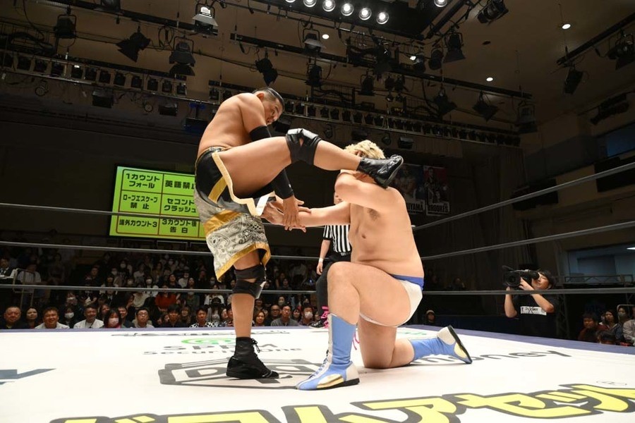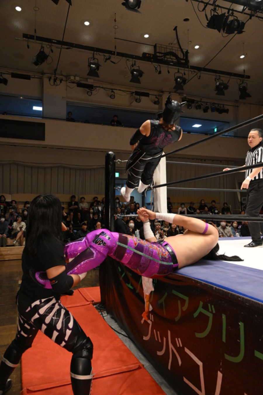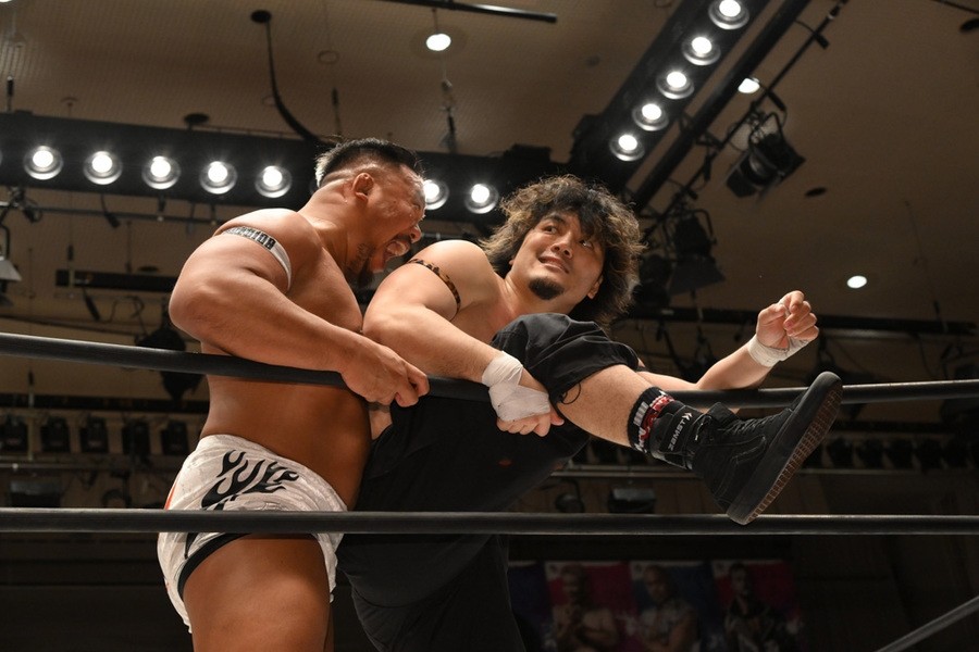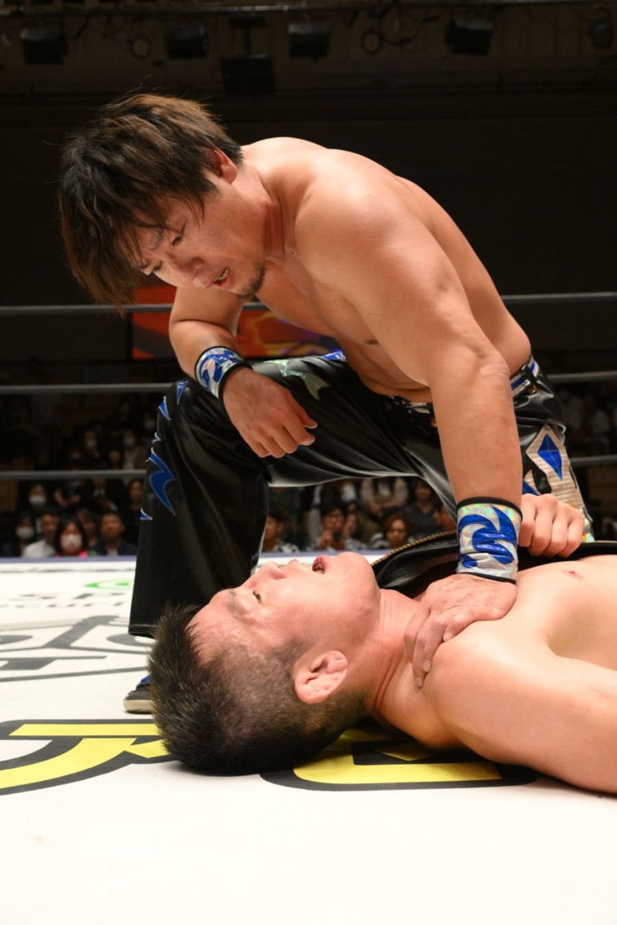飯野はチョップ連打、ラリアットを叩き込むも、スピアはフランケンシュタイナーで切り返される。MAOは掌底を連発するが、飯野がスピアで返す。さらに飯野がスピアを狙うも、かわしたMAOは居合いキック、みちのくドライバーⅡもカウントは2。ならばとMAOはもう一発、居合いキックを見舞って3カウントを奪取。9・8名古屋で飯野にしてやられたが、その逆の形で至宝を奪い返した。