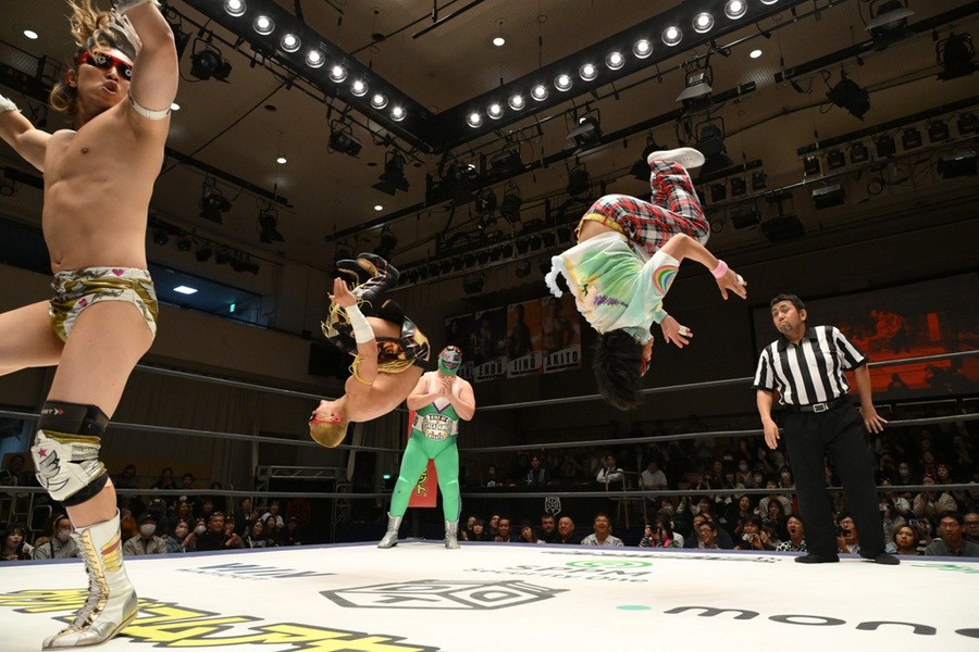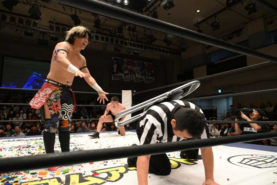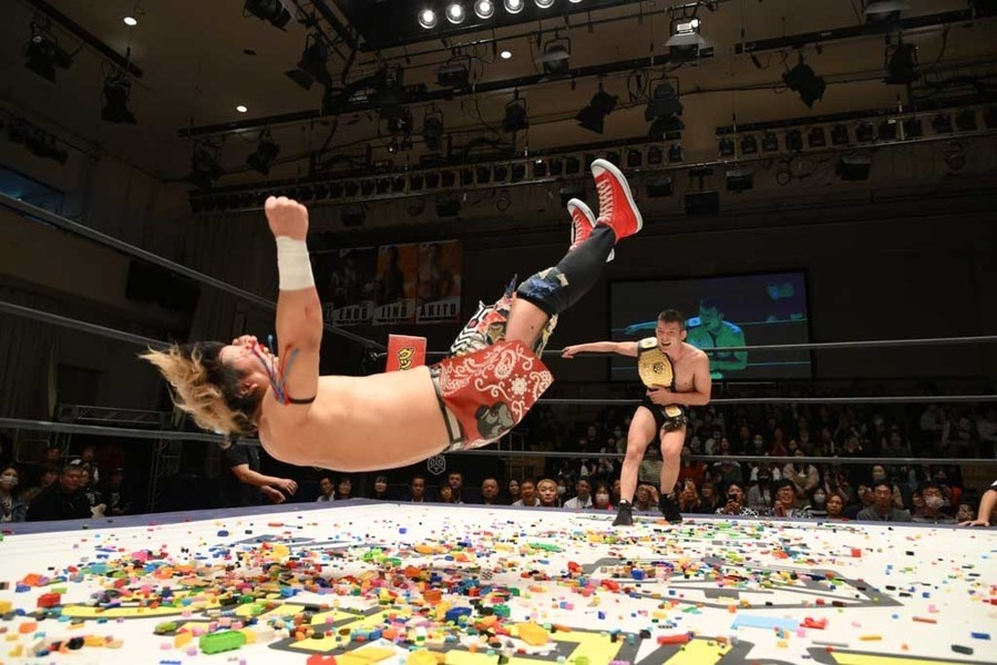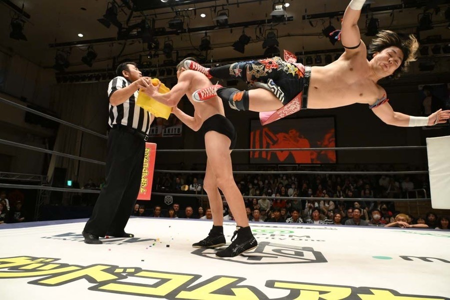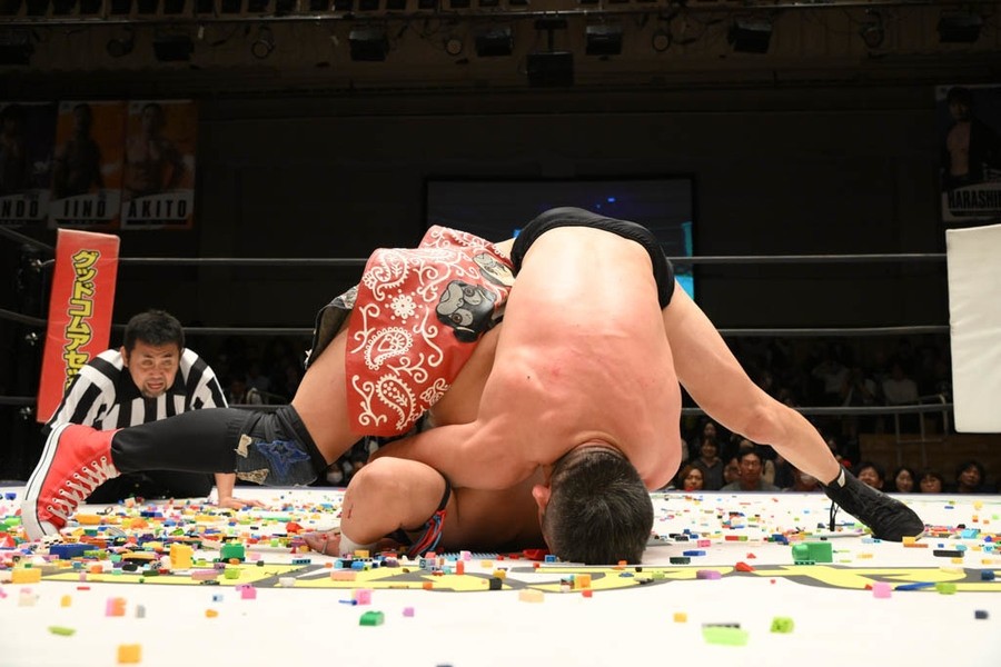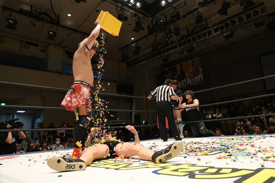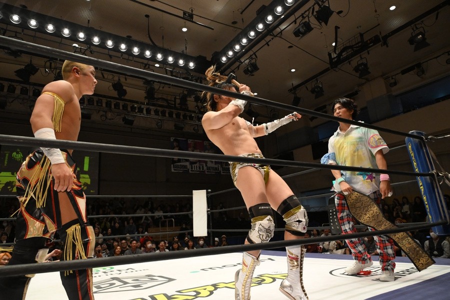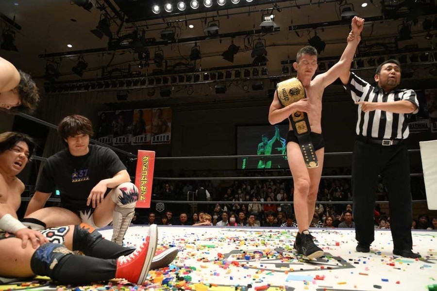 HARASHIMAの厳しい攻めを受けた青木は疲労困ぱいとなったが、勝俣が現れて「いつどこ」を行使。同王座初挑戦となった勝俣はととのえスプラッシュ、場外での鉄柱攻撃とたたみかける。ブロック玩具の入ったケースを取り出すと、レフェリーが止めるも、ケースを持っていた青木に勝俣がドロップキックを見舞ってリング上にブロック玩具が散乱。その上での攻防となり、さらに勝俣がブロック玩具を追加して、ととのえスプラッシュもカウントは2。青木は足決めヘッドシザース、足決めチキンウイング・アームロックで締め上げるも勝俣はなんとか脱出。レフェリーにイスが当たってしまい昏倒すると、勝俣は場外にテーブルを立てて、その上に青木を寝かせ、テープでグルグル巻きに。そしてリング上に設置したラダー上からサウナトランススプラッシュを敢行。勝俣はリングに戻すと、久々に見せたファイアーバード・スプラッシュ、ジャーマンもフォールは奪えず。返した青木は再びフルネルソン・ホールドで3カウントを奪取した。
