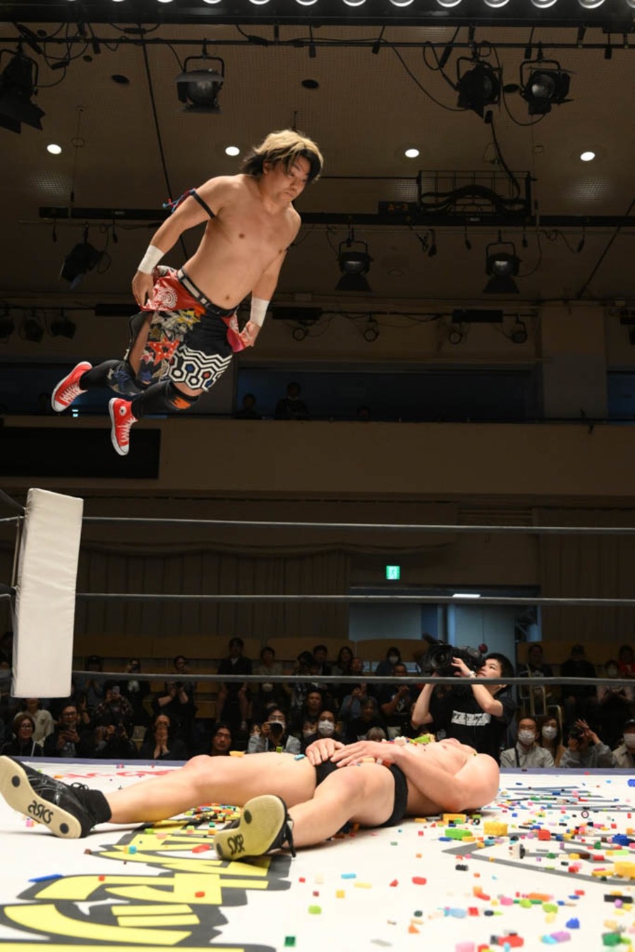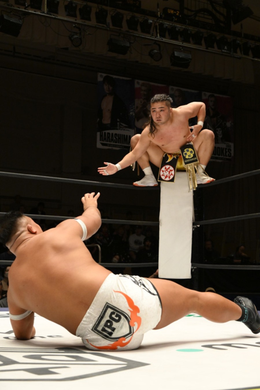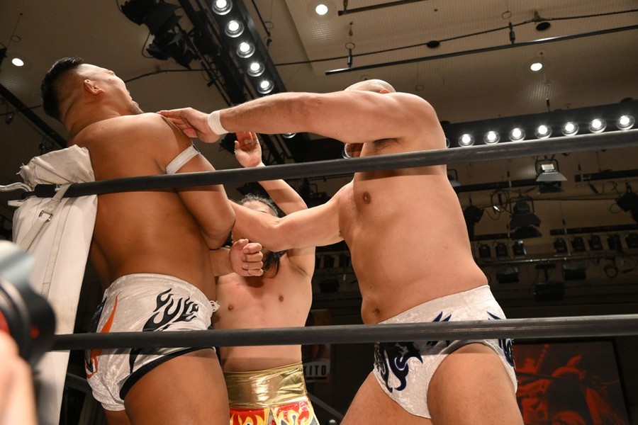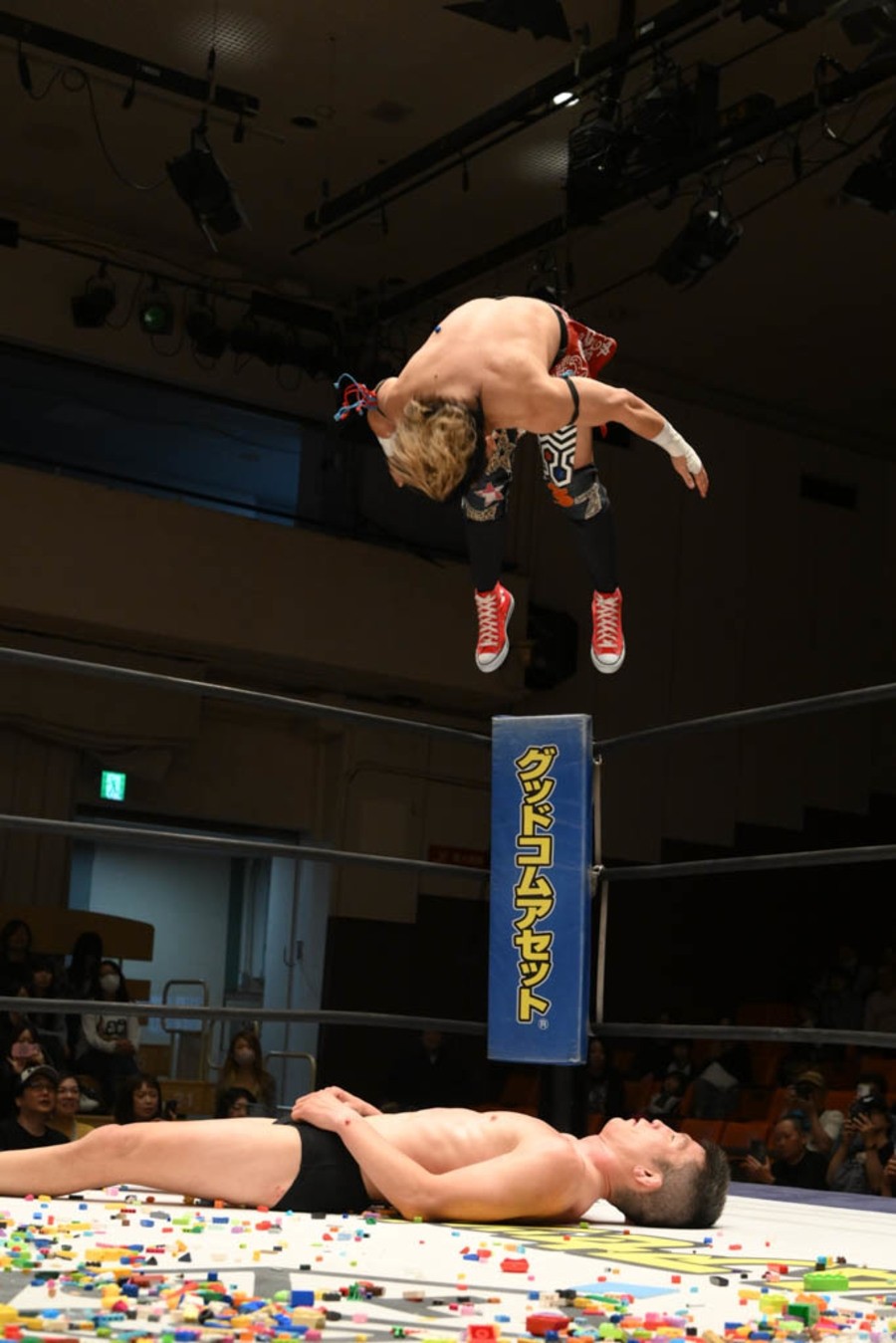 HARASHIMAの厳しい攻めを受けた青木は疲労困ぱいとなったが、勝俣が現れて「いつどこ」を行使。同王座初挑戦となった勝俣はととのえスプラッシュ、場外での鉄柱攻撃とたたみかける。ブロック玩具の入ったケースを取り出すと、レフェリーが止めるも、ケースを持っていた青木に勝俣がドロップキックを見舞ってリング上にブロック玩具が散乱。その上での攻防となり、さらに勝俣がブロック玩具を追加して、ととのえスプラッシュもカウントは2。青木は足決めヘッドシザース、足決めチキンウイング・アームロックで締め上げるも勝俣はなんとか脱出。レフェリーにイスが当たってしまい昏倒すると、勝俣は場外にテーブルを立てて、その上に青木を寝かせ、テープでグルグル巻きに。そしてリング上に設置したラダー上からサウナトランススプラッシュを敢行。勝俣はリングに戻すと、久々に見せたファイアーバード・スプラッシュ、ジャーマンもフォールは奪えず。返した青木は再びフルネルソン・ホールドで3カウントを奪取した。