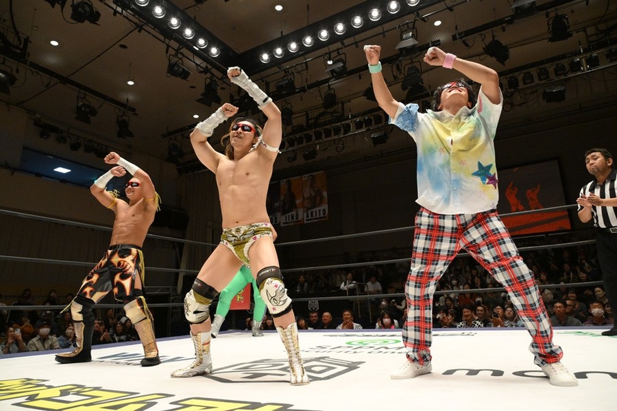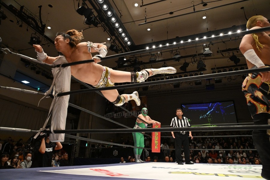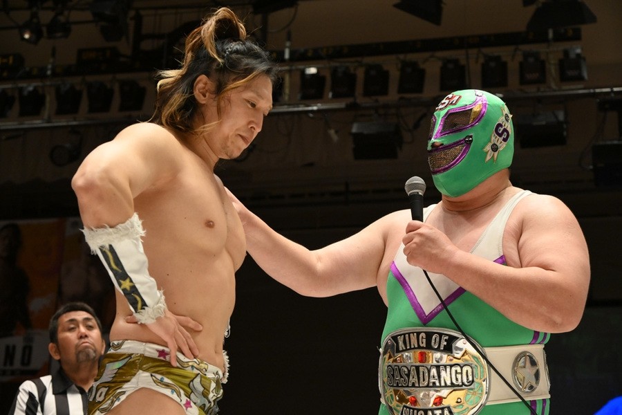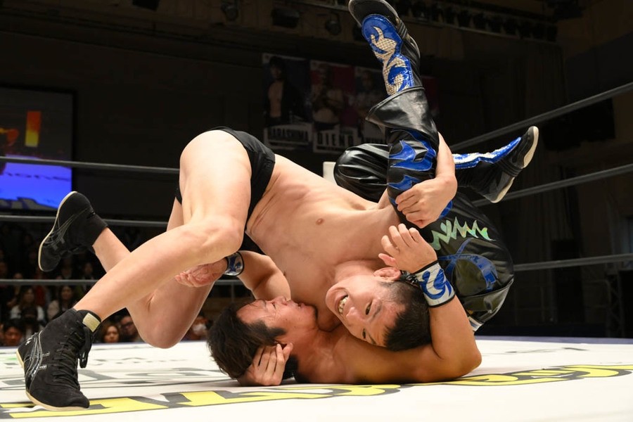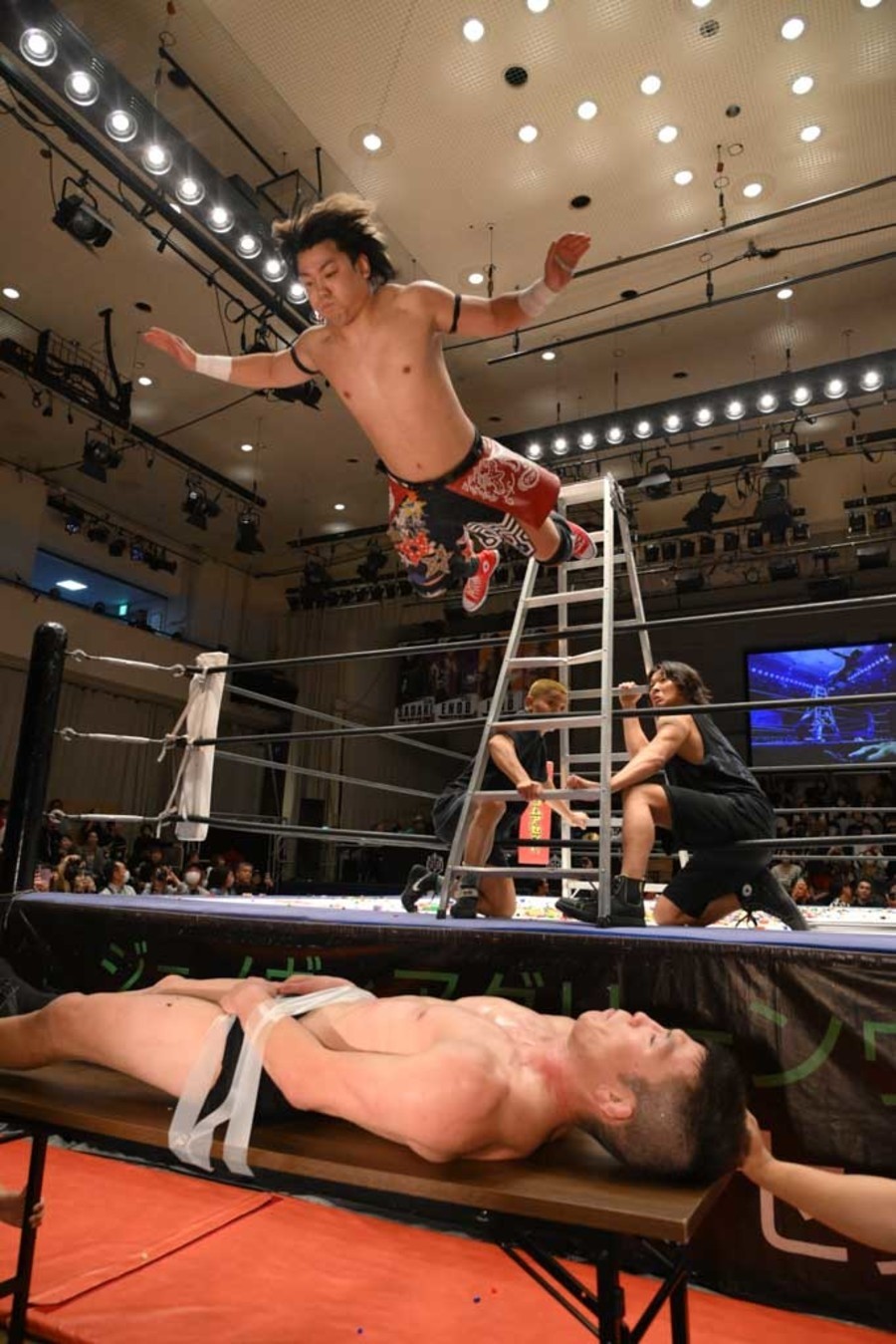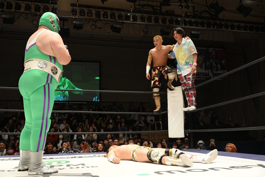 HARASHIMAの厳しい攻めを受けた青木は疲労困ぱいとなったが、勝俣が現れて「いつどこ」を行使。同王座初挑戦となった勝俣はととのえスプラッシュ、場外での鉄柱攻撃とたたみかける。ブロック玩具の入ったケースを取り出すと、レフェリーが止めるも、ケースを持っていた青木に勝俣がドロップキックを見舞ってリング上にブロック玩具が散乱。その上での攻防となり、さらに勝俣がブロック玩具を追加して、ととのえスプラッシュもカウントは2。青木は足決めヘッドシザース、足決めチキンウイング・アームロックで締め上げるも勝俣はなんとか脱出。レフェリーにイスが当たってしまい昏倒すると、勝俣は場外にテーブルを立てて、その上に青木を寝かせ、テープでグルグル巻きに。そしてリング上に設置したラダー上からサウナトランススプラッシュを敢行。勝俣はリングに戻すと、久々に見せたファイアーバード・スプラッシュ、ジャーマンもフォールは奪えず。返した青木は再びフルネルソン・ホールドで3カウントを奪取した。