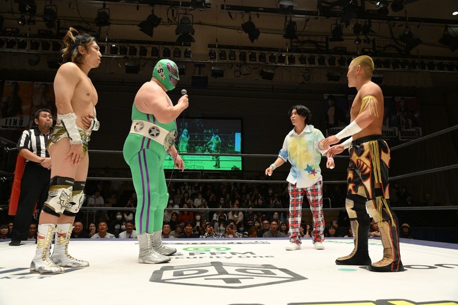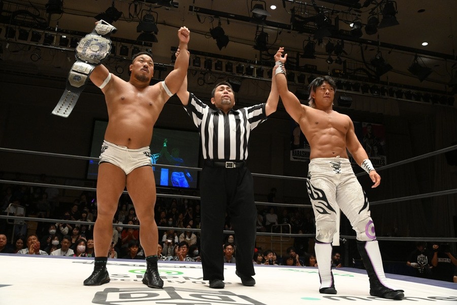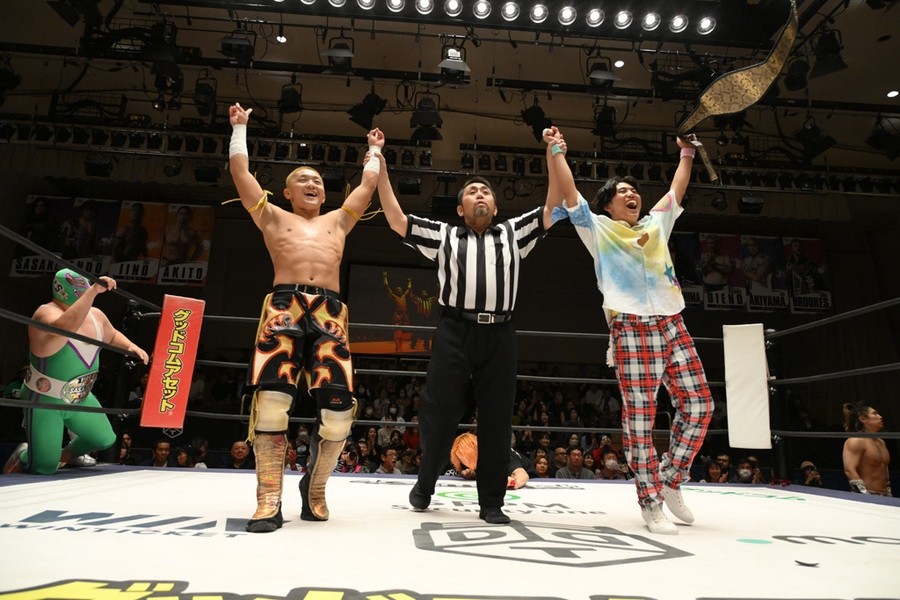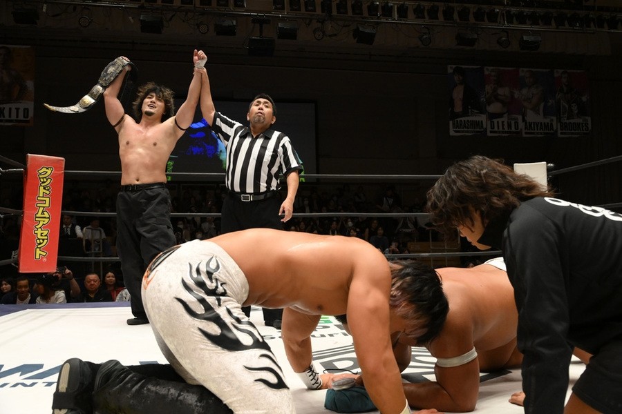 DDT EXTREME選手権は挑戦者の男色ディーノが王者の彰人を超難解なルールで下して、8年ぶりに王座返り咲きを果たした。ディーノは11月23日の後楽園ホール大会で、“高校生レスラー”夢虹と禁断の初防衛戦を行うことが決定した。