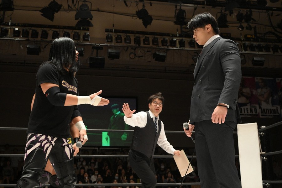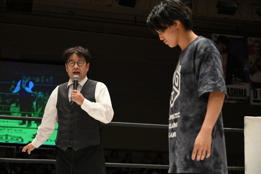 ここで今林久弥GMがリングに上がり、次期防衛戦が11・23後楽園になることをアナウンスし、戦いたい相手を問うた。するとディーノは夢虹を希望。だが、今林GMは「それは無理。夢虹は高校2年生だから。16歳の男子高校生と男色ディーノのシングルマッチは会社的に問題がある。コンプライアンス的にも」と拒絶。事実、これまでディーノと夢虹が試合で絡むことはほとんどなかった。
