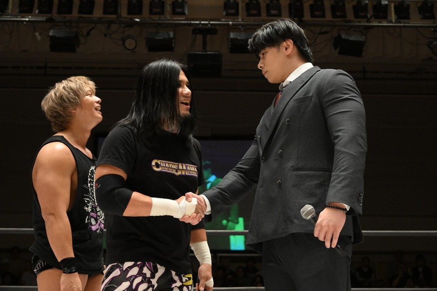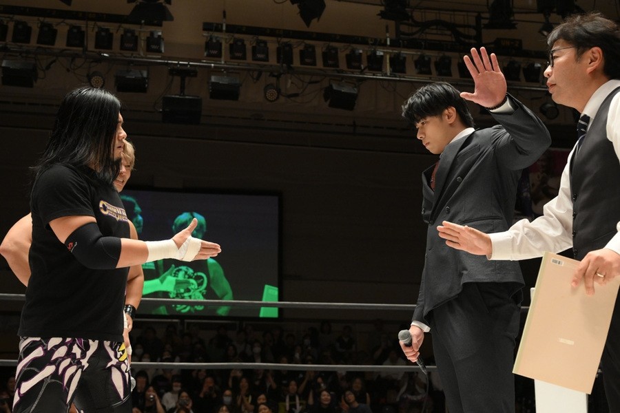 すると、ここで悪の“カリスマ”佐々木大輔がKANONを伴ってリングイン。佐々木は「桜庭ちゃんよ、俺には見える。君の才能が。君の悪党の才能が。俺たちと一緒に開花させようじゃないか。両国、俺たちと一緒に闘おうじゃねぇか!」と悪魔のささやき。桜庭は拒否すると思いきや、佐々木とガッチリ握手を交わし、まさかのDAMNATION T.A入り。