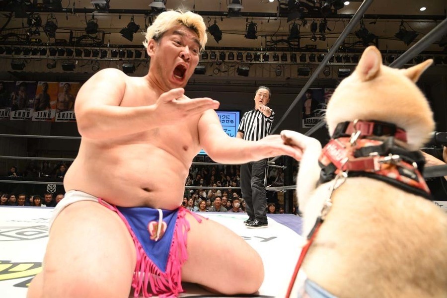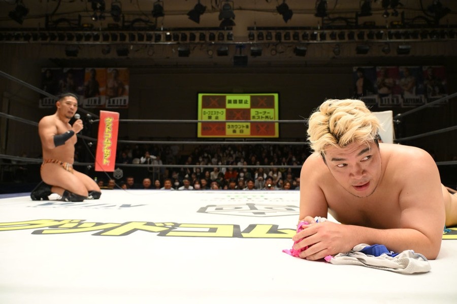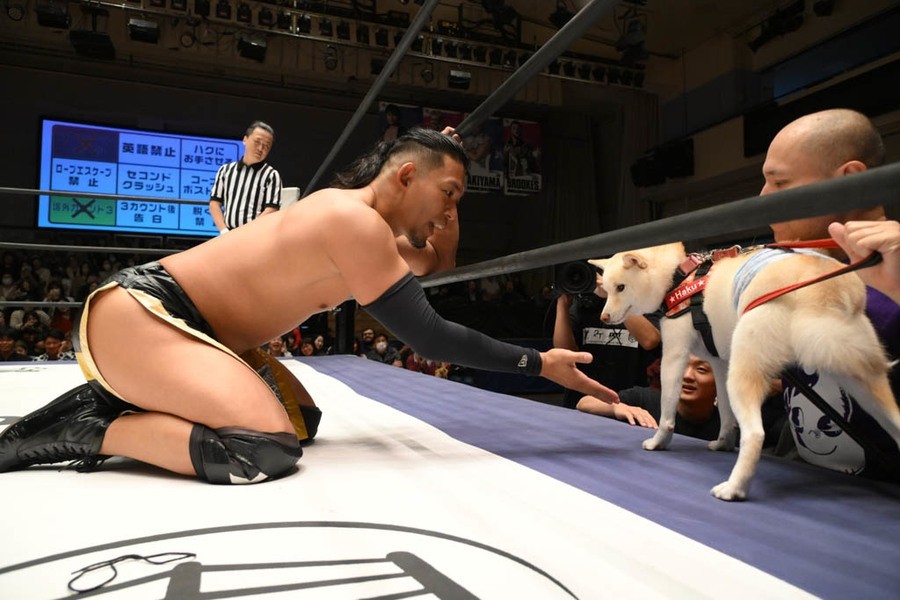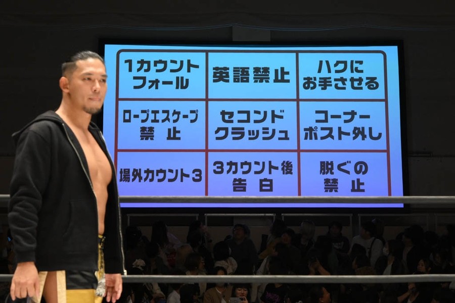 今回の9つの勝利条件・NGムーブは「1カウントフォール」「英語NG」「(ディーノの愛犬の)ハクにお手をさせる」「ロープエスケープ禁止」「セコンドクラッシュ」「コーナーポスト外し」「場外カウント3」「3カウント後告白」「脱ぐの禁止」。