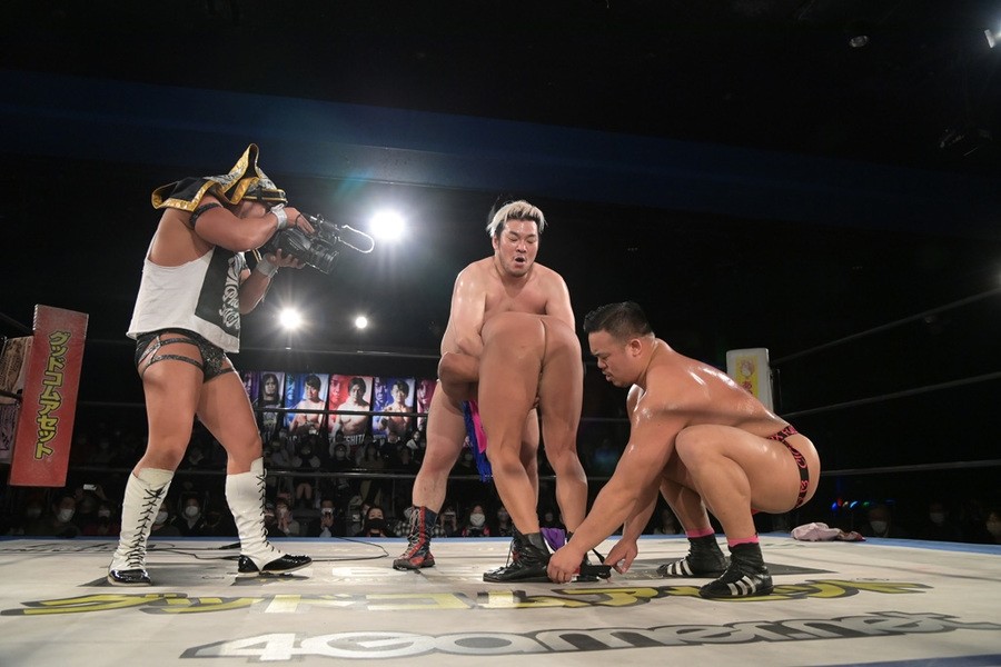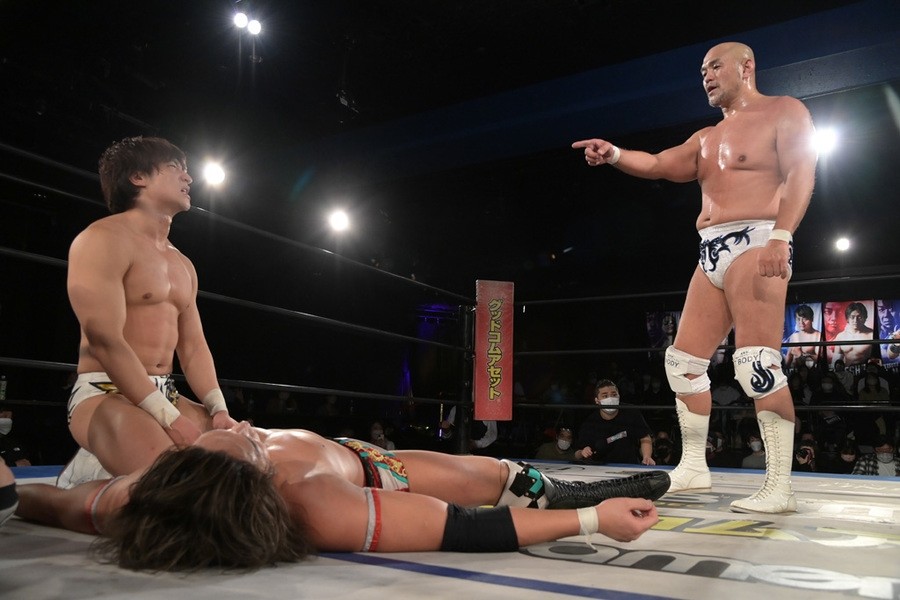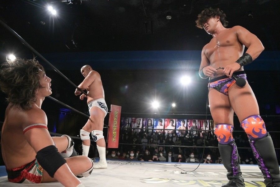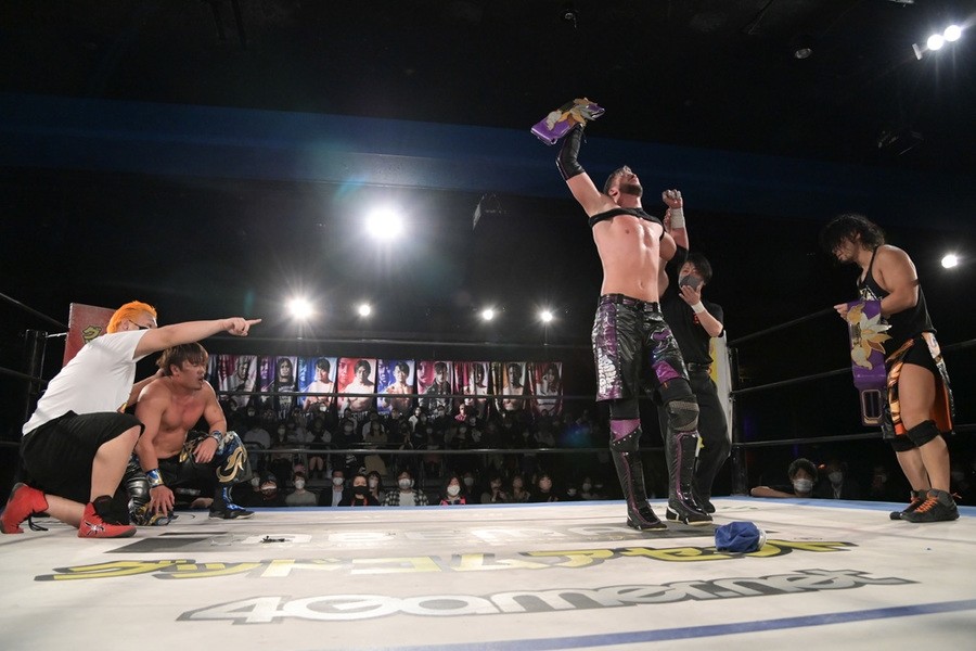 竹下はPlus Ultraで遠藤を絞め上げるも、秋山のカットに遭い、1vs2ではなかなか決まらず。竹下もザーヒー、ラリアットでなんとか活路を見いだそうとするも、秋山のエクスプロイダーから遠藤が旋回式トーチャーラックボムを繰り出すと、最後は遠藤がバーニングスター・プレス(シューティングスター・プレス)を鮮やかに決めて竹下からピンフォールを奪い、3日前の借りを返した。