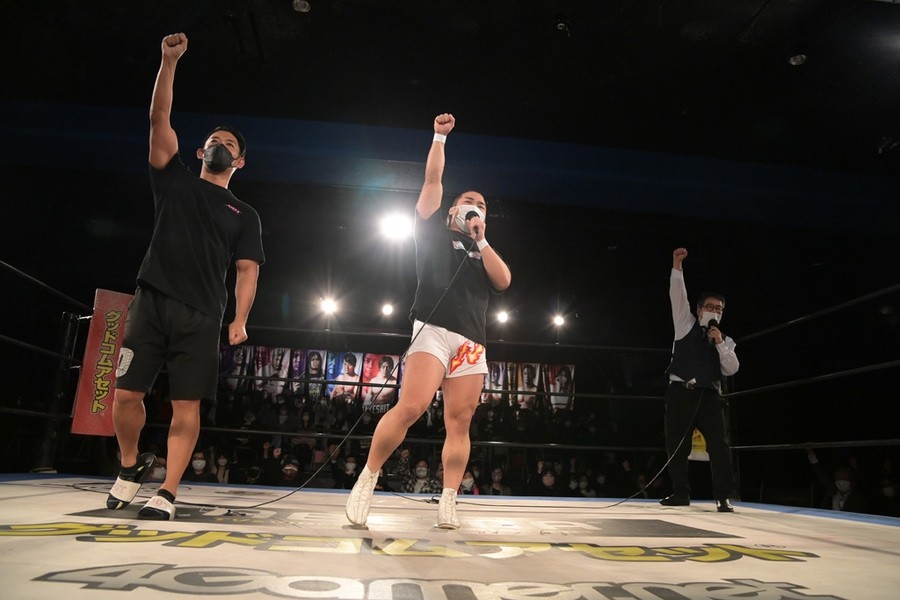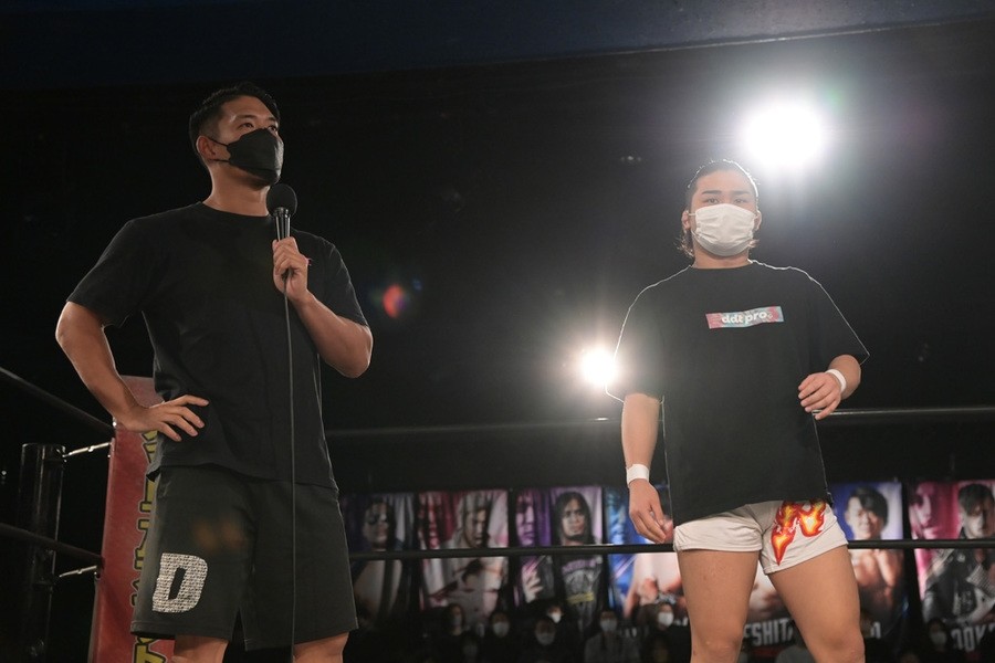 続けて、遠藤は「竹下から3カウントを取りました。でも、まだやり返したとは思ってないから。今日は俺一人の勝ちじゃなく、一緒に組んでくれた秋山さん、岡田、BURNINGの高鹿(祐也)、全員で取った勝ちだと思ってます。両国まで残り少ないですけど、秋山さん、岡田、高鹿、DDTファンの皆さん、俺に力を貸してください。必ず借りた分はお返しします。俺がチャンピオンになって、皆さんに新しい景色を見せます」と締めくくった。