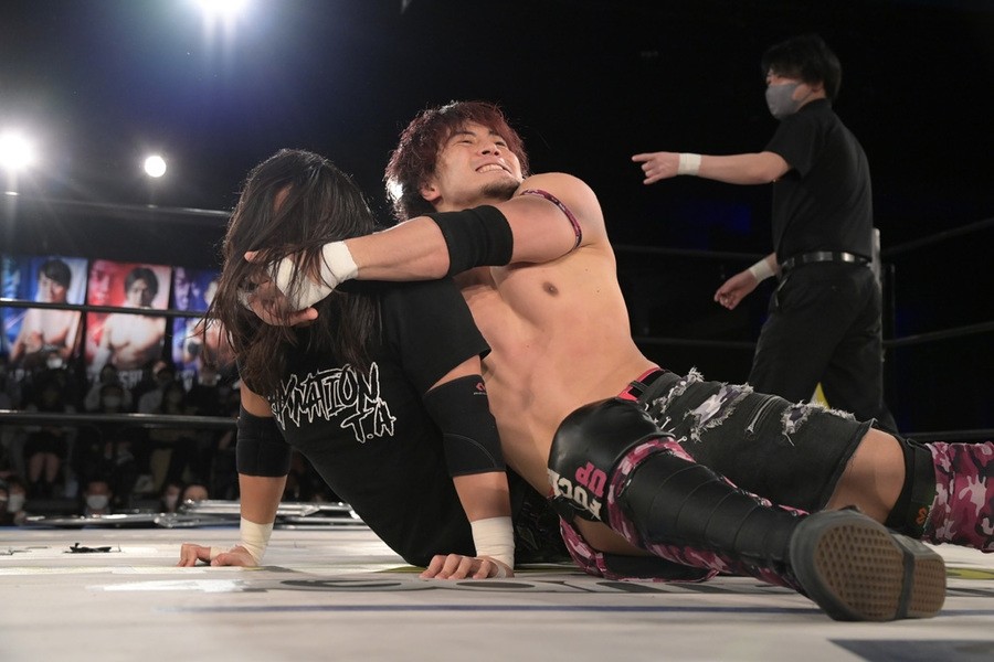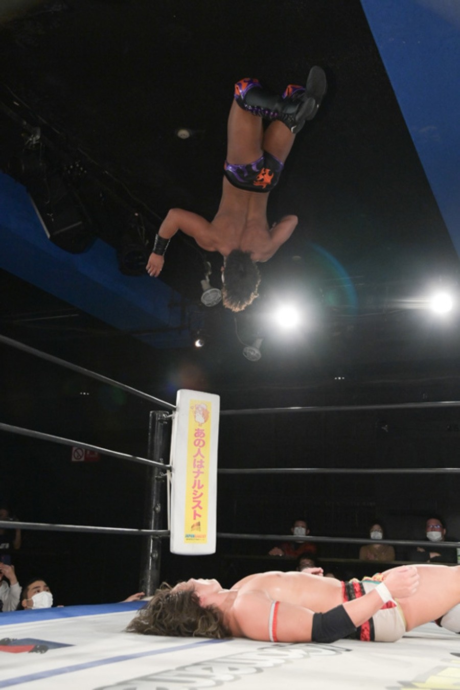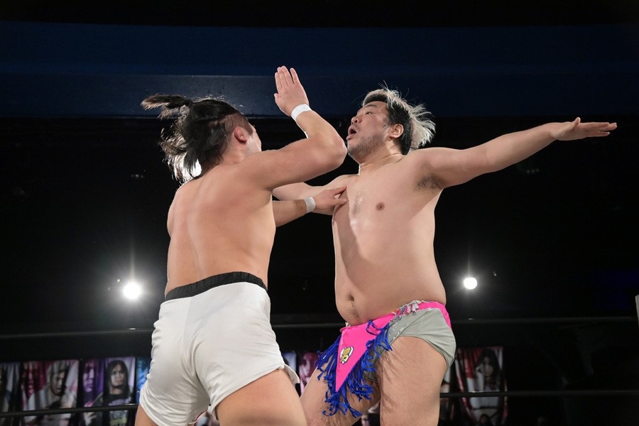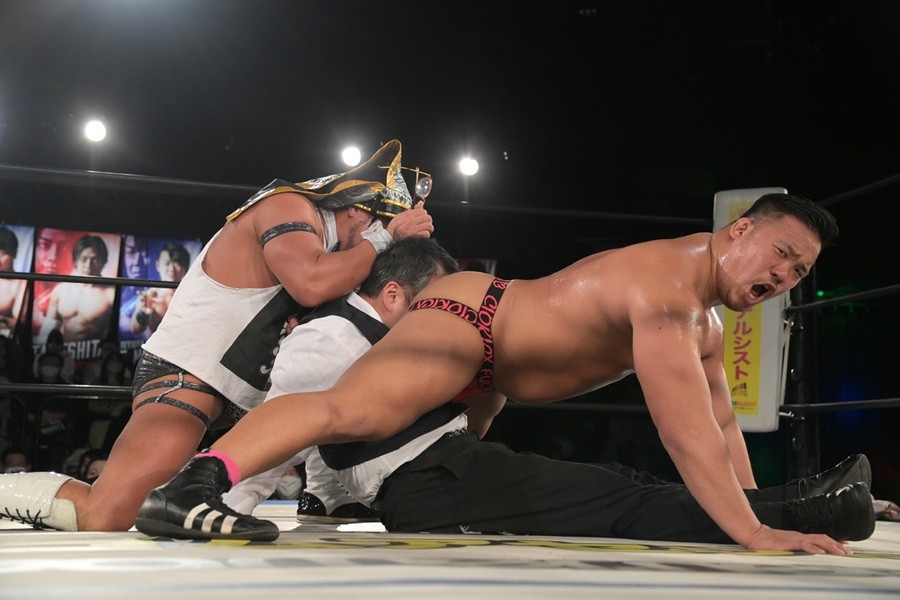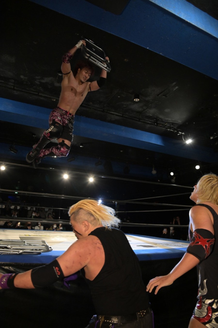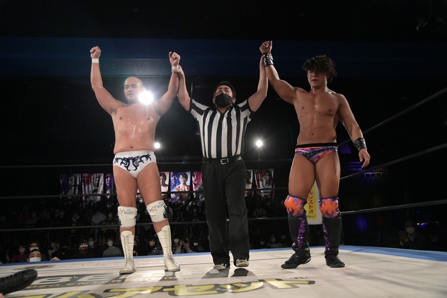 それでも、圧倒的に不利な状況で踏ん張った竹下はジャンピング・ニーからザーヒーをさく裂させ、岡田からピンフォールを奪取。