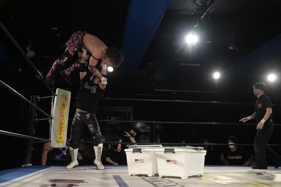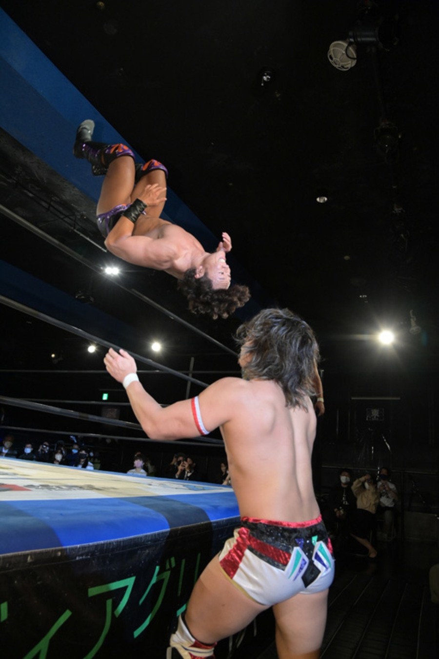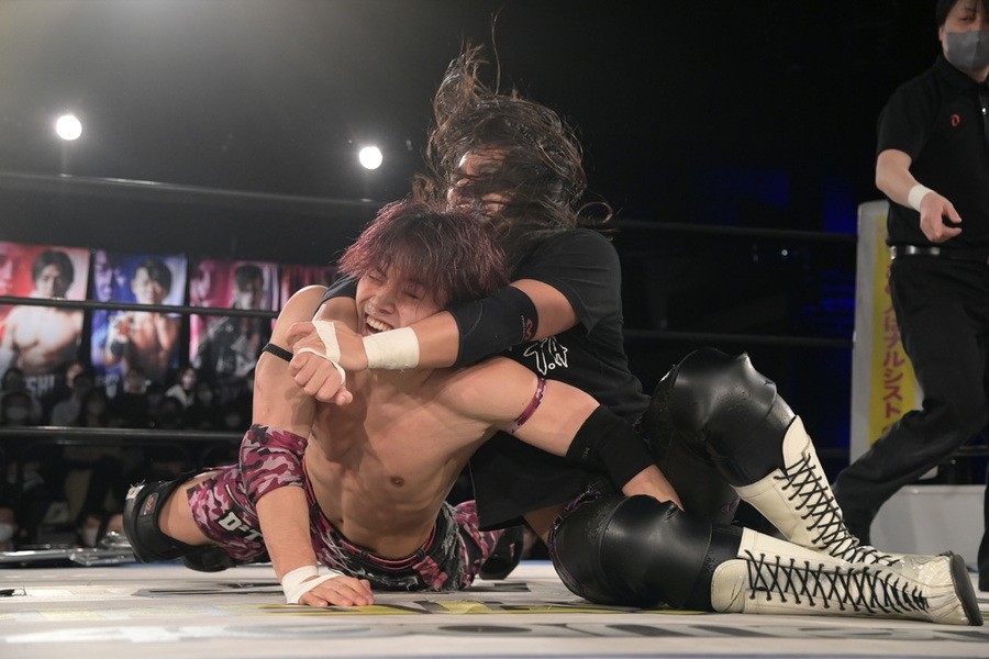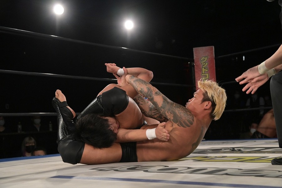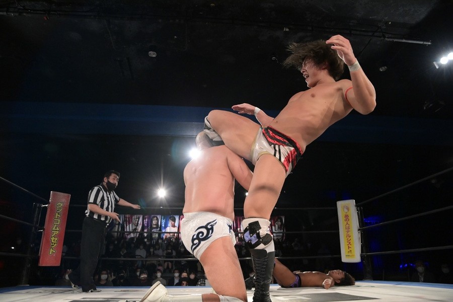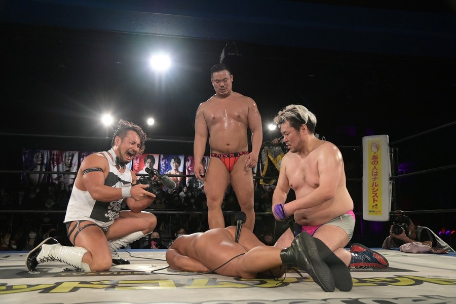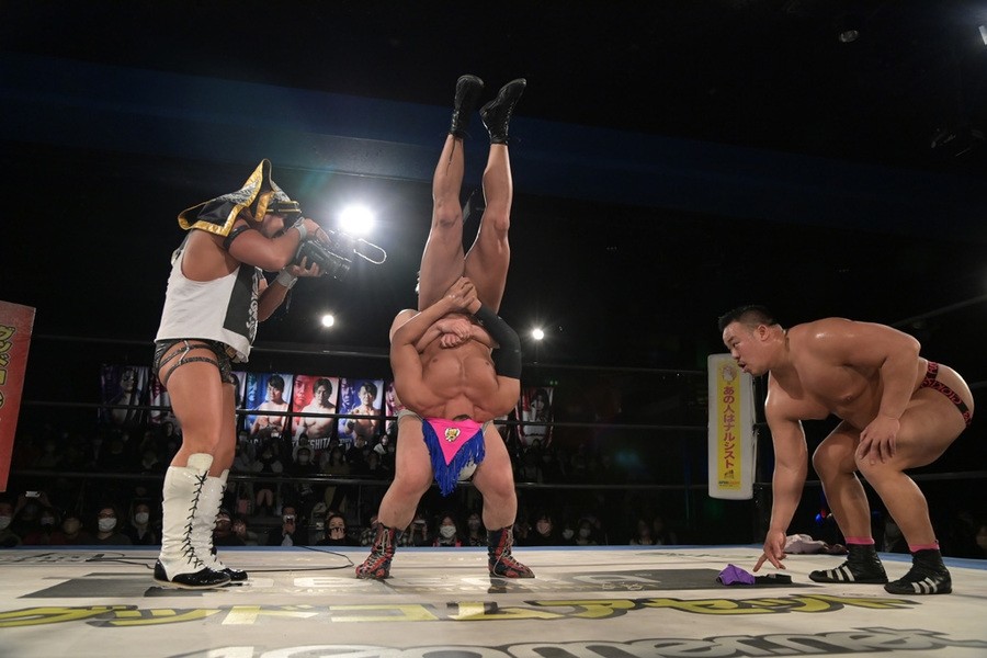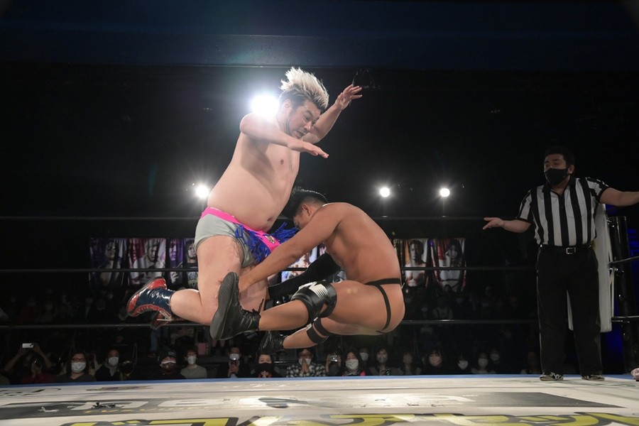 それでも、圧倒的に不利な状況で踏ん張った竹下はジャンピング・ニーからザーヒーをさく裂させ、岡田からピンフォールを奪取。