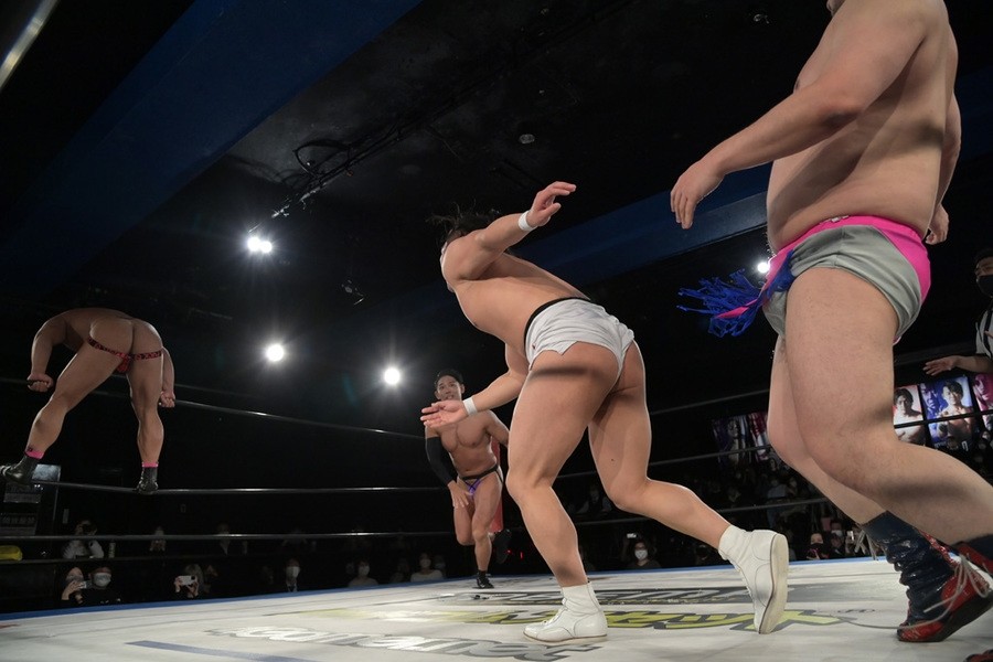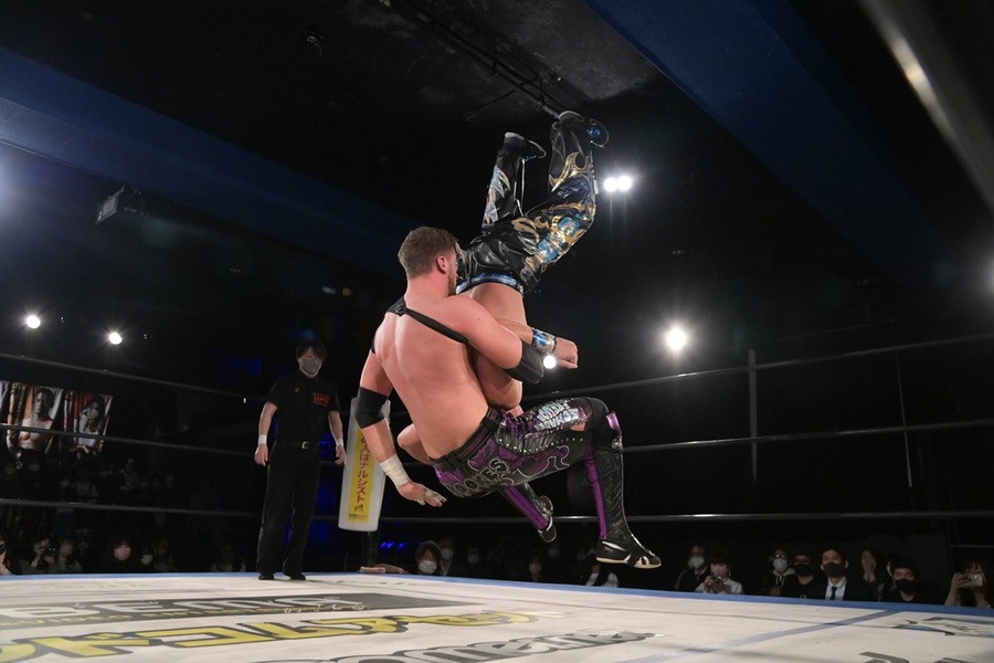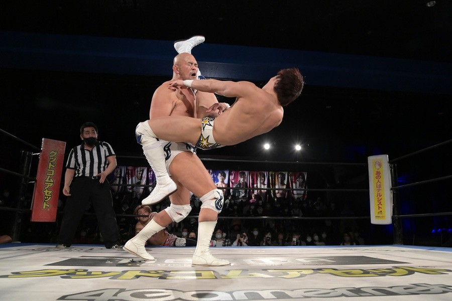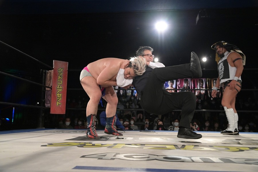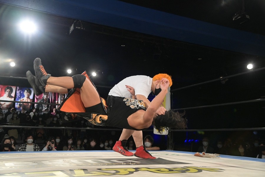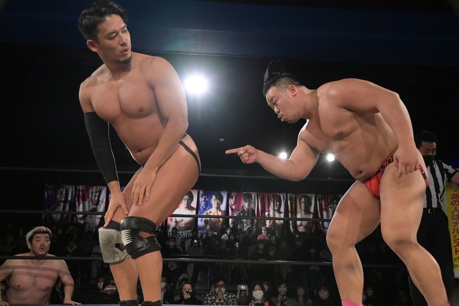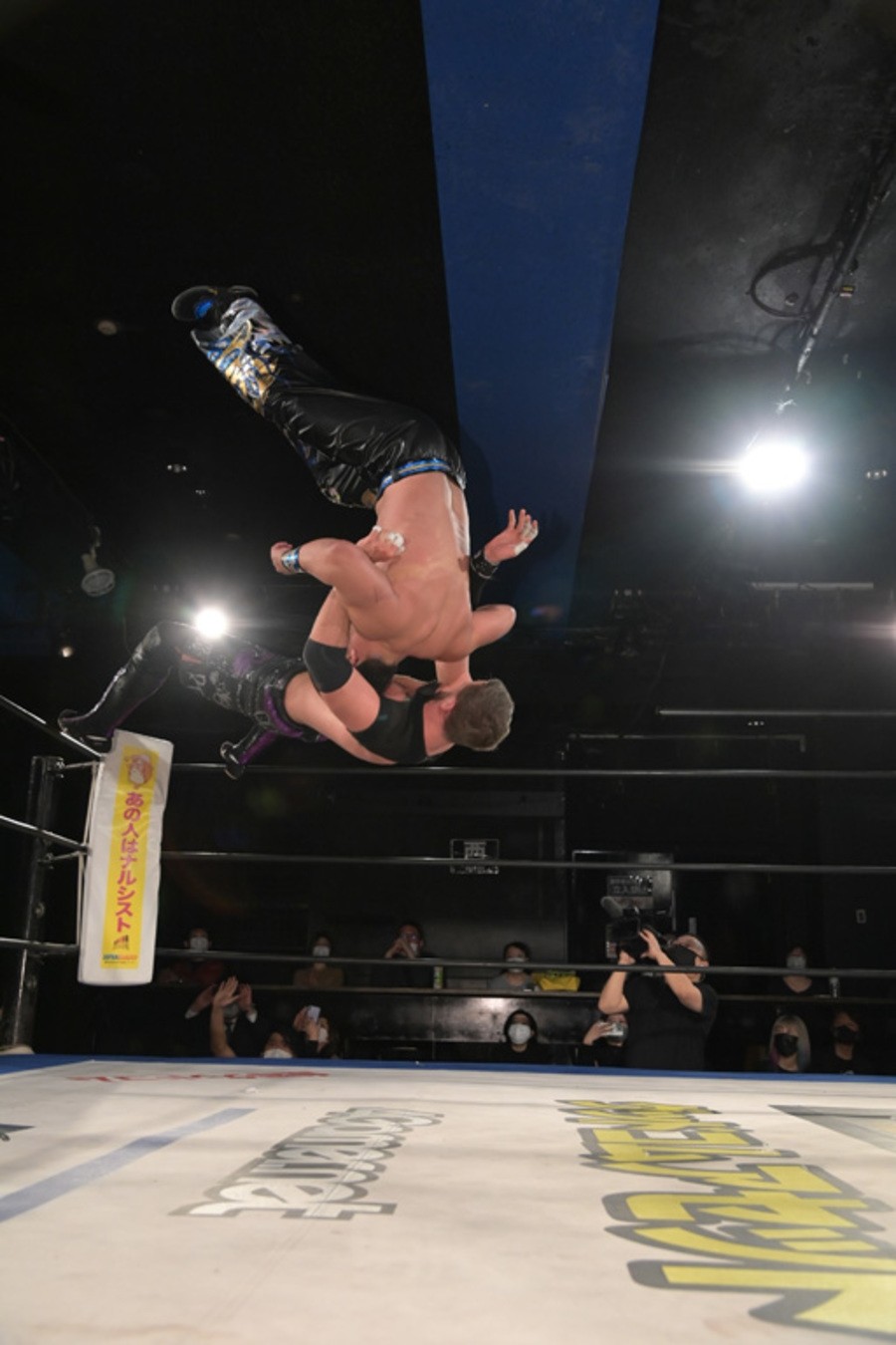 それでも、圧倒的に不利な状況で踏ん張った竹下はジャンピング・ニーからザーヒーをさく裂させ、岡田からピンフォールを奪取。