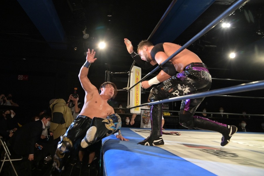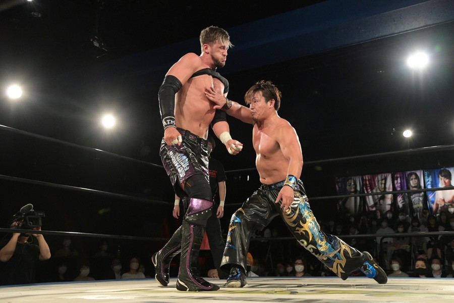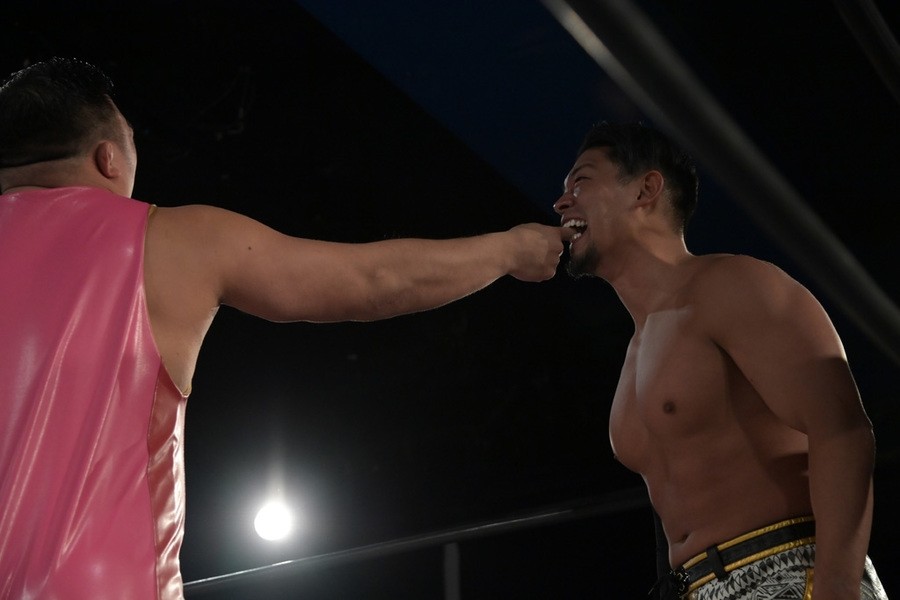 遠藤は「竹下、後楽園だけじゃない。今までのオマエとの試合、負けた試合、全部忘れてないから。初めてシングルマッチやった試合、タイトルマッチ挑戦した試合、2019年の大田区。今までの俺の10年間、全部両国でオマエにぶつけてやる。今のこの光景が、両国国技館のメインイベント後の光景だ」とマイク。