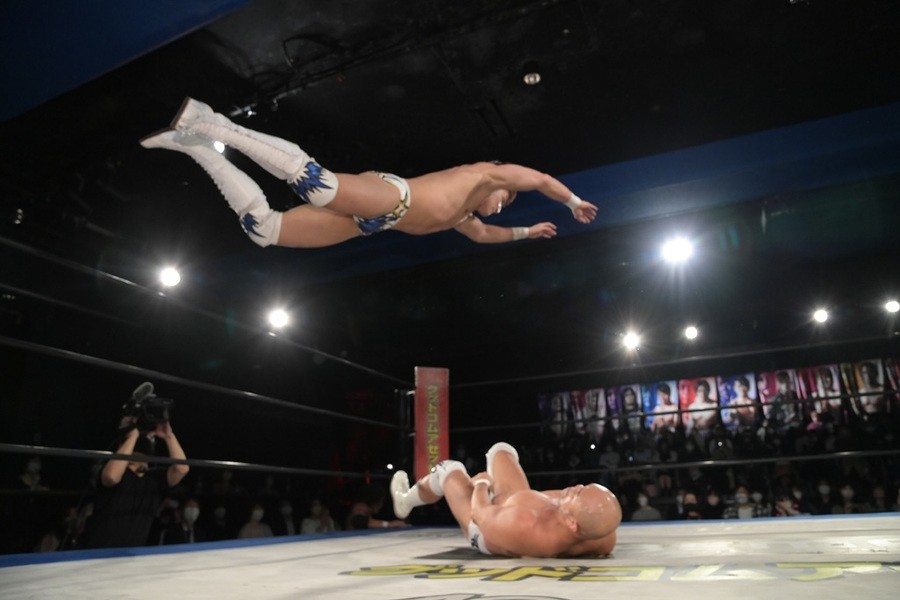 試合は一進一退の攻防となったが、10分過ぎ、HARASHIMAが串刺し式の蒼魔刀をたたき込むも、セコンドの高梨が巧妙にクリスの足をロープに掛けて阻止。HARASHIMAはスワンダイブ・ボディプレスを敢行も、クリスは剣山で回避。HARASHIMAが走り込んでの蒼魔刀を狙うも、高梨が足を引っ張って、またまた阻止。すかさずクリスはプレイングマンティスボムを繰り出して、3カウントを奪った。