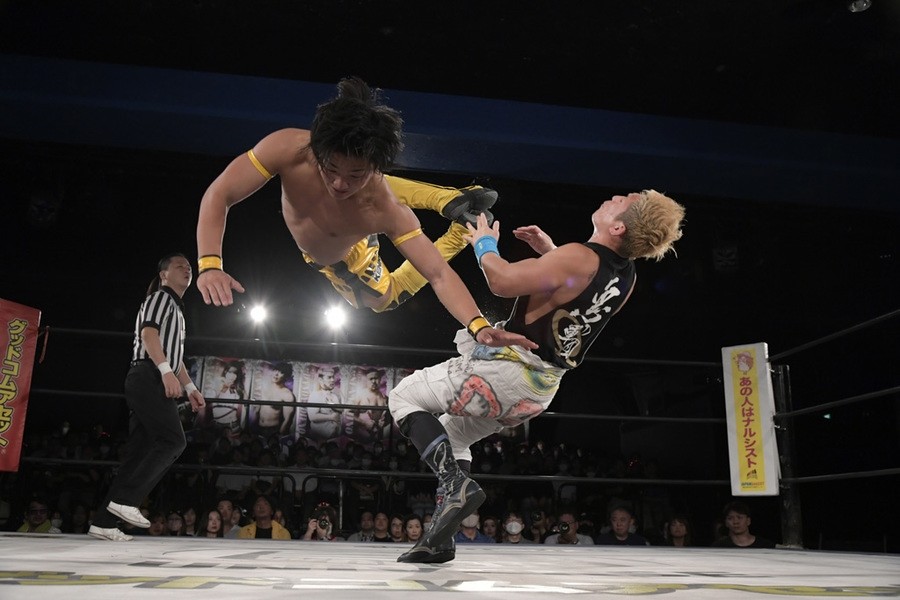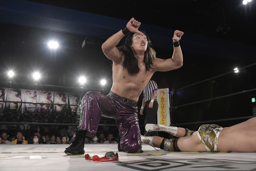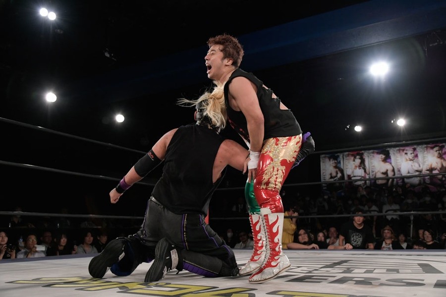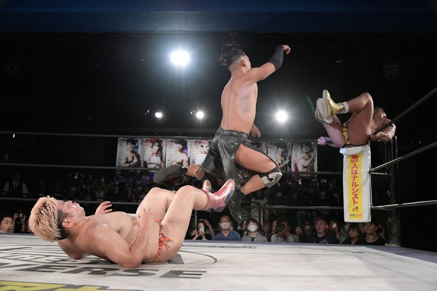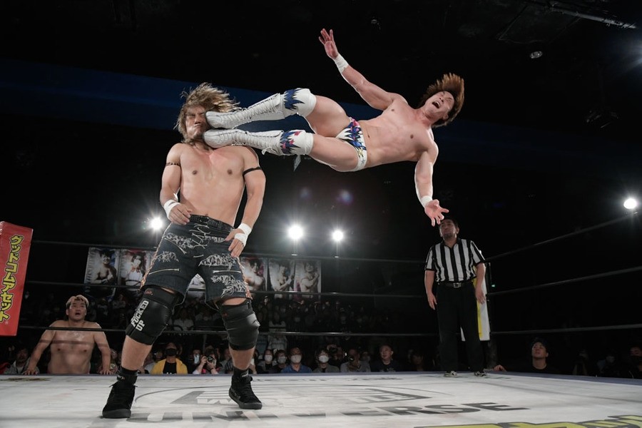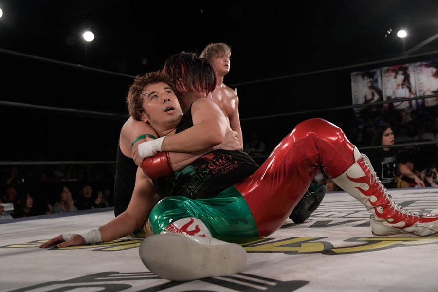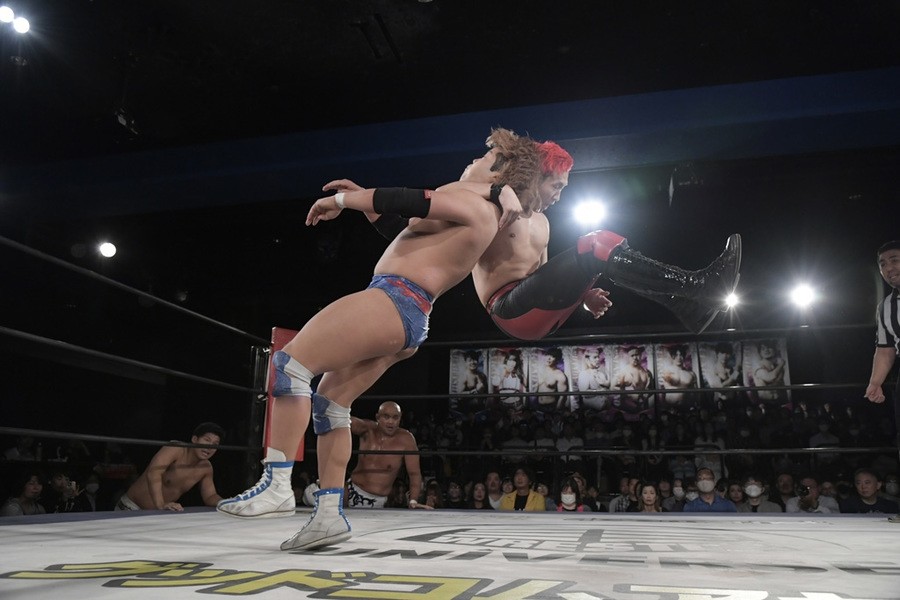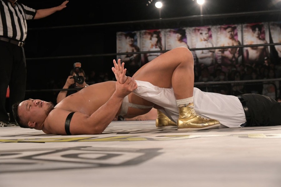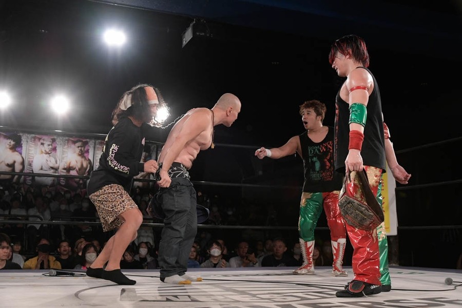 序盤、小柄な翔太は王者組のパワーで劣勢に回ることも多かったが、KANONに起死回生のスイングDDTを決めると、トペを発射。高尾が藤田に雪崩式フランケンシュタイナー、続けて翔太がフロッグスプラッシュを見舞うも、セコンドの佐々木大輔がレフェリーの足を引っ張って阻止。藤田は急所打ちからSAYONARAを繰り出すも、高尾がカット。最後は一瞬の隙を突いた翔太が藤田を雁之助クラッチで丸め込んで3カウントを奪った。