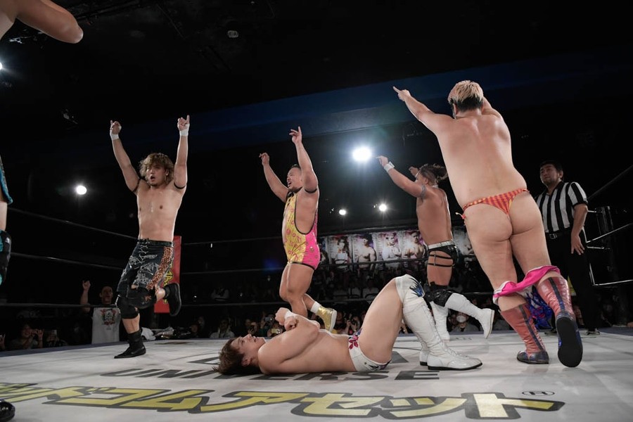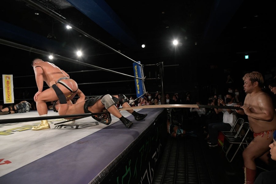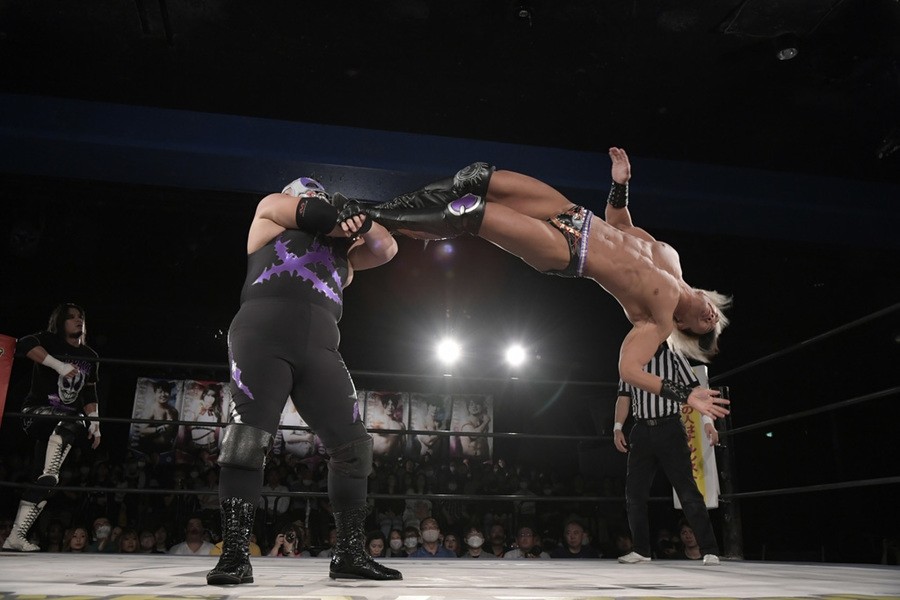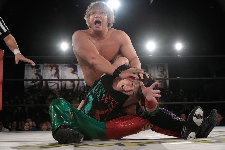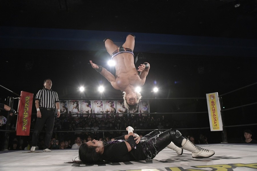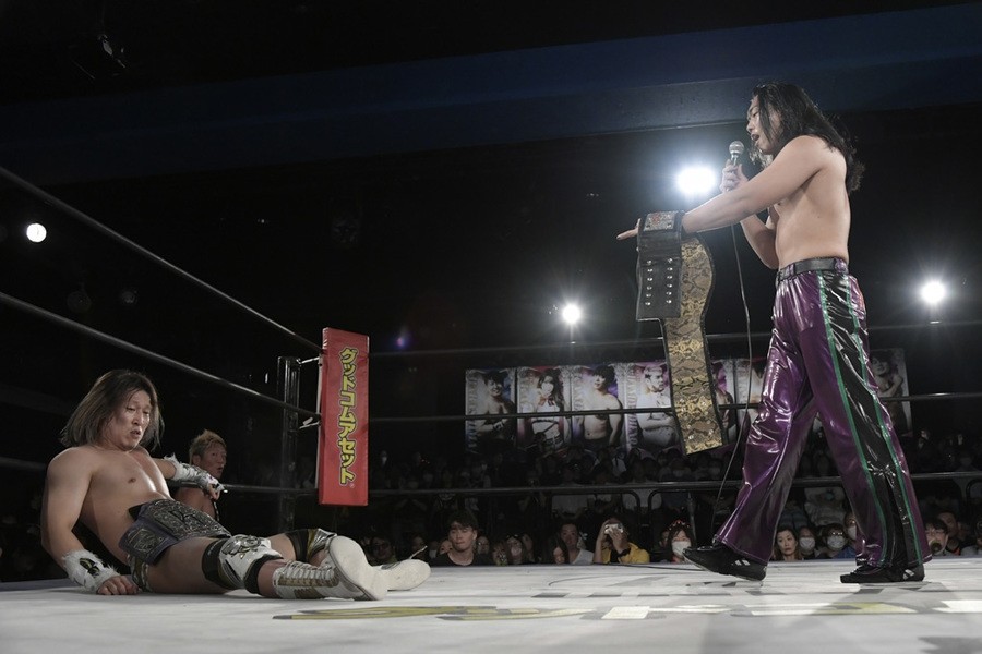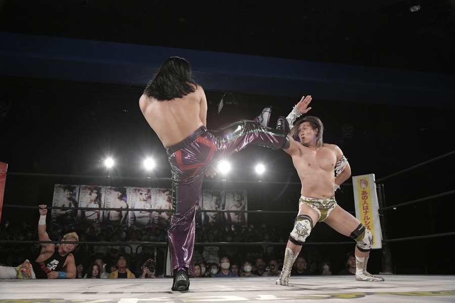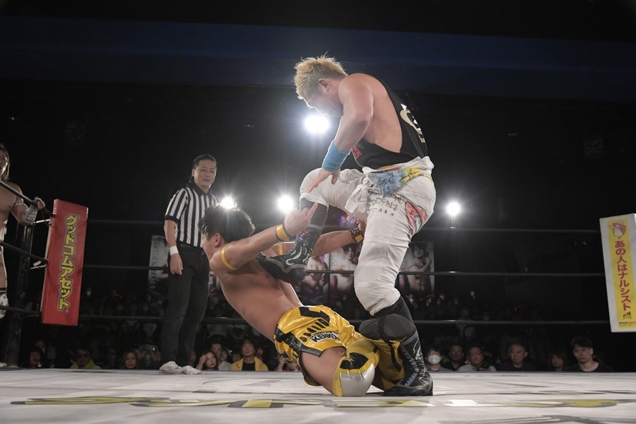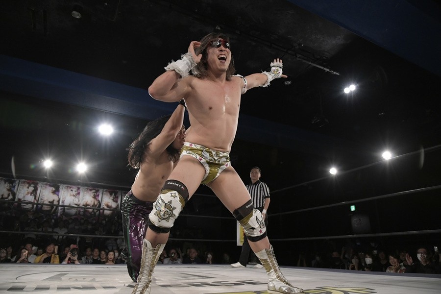 序盤、小柄な翔太は王者組のパワーで劣勢に回ることも多かったが、KANONに起死回生のスイングDDTを決めると、トペを発射。高尾が藤田に雪崩式フランケンシュタイナー、続けて翔太がフロッグスプラッシュを見舞うも、セコンドの佐々木大輔がレフェリーの足を引っ張って阻止。藤田は急所打ちからSAYONARAを繰り出すも、高尾がカット。最後は一瞬の隙を突いた翔太が藤田を雁之助クラッチで丸め込んで3カウントを奪った。