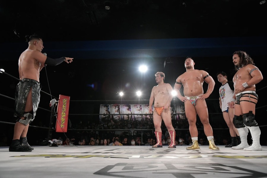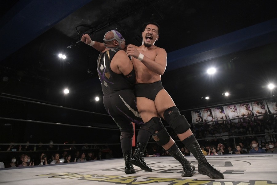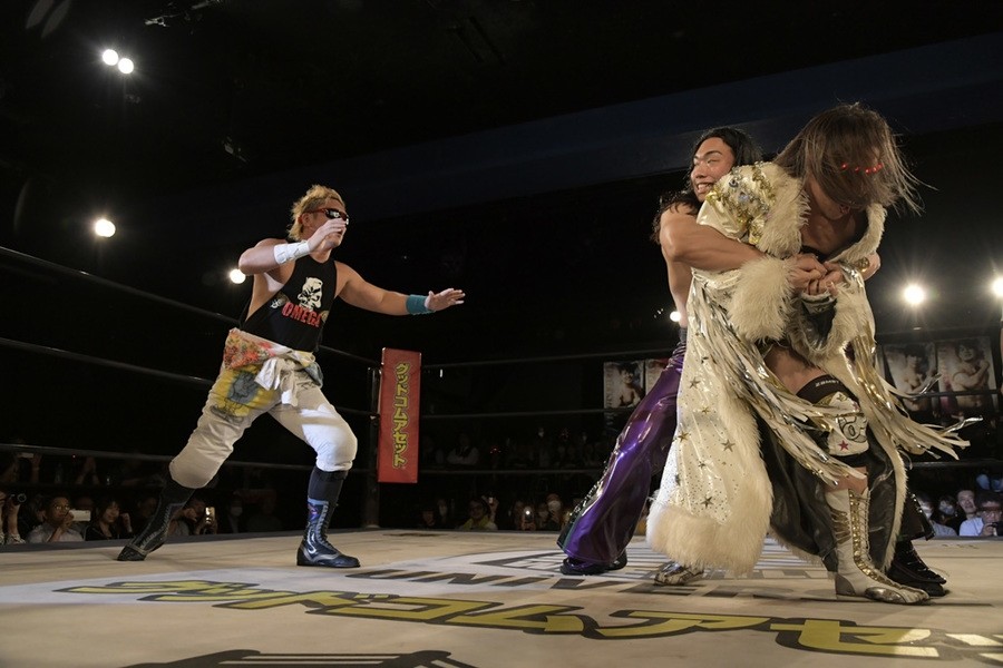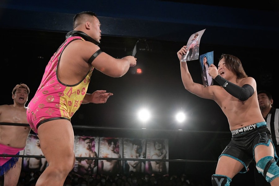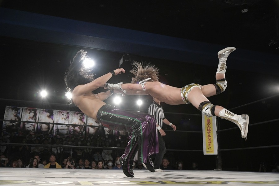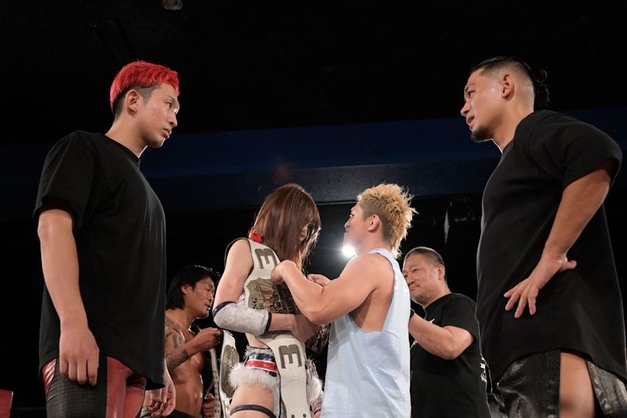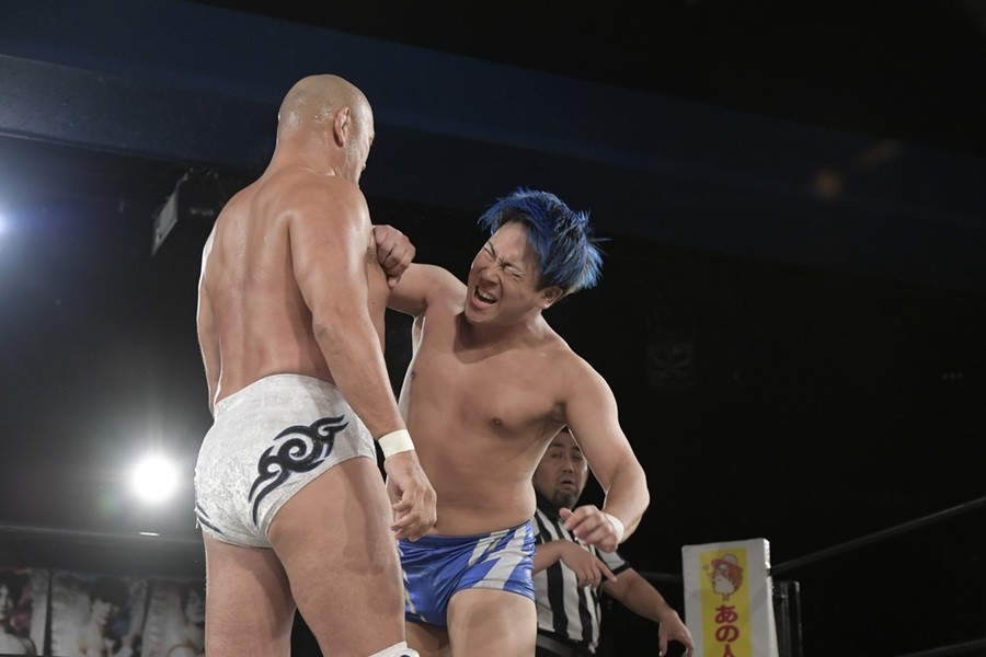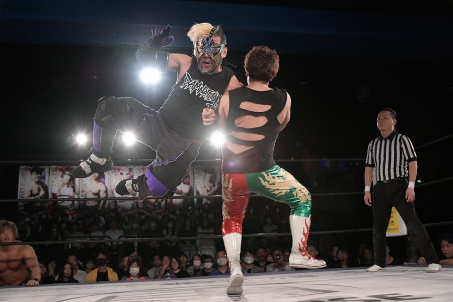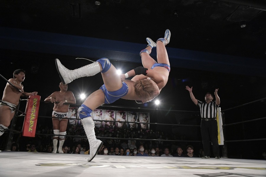 序盤、小柄な翔太は王者組のパワーで劣勢に回ることも多かったが、KANONに起死回生のスイングDDTを決めると、トペを発射。高尾が藤田に雪崩式フランケンシュタイナー、続けて翔太がフロッグスプラッシュを見舞うも、セコンドの佐々木大輔がレフェリーの足を引っ張って阻止。藤田は急所打ちからSAYONARAを繰り出すも、高尾がカット。最後は一瞬の隙を突いた翔太が藤田を雁之助クラッチで丸め込んで3カウントを奪った。