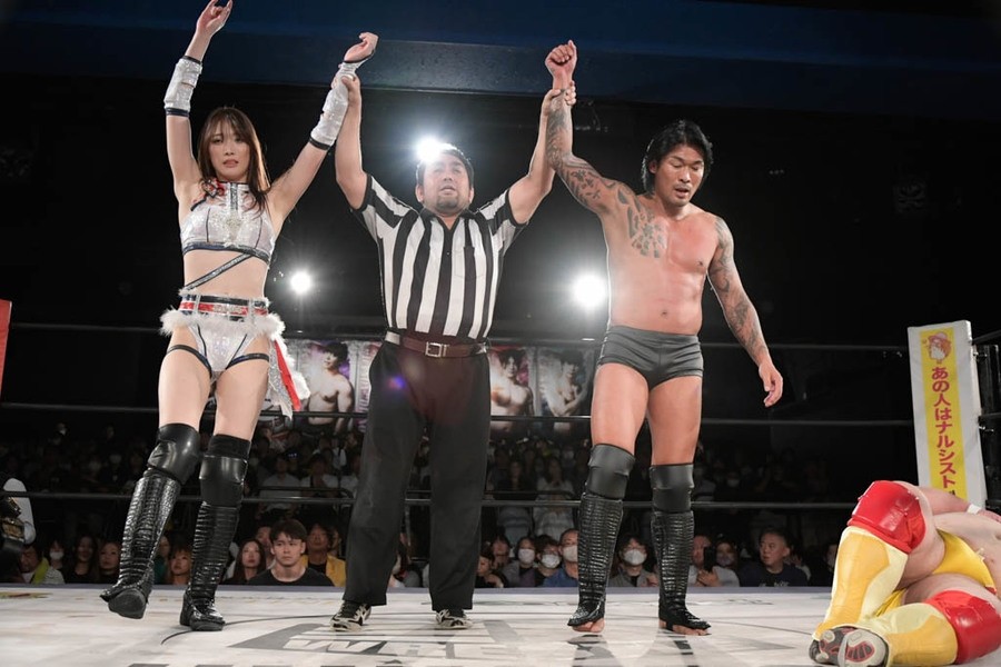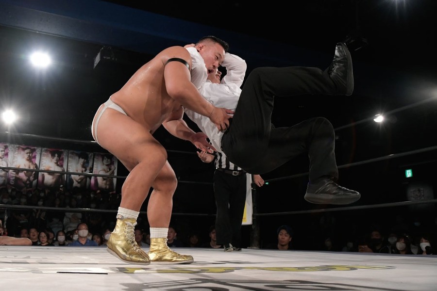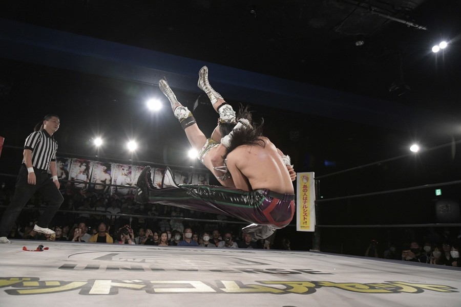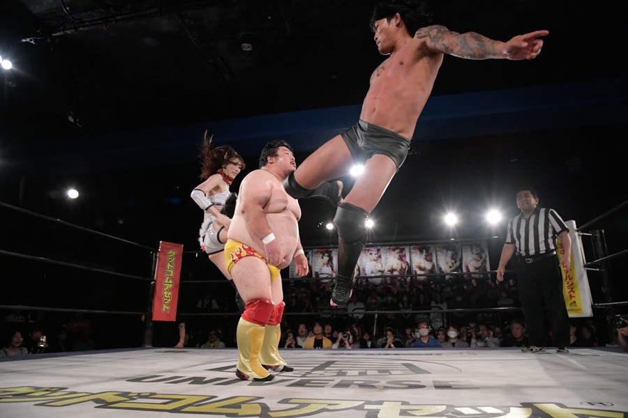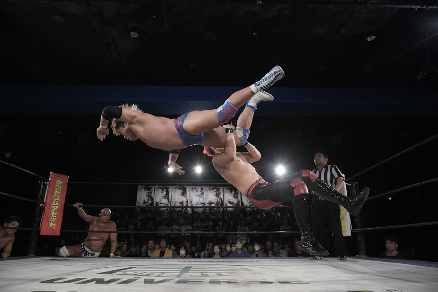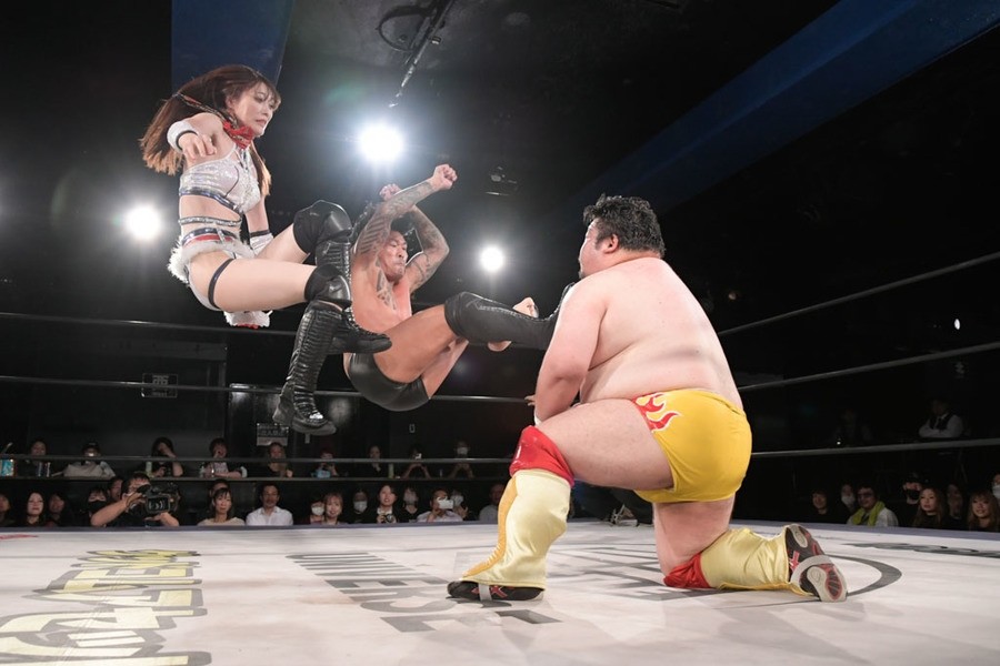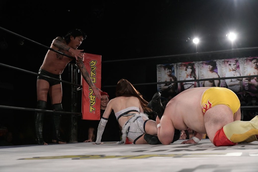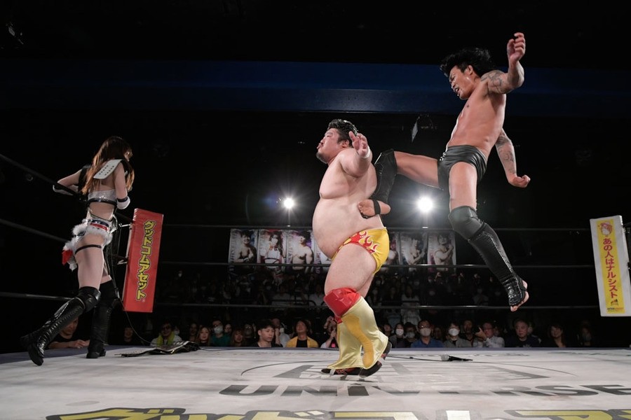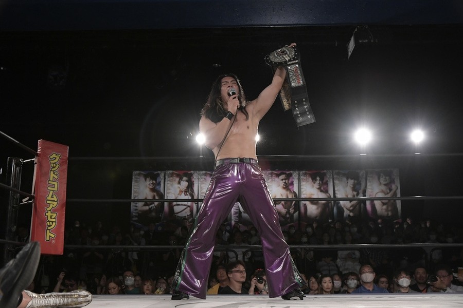 序盤、小柄な翔太は王者組のパワーで劣勢に回ることも多かったが、KANONに起死回生のスイングDDTを決めると、トペを発射。高尾が藤田に雪崩式フランケンシュタイナー、続けて翔太がフロッグスプラッシュを見舞うも、セコンドの佐々木大輔がレフェリーの足を引っ張って阻止。藤田は急所打ちからSAYONARAを繰り出すも、高尾がカット。最後は一瞬の隙を突いた翔太が藤田を雁之助クラッチで丸め込んで3カウントを奪った。