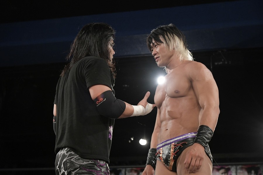 バックステージで翔太は「18歳で出会って、お互い別の道を歩んで、プロレスラーになったけど、DDTのリングで、KO-Dと名の付くタッグチャンピオンになりました。学生プロレスのことを思うと感慨深い。両国でチャンピオンとしてタイトルマッチをやる切符つかんだ。アントーニオ本多、高梨将弘。俺たちからしたら、DDTのスペシャルなドラマチックなレスラーだ。あなたたちとタイトルマッチができる。こんな光栄なことはない」、高尾は「ガンプロで主にやっていて、この2人でDDTのベルトを獲れるなんて、ドラマチックでしょ」と満面の笑み。