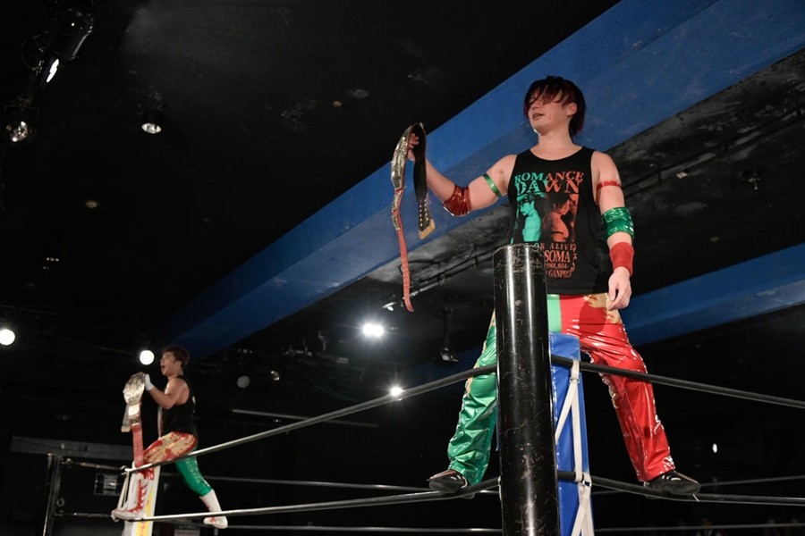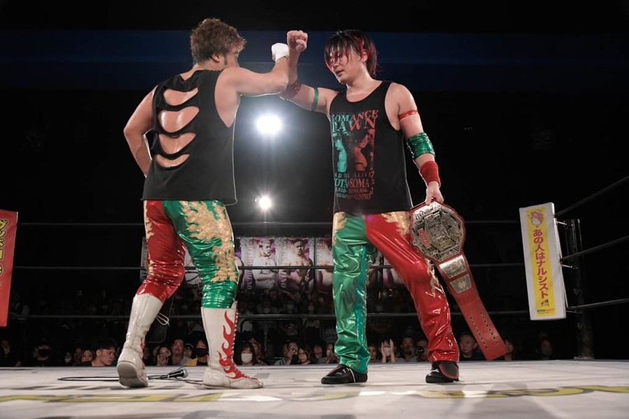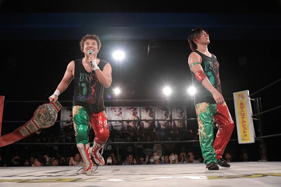 翔太は「18歳で学生プロレス時代に出会って、お互いプロレスラーになるかどうかも分からず、新宿の畳の柔道場で受け身を習いながら、巡り巡ってDDTのタッグチャンピオンになるなんて。思い描いていたよりも上をいく現実が、今俺らの目の前で起こるなんて、随分とロマンがある出来事もあるもんだな」と歓喜。