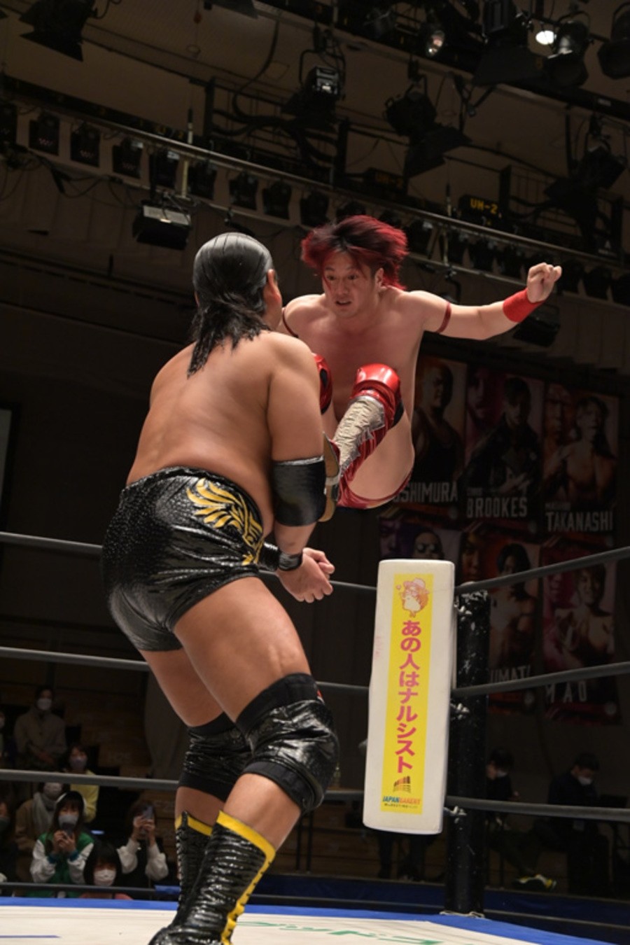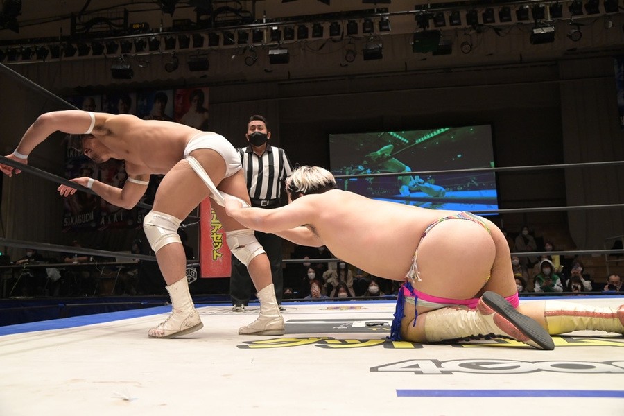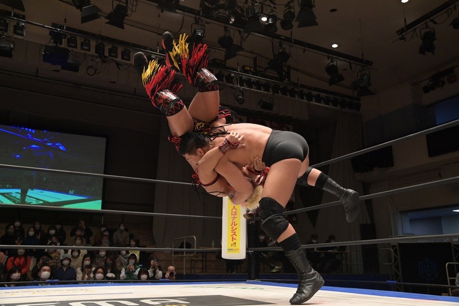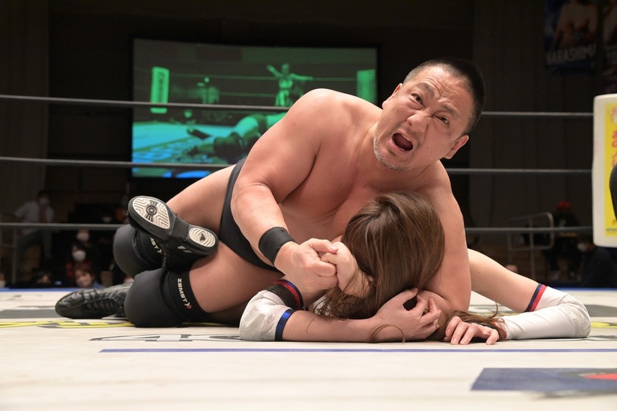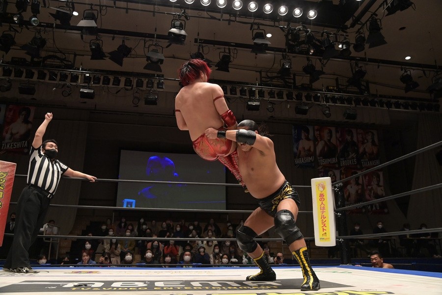 この日、赤井は坂口征夫と組み、高木三四郎&雪妃組と対戦。赤井と雪妃はビッグブーツの応酬、張り合いでバチバチの戦いを展開。さらに坂口にも強烈な張り手を浴びせていった雪妃は、赤井の頭部にキックをたたき込むと、トップロープからスノウトーンボムを見舞い3カウントを奪った。これまでのタッグマッチでの前哨対決では、1月22日の横浜ラジアントホール大会で赤井が雪妃から直接勝利を挙げていたが、これでイーブンとなった。