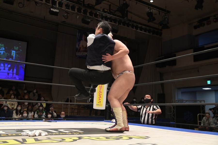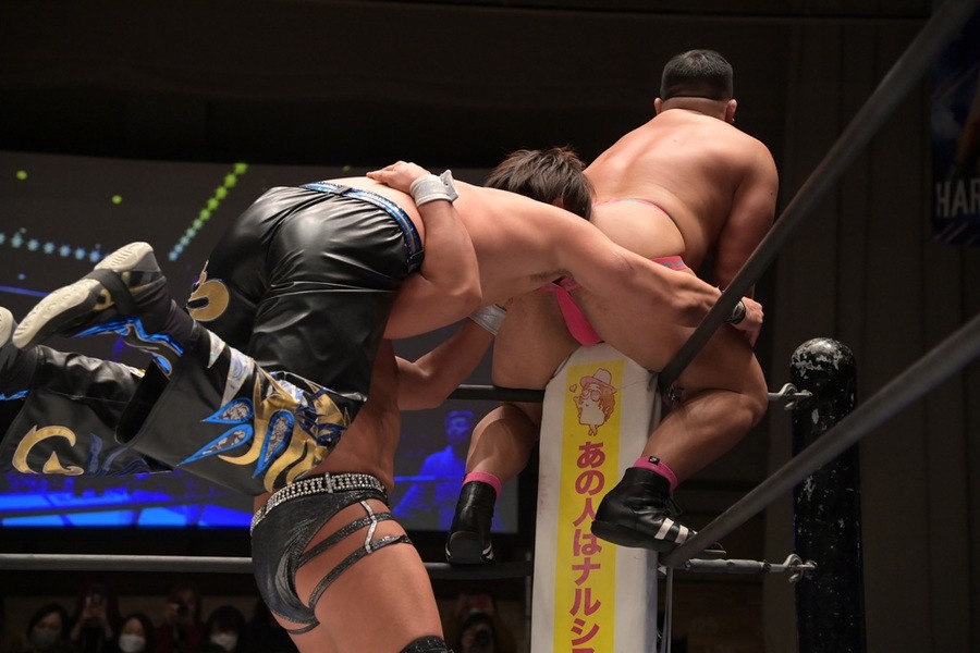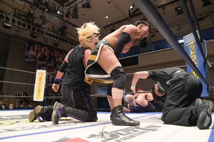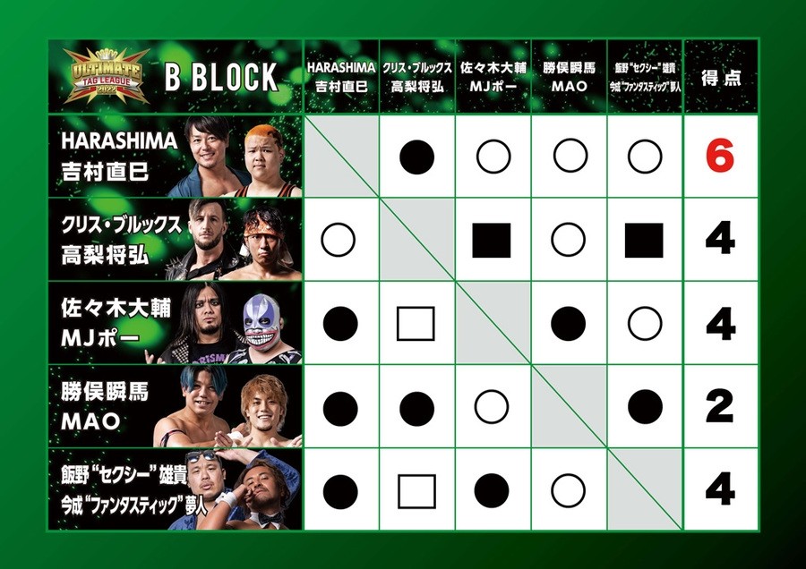 BブロックのHARASHIMA組はフェロモンズ(飯野“セクシー”雄貴、今成“ファンタスティック”夢人)と勝ち点4同士で直接対決。フェロモンズのお下劣殺法に耐えたHARASHIMAが飯野をビクトリーロールで丸め込んで3カウントを奪い、勝ち点を6に伸ばし決勝に進出。