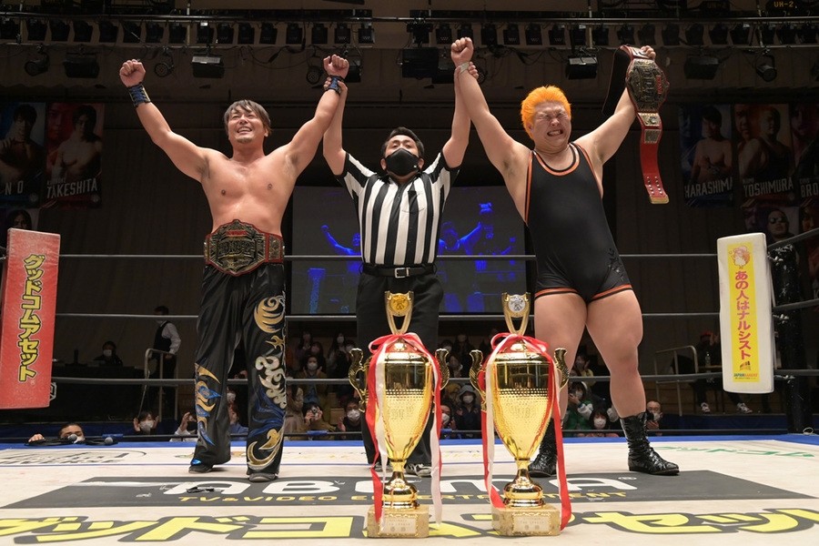 バックステージでHARASHIMAは「全勝優勝できなかったけど、両国でリベンジする。なかなか試合を万全な体調で臨むのが難しかったなか、乗り越えて来れたのは自信になります。僕らは最強で最高のタッグチームということを証明できた」と、吉村は「自分が返上すると言って、HARASHIMAさんは許してくれたけど。このご時世もあって、全部通しきれなかった人もいるなか、こうやって勝ち抜いて優勝して有言実行できた。ここがゴールじゃないんで、CDKを倒して、より一層DDTで確立したタッグチームになる」とともに会心の笑みを見せた。