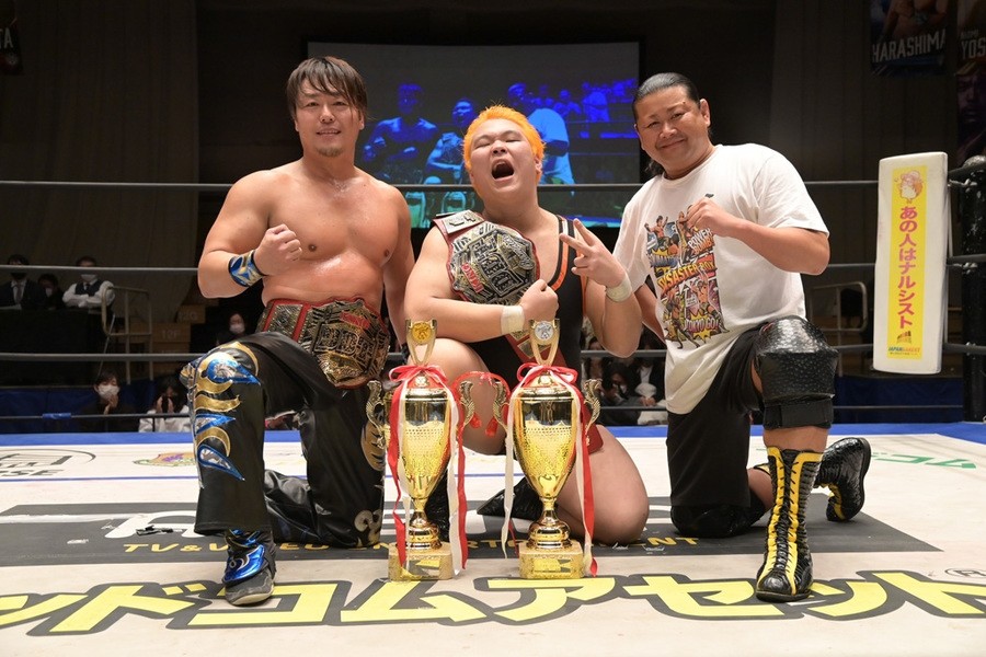 HARASHIMA組と竹下組による優勝決定戦は一進一退の白熱の攻防が続き、元ノーチラスのパートナー同士である吉村と上野は激しいエルボーを打ち合うなど、意地の張り合いを見せた。一瞬の隙を突いたHARASHIMAが上野に蒼魔刀を見舞うと、吉村は投げ捨てパワーボム、ラリアット、そして変形正念場でたたきつけて上野から3カウントを奪取した。
