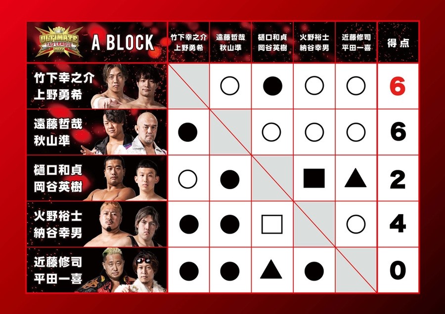 一方のAブロックでは最終戦を迎えた時点でBURNINGの遠藤哲哉&秋山準組が勝ち点6で単独トップに立ち、4点の竹下組と最後の公式戦を戦った。BURNINGは引き分けでも決勝に上がれる状況だったが、遠藤が決めにいった宇宙一のバーニングスター・プレスを竹下に剣山で阻止されると流れが変わった。竹下がPlus Ultraを遠藤に決めるも、秋山がカット。しかし、竹下がザーヒーから再度Plus Ultraで絞め上げると遠藤はたまらずギブアップ。これにより、両チームが6点で並んだが、直接対決で勝った竹下組が逆転で決勝にコマを進めた。