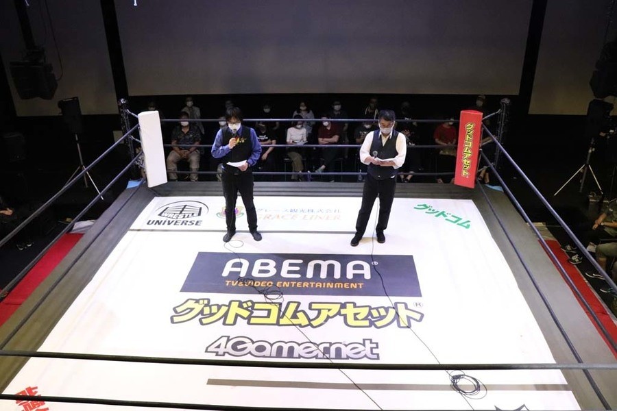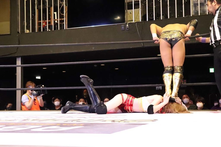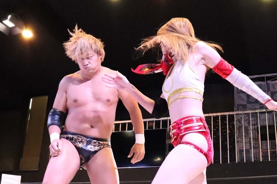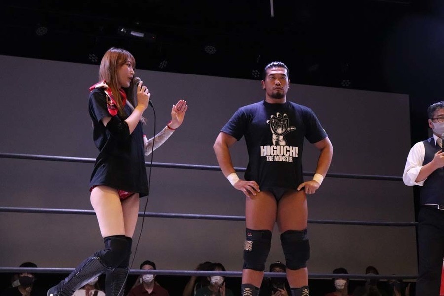 7ヵ月ぶりの名古屋大会のオープニングコールを任されたのは樋口&赤井。赤井「久々の名古屋ということで皆さんに会えることを楽しみにしていました。今日の自分たちの対戦相手は準烈の2人なんですけどTシャツが新しく出るとか言ってテンション上がってそうだったんですけど、ウチらがぶっ潰してやりましょうね」樋口「久々の名古屋開催でこうやって開催できることが嬉しいことであります。今日は皆さんに楽しんでいってもらいたいと思います」最後は2人で「DDT名古屋大会スタート!」と拳を突き上げた。