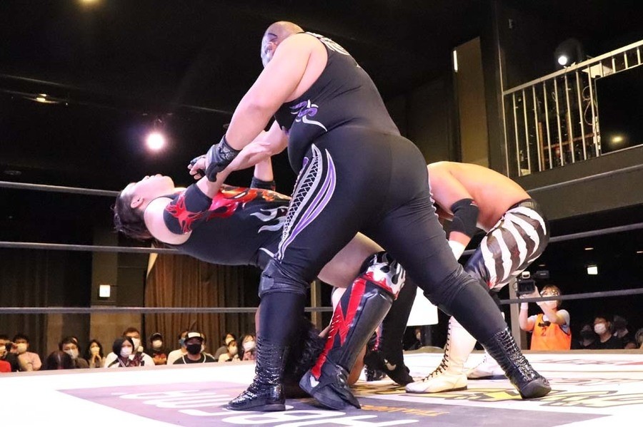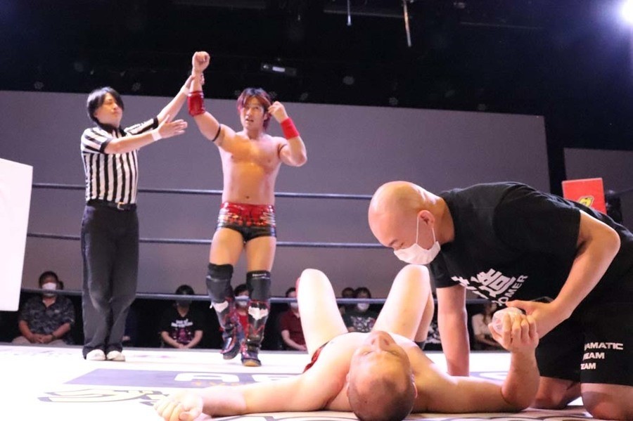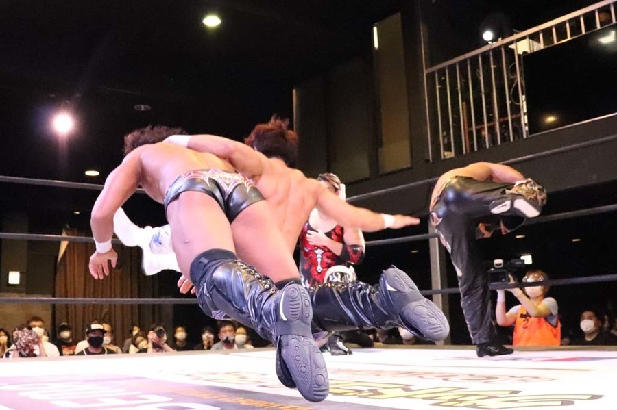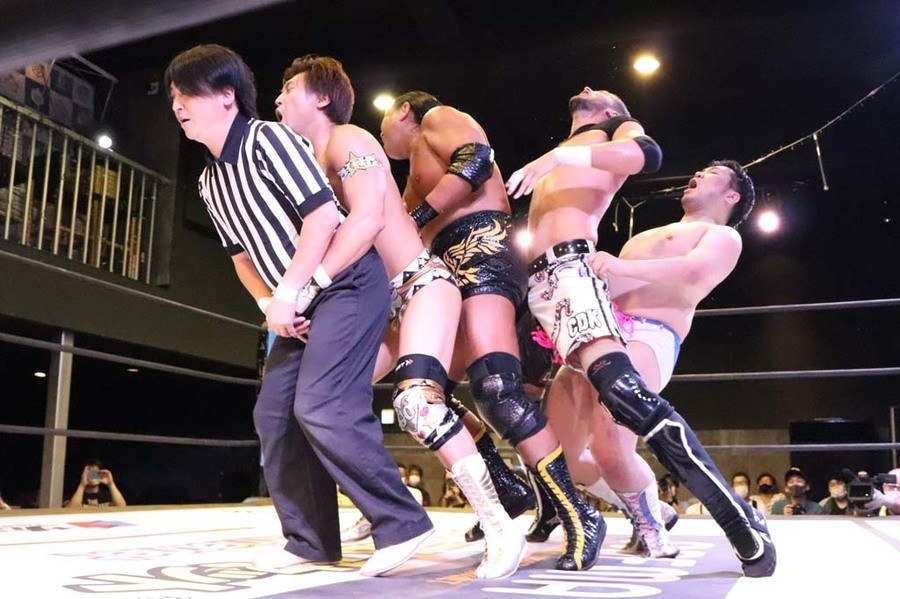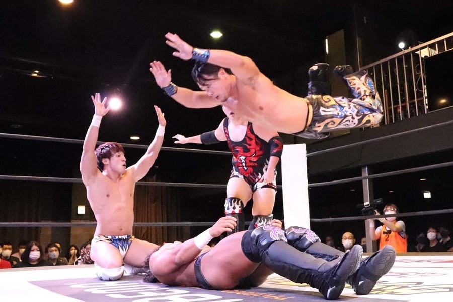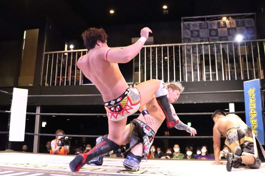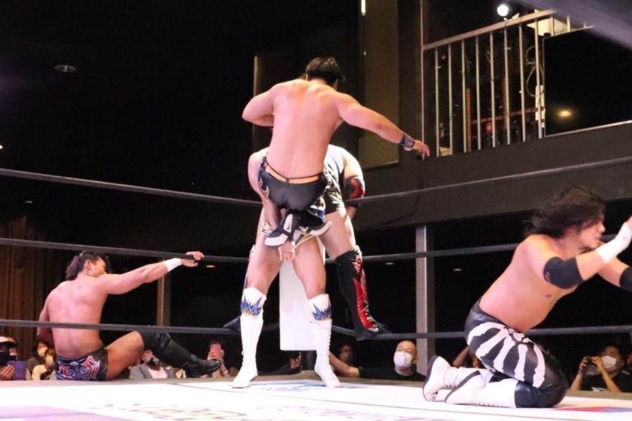 樋口が岡谷を子供扱い。逆水平、ショルダーアタック、ボディースラムと攻め立て赤井とタッチ。サッカーボールキックで続く赤井だが、ロープに向かって走ったところを渡瀬に蹴られて交替。替わった渡瀬がニードロップ。さらにコーナーに控える樋口にも攻撃し、岡谷とともに赤井を捕まえる。渡瀬のドロップキックを食らっても赤井は張り手で抵抗。張り返す渡瀬にソバットを見舞った赤井がミドルキックから両ヒザ式のJKを決めてようやくピンチを抜け出すと、替わった樋口が一気呵成の攻め。渡瀬もコルバタからドロップキックを放って岡谷とタッチ。ネックブリーカーからさらに渡瀬のドロップキックとブルドッキング・ヘッドロックの合体技。ノーザンライトSHも渡瀬のジャンピングハイのアシストから決めてみせるも赤井がカット。樋口がアバランシュホールド。これは渡瀬がカット。樋口の逆水平+赤井のミドルから赤井が渡瀬をビッグブーツで場外送りにするやエプロンPK。リング内では丸め込みで粘る岡谷をショートレンジラリアットで黙らせた樋口が変形の逆エビで捕まえてギブアップを奪った。