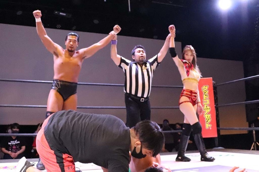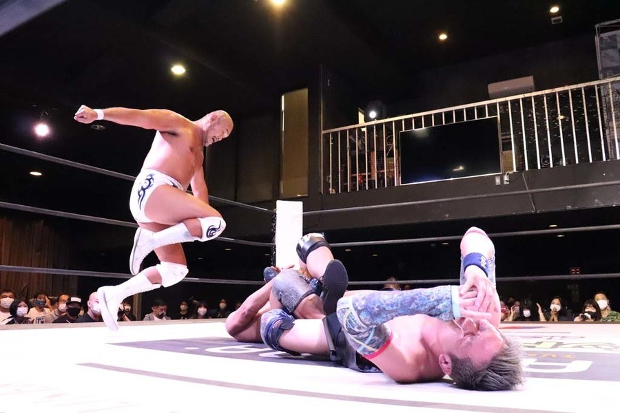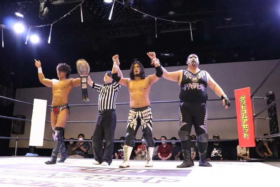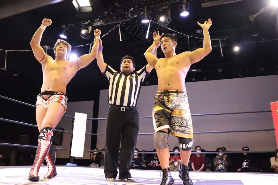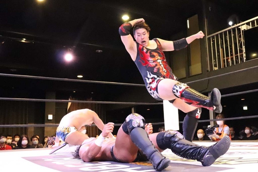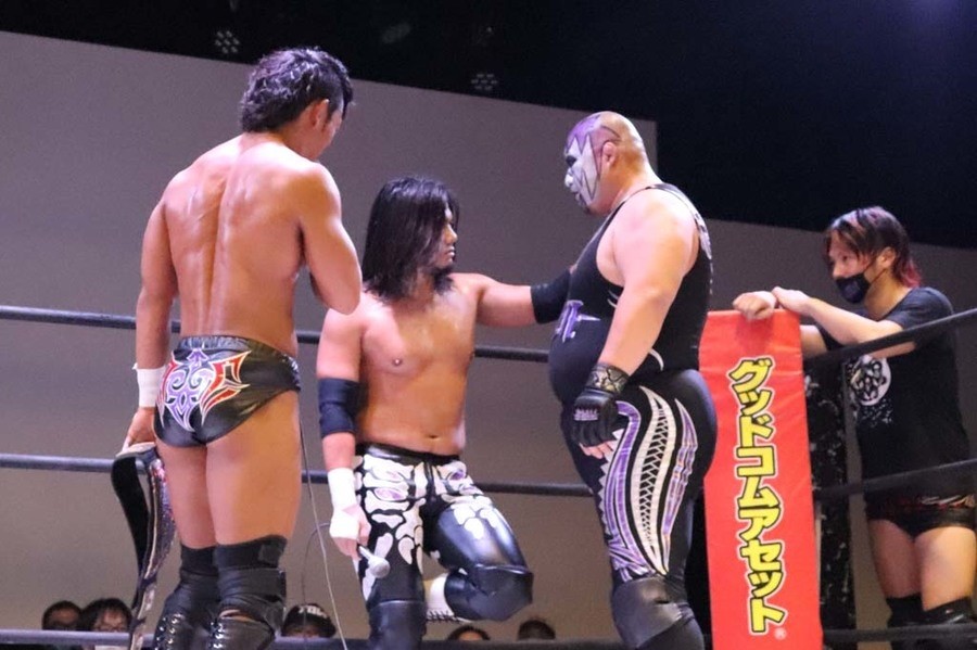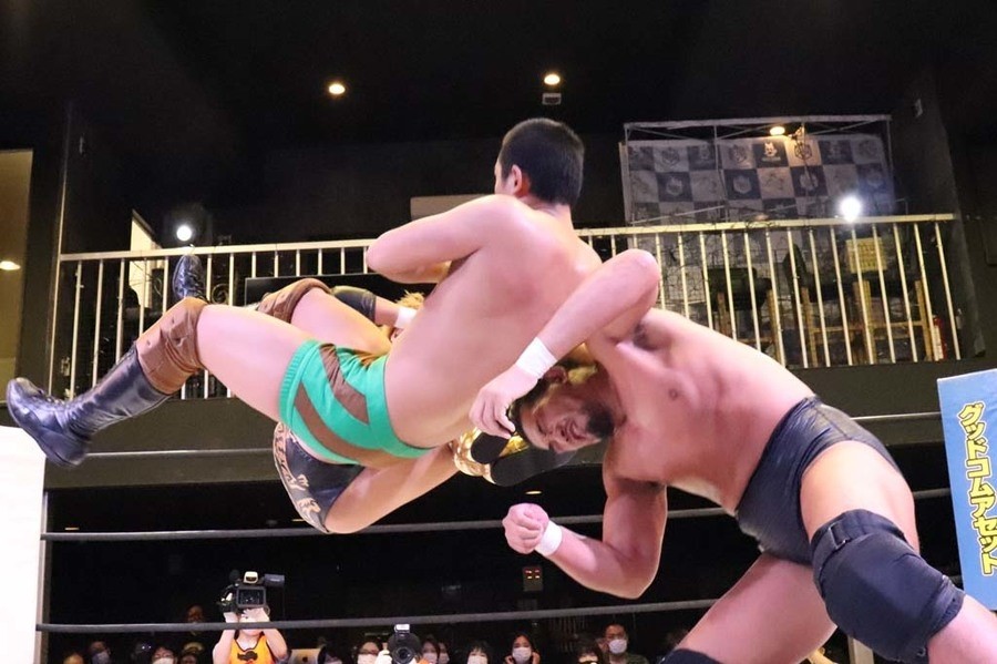 樋口が岡谷を子供扱い。逆水平、ショルダーアタック、ボディースラムと攻め立て赤井とタッチ。サッカーボールキックで続く赤井だが、ロープに向かって走ったところを渡瀬に蹴られて交替。替わった渡瀬がニードロップ。さらにコーナーに控える樋口にも攻撃し、岡谷とともに赤井を捕まえる。渡瀬のドロップキックを食らっても赤井は張り手で抵抗。張り返す渡瀬にソバットを見舞った赤井がミドルキックから両ヒザ式のJKを決めてようやくピンチを抜け出すと、替わった樋口が一気呵成の攻め。渡瀬もコルバタからドロップキックを放って岡谷とタッチ。ネックブリーカーからさらに渡瀬のドロップキックとブルドッキング・ヘッドロックの合体技。ノーザンライトSHも渡瀬のジャンピングハイのアシストから決めてみせるも赤井がカット。樋口がアバランシュホールド。これは渡瀬がカット。樋口の逆水平+赤井のミドルから赤井が渡瀬をビッグブーツで場外送りにするやエプロンPK。リング内では丸め込みで粘る岡谷をショートレンジラリアットで黙らせた樋口が変形の逆エビで捕まえてギブアップを奪った。