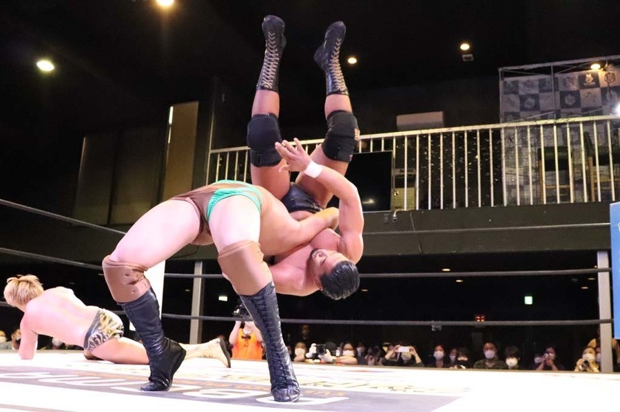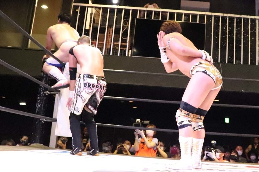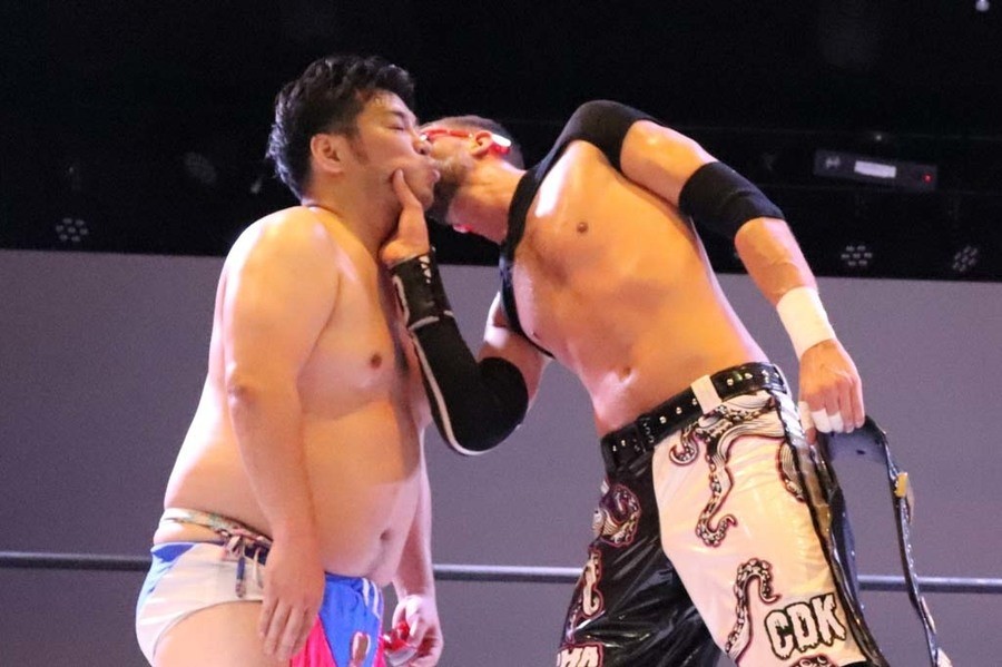 井上リングアナから昨今の情勢を踏まえてお客様を狩ることを「我慢している」とアナウンスされたディーノ。いつものキスができず悔しい想いをしながらリングイン。最後にクリスが登場するとディーノは大興奮。クリスはディーノとのタッグを早々に拒絶する。ディーノが平田に男色殺法もクリスは「ダメ! レスリング!」と注意。しかしディーノはお構いなく男色クロー。これはクリスがやめさせる。強引にディーノからタッチ権を奪ったクリスが平田に変形のテキサスクローバーもディーノがクリスの体を触りまくる。誤爆に乗じて抱き着かんとしたディーノ。クリスはもはやあきれてタッチすら拒否。苦しいディーノは2人まとめてコンプリート♂ショットを決めるとクリスに「名古屋のお客さんはアンタのファイトに期待している!」と訴え、さらに手拍子を起こさせると、クリスがようやくリングイン。クリスが一気呵成の攻めも平田のバックを取った際に、平田は「この体勢は俺ごと掘れ?」。さらにそこに大鷲、木曽レフェリーも加わって平田は「この体勢はまとめて掘れ?」。理解できてないクリスにディーノは「まとめて掘れ!」を言わせると、クリスのケツを己の股間で突いていく。ディーノはコーナーで尻出し。大鷲が地獄門に吸い込まれ、平田を投げんとしたクリスが地獄門へと吸い込まれダウン。平田はディーノの尻を手刀で叩き割ると、メガネをつけてダンス。これはディーノが男色クローで阻止し、メガネをタイツの中にイン。平田を男色ドライバーで仕留めんとするが、平田はタイツの中でメガネを装着することに成功してダンス。その背後からメガネをつけたクリスが現れ、平田のケツを股間でついていくと、弱った平田にディーノがリップロック。クリスがオクトパスストレッチで仕留めた。ディーノから握手を求められたクリスはこれを叩いて拒否も、頬にキスをしてディーノを喜ばせた。