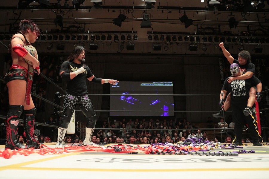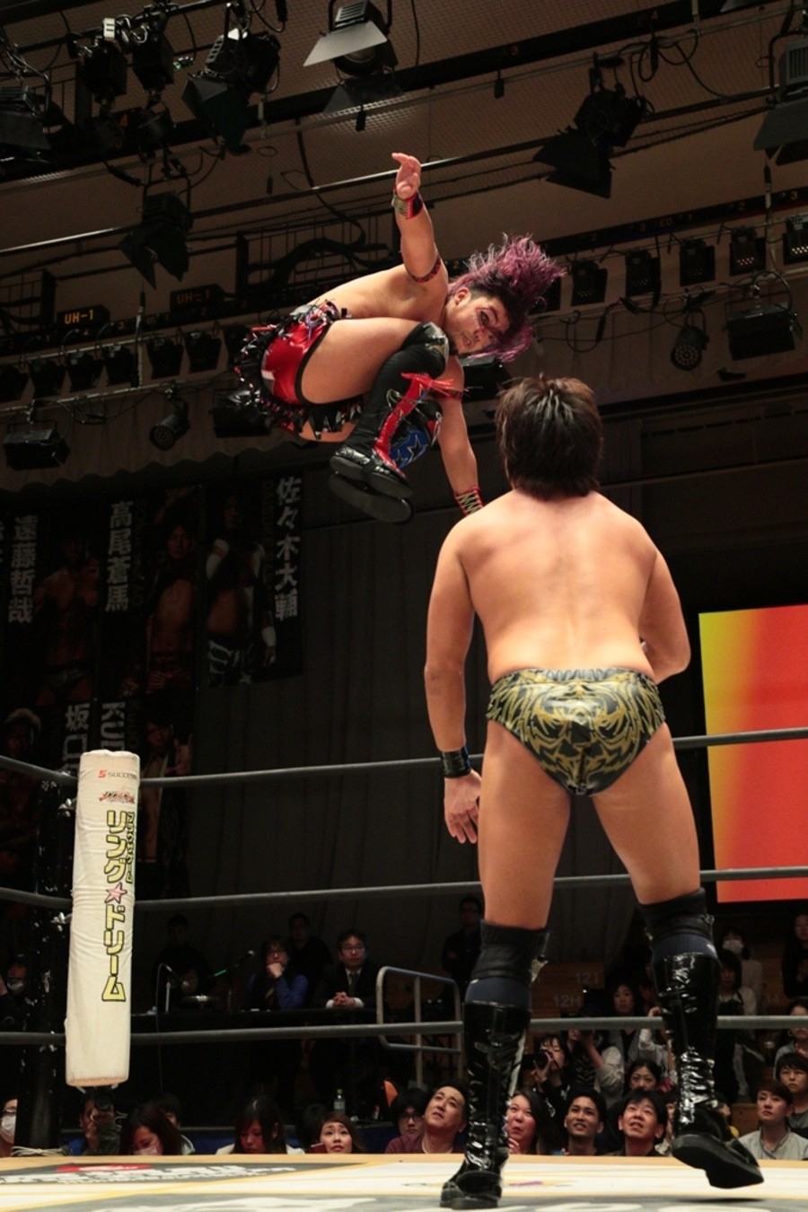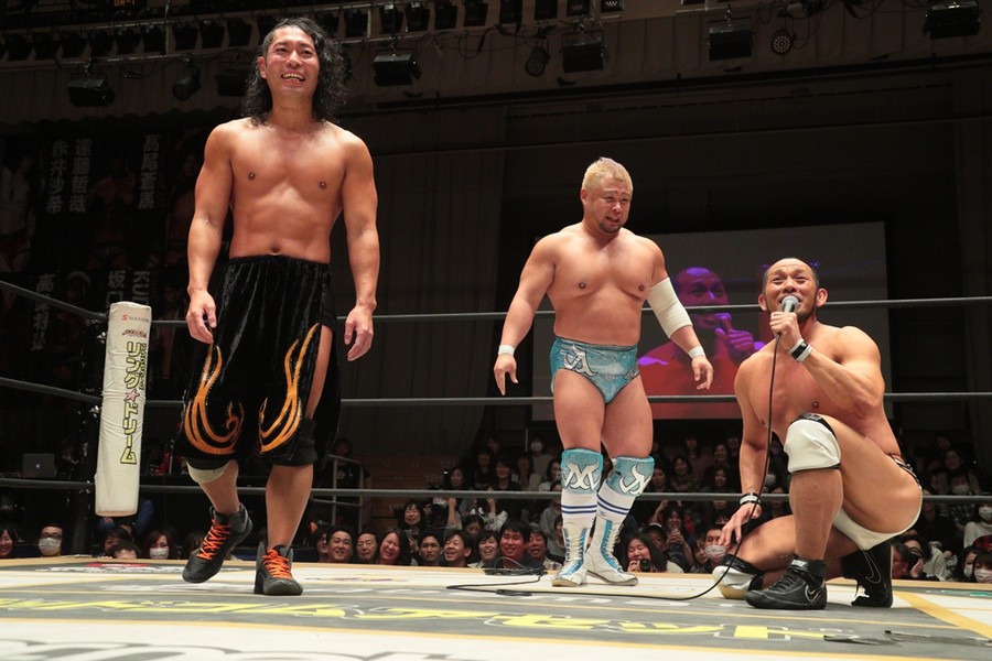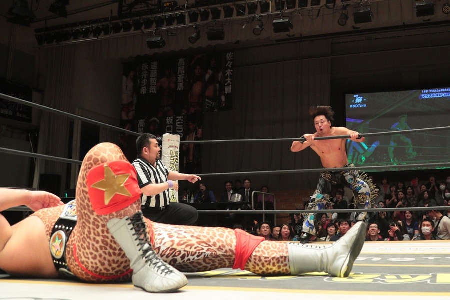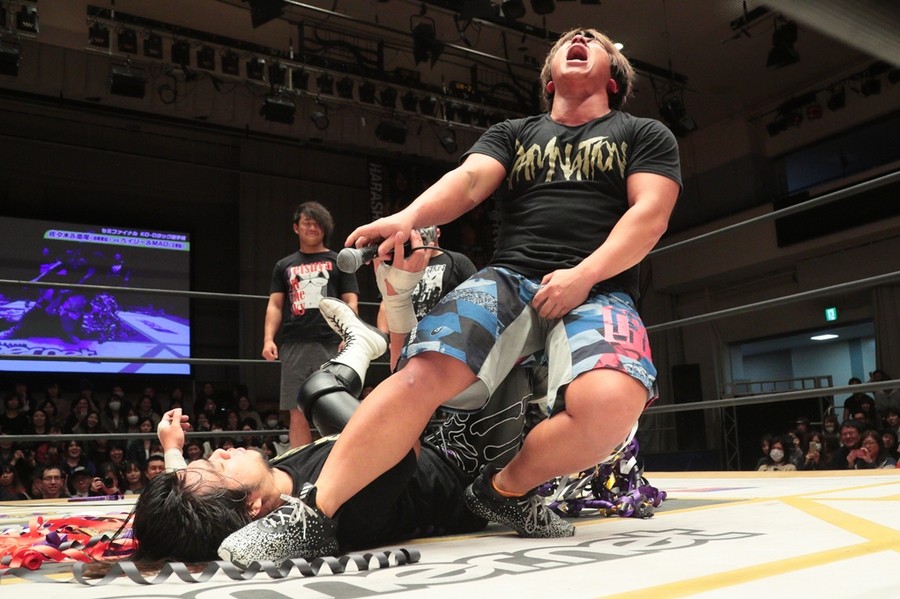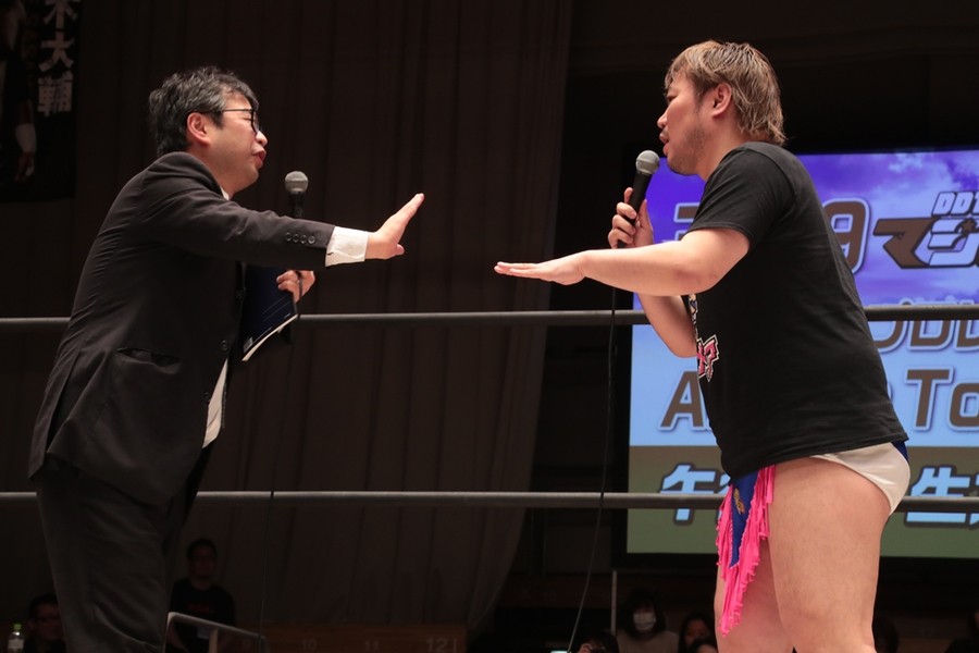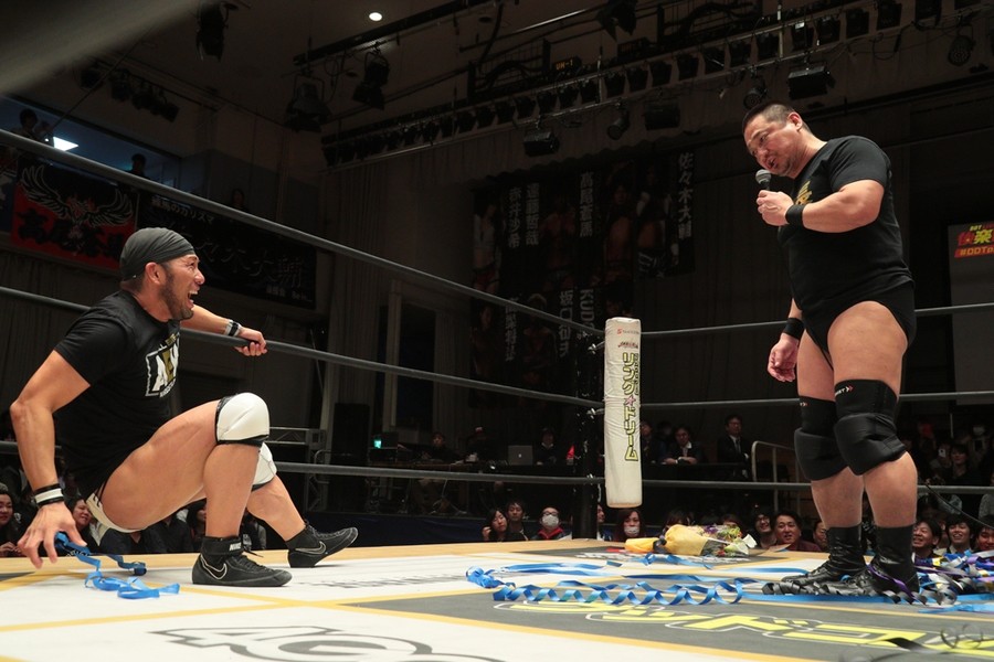上野 長州さんは俺たちの前にラッキィ池田さんが出たのとかも、控えてる段階で気になってたのかなと思います。今日は凄くいい経験ができて、でもいただいた言葉に燃える部分もあって。4月4日の新木場、僕は自分で望んで特殊なルールでスーパー・ササダンゴ・マシン選手とやることが決まってるので。(長州から)学べる部分と、僕が好きになったDDTで面白いものを見せていけるように、もっともっとやっていきたいと思いました。