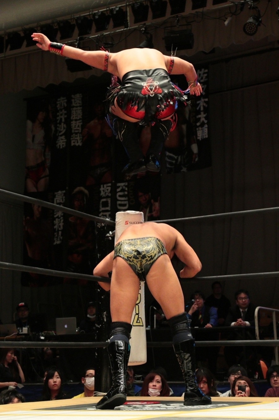 渡瀬が低空ドロップキックからスライディングキックも、これを読んだ勝俣がフットスタンプで迎撃してミサイルキック。勝俣が顔面ウォッシュを仕掛けるも、渡瀬はそうはさせず顔面ウォッシュ。ブレーンバスターからエルボーで攻め込む渡瀬。顔面ウォッシュからfromコーナーtoコーナーもカウント2。勝俣は一瞬のスキをついてカサドーラ。さらに返されるとフットスタンプを突き刺し、エビで固めてフォール勝ち。