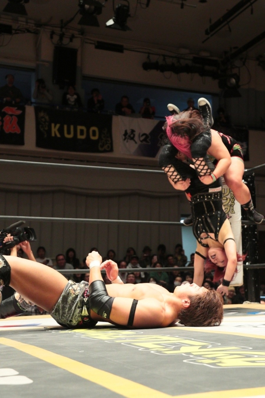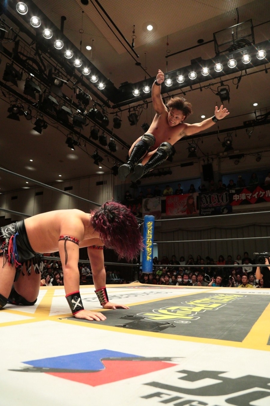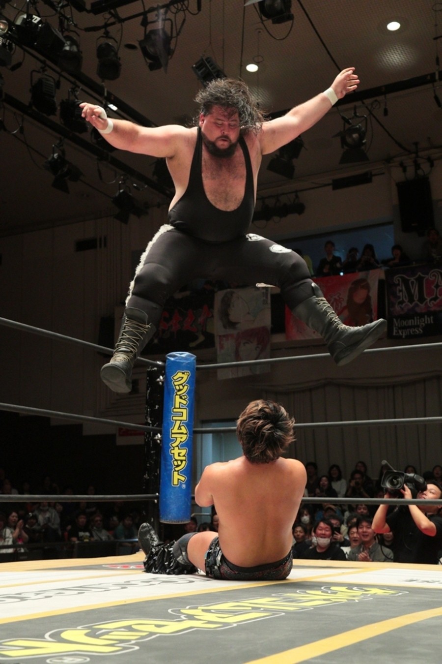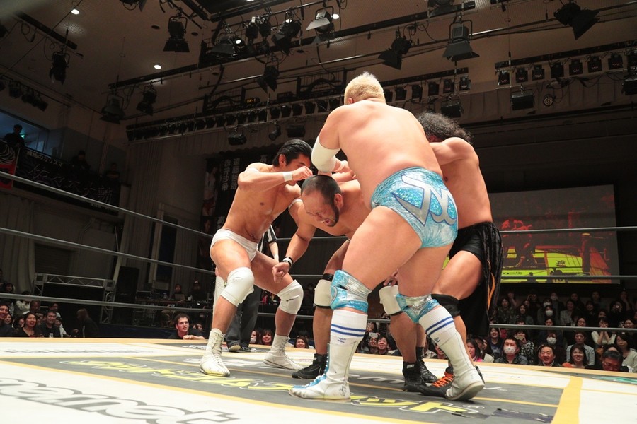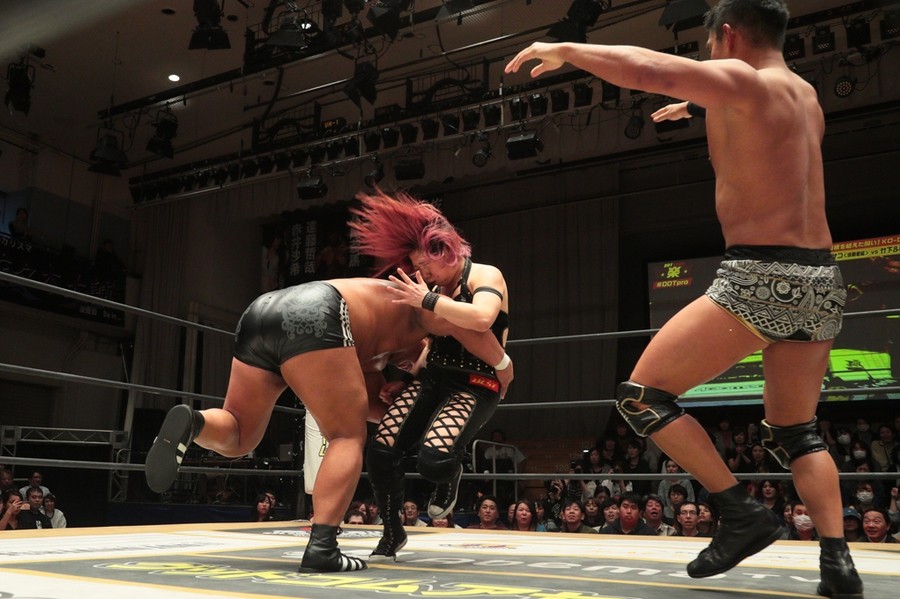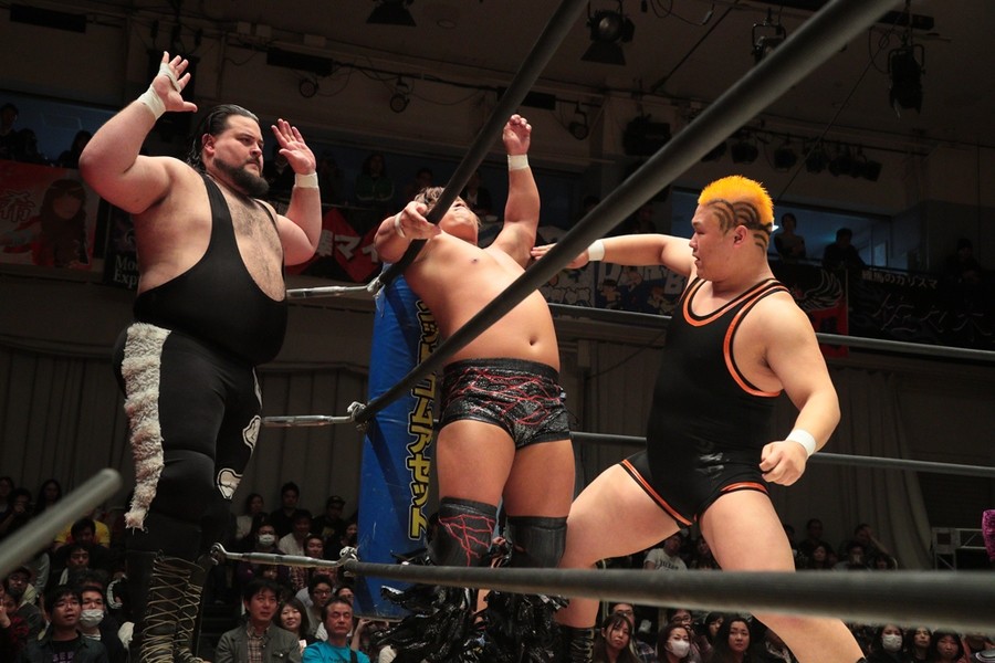 ベイリーに対して谷津ガードで相対する佐々木。ベイリーはローから蹴りを出すが、かわした佐々木は高尾にタッチ。佐々木が入ってきてMAOに襲いかかるが、ベイリーとのダブルドロップキックで外に出したムーンライト・エクスプレスはスカイラブハリケーンを狙う。これを佐々木が阻止すると、高尾が場外のムーンライト・エクスプレスにダイビング・フットスタンプを投下。さらにリングに戻ってDAMNATIONはダブルのガットバスターでMAOを追い込む。佐々木はドロップキックからパルプハンド式ガットバスター。高尾もスリングショット式フットスタンプ、ボディシザースとMAOの腹部を集中攻撃。MAOも何とかランニングエルボーを返してベイリーにタッチ。蹴りで反撃に出たベイリーは、その場跳びカンクーントルネードから足決めキャメルクラッチ。高尾はカウンターのドロップキックを返して佐々木にタッチ。サミングからベイリーのその場跳びムーンサルトニーをかわしてDDTで叩き付けた佐々木は、ダイビング・エルボードロップを投下。剣山で迎撃したベイリーだが、タッチを阻止した佐々木はトラースキックからペディグリーを狙う。だが、防御したベイリーはその場跳びムーンサルトニー。MAOはパンチからビヨーンで佐々木を吹っ飛ばすと、串刺しニーからハリウッドスタープレス。これを剣山で迎撃した佐々木はトペ・レベルサを狙ったMAOをクロスフェースで捕獲。ベイリーがカットするが、高尾が排除してからMAOにトレイン攻撃。DAMNATIONの連係攻撃をベイリーが阻止すると、ムーンライト・エクスプレスはスカイラブハリケーン。ややMAOの飛距離が足らず当たりは浅い。すると佐々木がベイリーを木曽レフェリーにぶつけてからイス攻撃。飛んできたMAOにもイスを投げつけた佐々木だが、MAOも急所攻撃を返すと、ジャンピングソバットからみちのくドライバー。さらにベイリーと同じコーナーに登るが、エプロンから高尾が突き落としてMAOの背中にフットスタンプを投下。高尾は雪崩式フランケンからジントニックを狙うが、MAOが踏ん張ると背後から佐々木がダイビング・ラリアット。DAMNATIONは合体式ジントニックを狙うが、ベイリーがカット。ベイリーは佐々木に竜巻旋風脚。ムーンライト・エクスプレスは高尾にハイキックを同時に叩き込むと、同じコーナーに登ってケブラーダとキャノンボール450°を同時投下。かわした高尾も丸め込みで切り返すが、MAOはスピンキックからみちのくドライバーIを狙う。しかし、これをジントニックで切り返した高尾が3カウントをゲット。