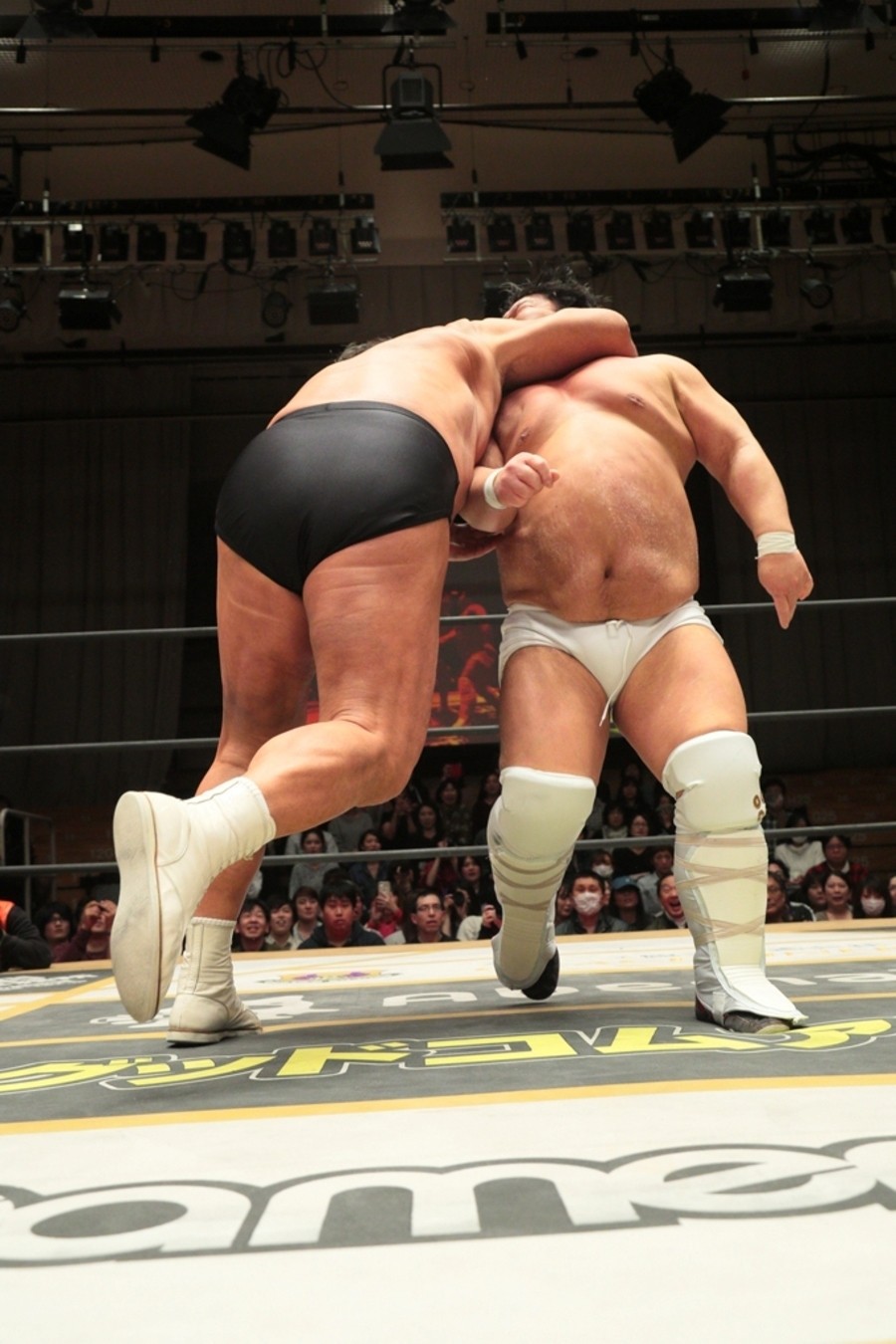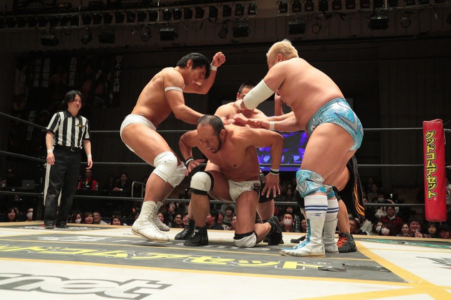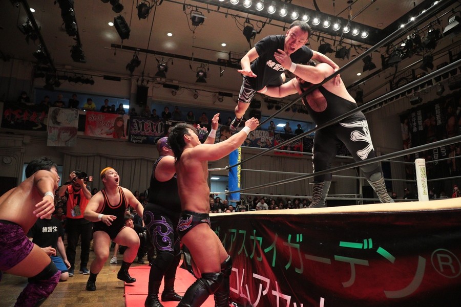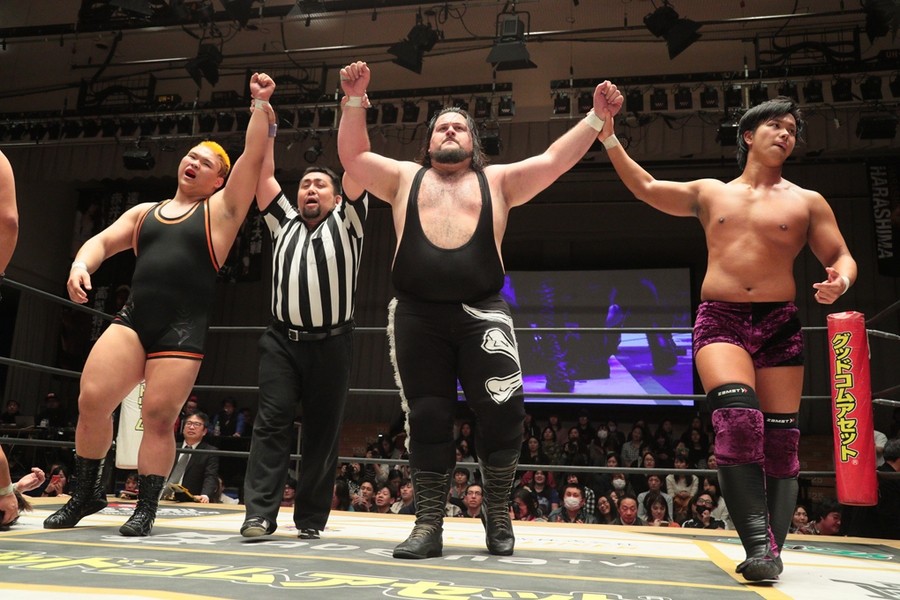 これが復帰戦の島谷がジェームスを挑発し、両者で試合開始。しかし組むことなくすぐに遠藤とタッチ。遠藤がドロップキックを放つも、すぐさまジェームスが重爆ドロップキックで吹っ飛ばしていく。その後、ポーリーから替わった島谷が梅田に襲い掛かるもミドルキックで蹴られてしまうと、吉村の逆水平で倒されてしまう。ジェームスが出てくると島谷はパワーの前に劣勢。しばらく捕まった島谷はエルボーで止めるとドロップキックを梅田に決めてようやくピンチを脱出。タッチを受けた遠藤が一気呵成の攻め。梅田もハンドスプリングをキックで迎撃して吉村と交替。吉村のベアハッグ・スープレックスはカウント2。遠藤はオーバーヘッドキックでポーリーとスイッチ。ポーリーはコーナースプラッシュ。吉村も大外刈りを決めてジェームスとタッチ。両者は地を揺らす肉弾戦。ジェームスがエクスプロイダー、ポーリーがラリアットを決めてダブルダウン。ポーリーが先に島谷タッチをかわすと、島谷はジェームスをボディースラムで投げんとする。しかし投げられず、ラリアットも逆に倒されてしまう。コーナーを背にした島谷は突進を回避すると島谷が補助してポーリーと遠藤のツープラトン・ブレーンバスター。遠藤と島谷の連続その場跳びシューティングスターからポーリーがセントーン。島谷のカバーは梅田がキックで阻止。遠藤とポーリーが排除されてしまうと島谷がピンチ。遠藤は咄嗟に練習生の中村をリングに入れる。ジェームスは中村を場外に落とす。島谷の逆打ちもブロックバスター^で切り返されてしまうと、ドインクドロップに潰された。
