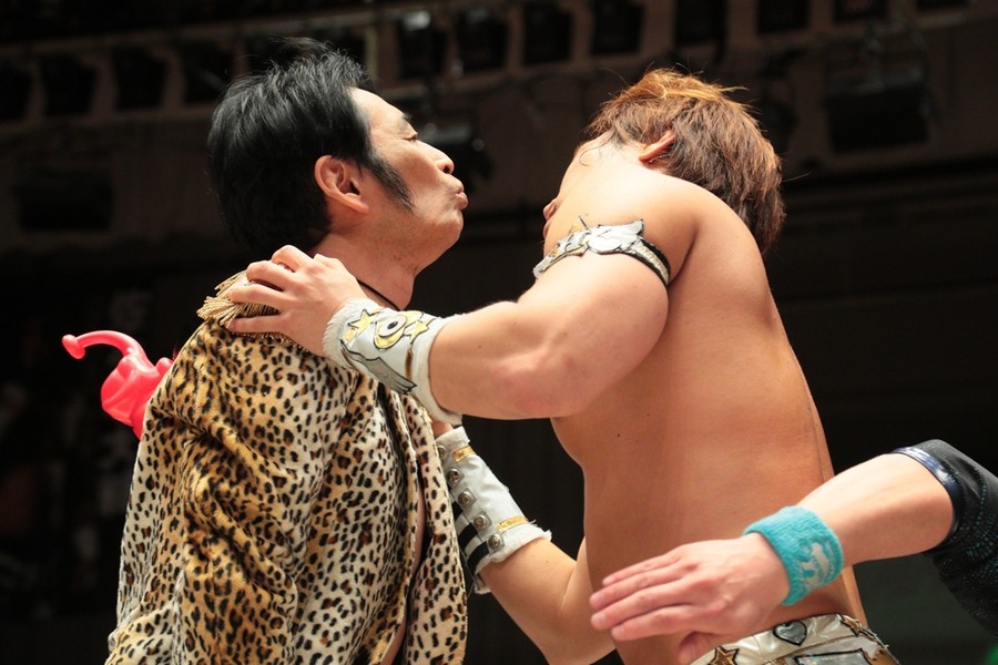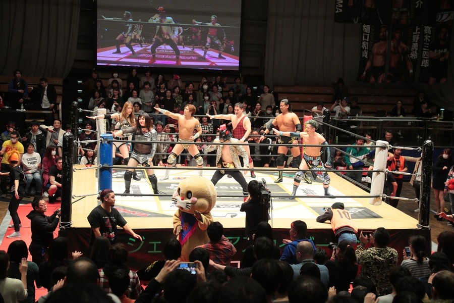 スクリーンでは平田が振付仮面のマスクを剥ぎ取り、「こんなマスク被らせないからな!」と言い放つ。大石にマスク奪還を命じたラッキィ池田は手で顔を隠しながら入場。マイクを持った平田は「おいラッキィ池田! ゴチャゴチャ言いやがって! このマスクがないとプロレス体操出来ねぇな。そもそもオマエのプロレス体操より俺のTOKYO GOのほうがみんな見たいでしょう」と言い放つが、平田を無視して赤井と朱崇花が乱闘。平田が割って入ろうとするが、ダブルの蹴りを食らってしまう。さらに大鷲がボディプレスを投下。だが、平田もダブルラリアットで大鷲と赤井を吹っ飛ばす。そこにアントンと大石が入ってきてダブルの正拳突きをお見舞いすると、朱崇花がライオンサルト。平田もドロップキックを返して大鷲にタッチ。ヘッドシザースで大石とアントンを投げた大鷲は、朱崇花に逆水平チョップ。朱崇花もブレーンバスターで投げると、赤井がダイビング・クロスボディー。大石に旋回式リーマン銀河を決めたが、カットされると平田にタッチ。しかし大石はカウンターのパンチをお見舞いすると、アントン、朱崇花とトレイン攻撃。これを手刀で迎撃した平田は大鷲と赤井にも手刀をお見舞いし、大石を気功で吹っ飛ばす。そこにラッキィが上がってきて手刀攻撃。平田が打ち勝ったかと思われたが、背後からモンゴリアンチョップを見舞ったラッキィはマスクを奪還。だが、平田が反撃してカズキルーペを装着。アントンが止めようとするが、ロープに躓いて転倒。ギブアップする前にごんぎつねを披露。野球を観に来たら巨人軍ではなく巨○ン軍だったのだが、大鷲はごんぎつねをキャッチ。するとお互い見つめ合ってロマンティックな雰囲気に。それを平田とラッキィが止めようとするが、思わず抱き合う格好に。何かが芽生えた二人が唇を重ねようとするが、大石が平田に飛び付き丸め込む。平田も返そうとしたが、アントンがごんぎつねを見舞い、そのまま大石が丸め込んで3カウント。