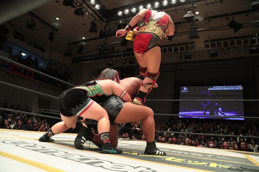 竹下も橋本も2本のベルトを保持。竹下と里村が睨み合う。彰人が里村に握手を求めると、飯野がその手を引き剥がして先発を買って出る。橋本と真っ向からタックルでぶつかり合い、なぎ倒してみせた飯野は早くもハカエルボー。余裕でかわした橋本は「ぎゅん!」からのエルボーを投下。だが、飯野もハカエルボーを返していく。里村が竹下に串刺しジャンピングエルボーを見舞えば、竹下もすぐに同じ技をお返し。チサコは彰人の低空ドロップキックをかわしてフットスタンプを投下してからブレーンバスター。竹下と飯野のサンドイッチ・ラリアットはチサコがかわして彰人に誤爆。ALL OUTを場外に連れ出すと、チサコがコーナーからプランチャ。彰人をリングに戻し、ミサイルキック。だが、彰人も竹下との連係攻撃で反撃。竹下は豪快なシュミット流バックブリーカー。飯野も容赦ない逆水平チョップ。しかし彰人にRKOを返したチサコはフットスタンプを落として橋本にタッチ。エルボーの打ち合いから彰人は俵返し。すぐに橋本も俵返しを返すと、里村が入ってくるが、彰人がロープワークで翻弄したところに竹下がミサイルキック。ALL OUTは三人がかりの攻撃で里村を追い込むが、里村はオーバーヘッドキックを返してチサコにタッチ。振り子式串刺しドロップキックからダイビング・フットスタンプを投下したチサコだが、かわした竹下はザーヒー。彰人と飯野も入ってきて代わる代わるチサコを攻撃していくが、竹下のファブルを橋本が阻止。それでもダイブした竹下だが、チサコがカウンターのRKO。仙女はトレイン攻撃から里村がフロッグスプラッシュ。さらにチサコが橋本を雪崩式フランケンで投げて竹下にぶつけると、自身もダイビング・フットスタンプ。竹下もRKOを狙ったチサコを垂直落下式バックドロップで叩き付ける。そでもチサコは里村のアシストを受けて飯野を丸め込むがカウントは2。飯野と橋本はお互いに意地のぶつかり合い。橋本は飯野の巨体をボディスラムで叩き付けるが、飯野もスピアをキャッチしてブレーンバスター。竹下が里村をブルーサンダーで叩き付けるが、橋本がスピア。飯野が'ラリアットで飛び込んでくるが、スピアはかわした橋本。そこに竹下がフロントキック。さらに橋本を肩車すると、飯野がコーナーへ。だが、橋本がジャーマンで竹下を投げ捨てると、里村とチサコが足止めしていたコーナーの飯野をパワーボムで投げ捨てる。橋本はコーナー最上段からサマーソルトドロップを投下。さらにチサコがホルモンスプラッシュを投下すると、橋本がオブライトを狙う。飯野が腰を落とすが、里村がスコーピオライジングを落とすと、橋本がオブライトで投げて3カウント。
