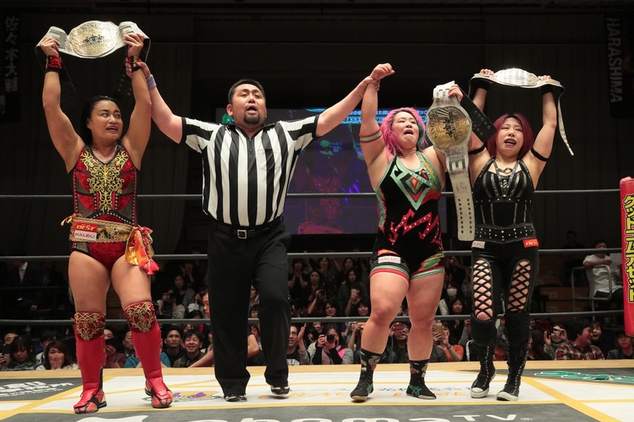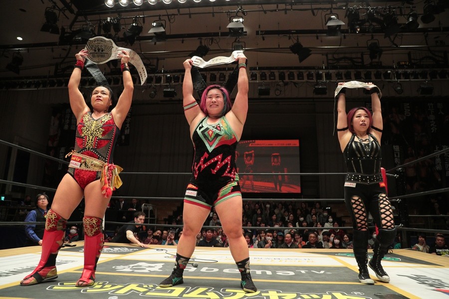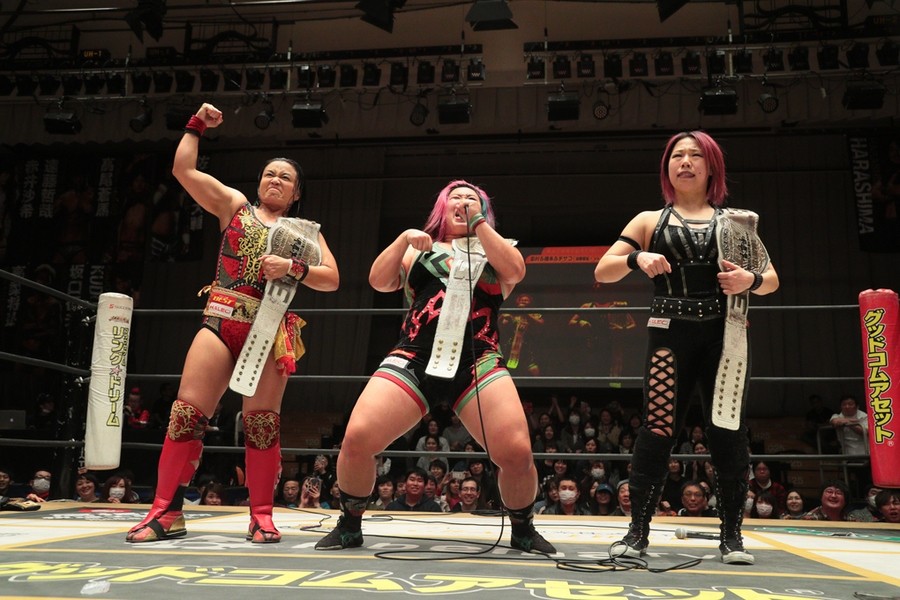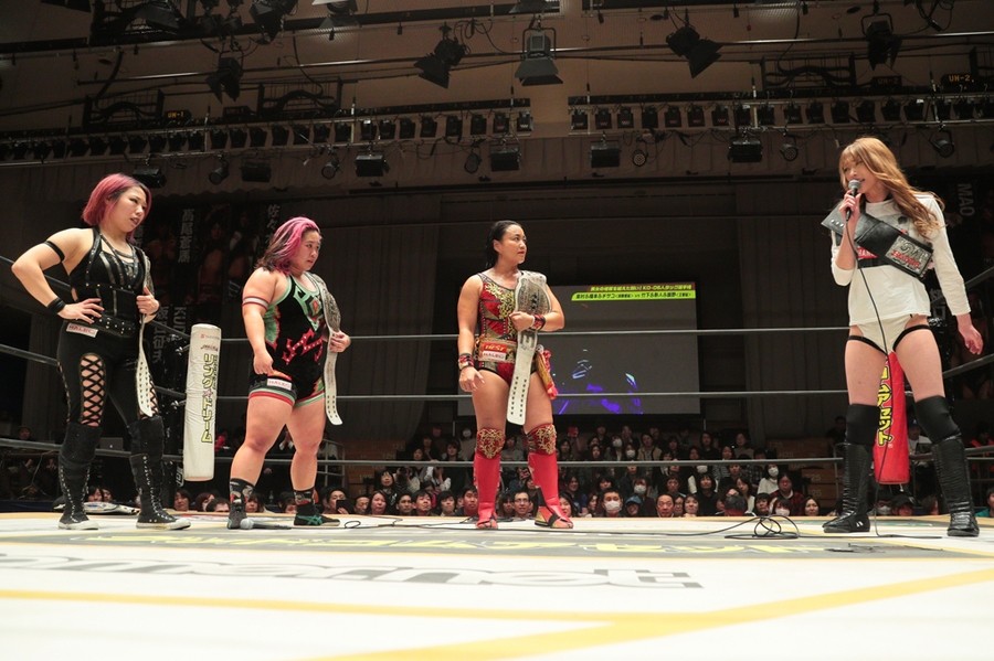 チサコ 自分は他団体でベルト獲るのはすげえ好きなので。一回闘って負けただけじゃあきらめてなかったので。今日はこの3人でベルトが獲れて本当に嬉しいです。