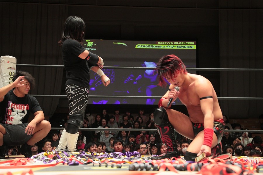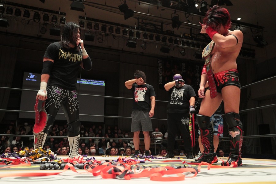 勝った高尾は「約7年ぶりにこのベルト獲ったぞ。7年間どうだっていい。このチームに入り、ようやく勲章が獲れた。このベルト獲ったけど、あんたこれ終わったらどっか行くらしいな」と言って佐々木にマイクを渡す。佐々木は「その通りだ。今日が俺の最後のDDT。10年とちょっとここでやってきたけど、いい団体だったよ。俺は海外に行く。まだどことは言えない。なぜならば今から交渉するからだ。今日は! バックステージにAEWがいる! 今から俺はAEWと話がしたい! また俺が必要な時は声をかけてくれ。ありがとう」と衝撃発言。遠藤とポーリーが泣いている(?)中、高尾が「大きな声で言ったことはないけど、佐々木さん、ありがとう」と言うと、島谷が「カリスマが海外? お前ら待たせたなー! DAMNATION二代目リーダー、俺がノブだイエーイ!」と言い出すが、佐々木が素早く戻ってきて急所攻撃。「待たせたな。俺が三代目リーダーだ。俺が必要のようだな」と、アッサリ元サヤに収まった。