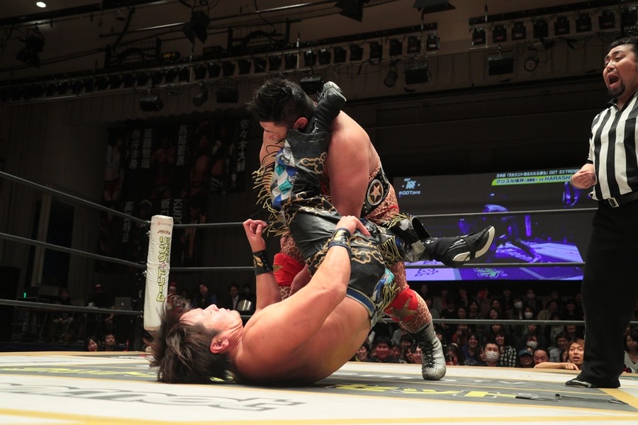 3本目は相手を上に乗せて、自分の肩をマットに3秒間つけたほうが勝ち。HARASHIMAがレスリングの動きから、どうにか坂井を上に乗せてカバーさせるが、坂井は大の字に寝転がる。しかしHARASHIMAは弓矢固め。さらにロメロスペシャルを狙うが、吊り上げは失敗。逆にロメロスペシャルを仕掛けた坂井だが、こちらも上がらず。ならばとマッスルロックからマッスルボンバー、垂直落下式リーマンショック2連発と畳みかけた坂井は、グッタリするHARASHIMAを上に乗せてカバーさせるがカウントは2。3発目のリーマンショックを防御したHARASHIMAはジョン・ウーから串刺し式蒼魔刀。フラフラと倒れそうになる坂井の目の前に寝転び、うまく坂井を上に乗せたHARASHIMAはそのまま3カウントを聞いて勝利。