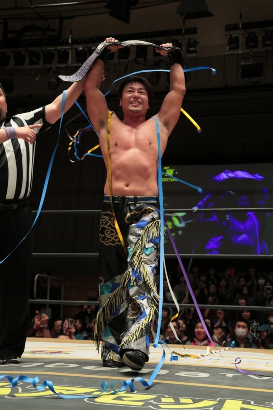 高尾 リング上で言った通り、7年ぶりのこのベルト。HARASHIMAと組んでもかすりもしなかったこのベルトがDAMNATIONに入って。カリスマのおかげもあるから、大事に防衛していく。