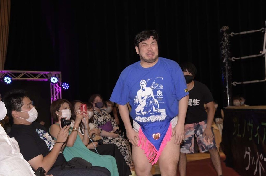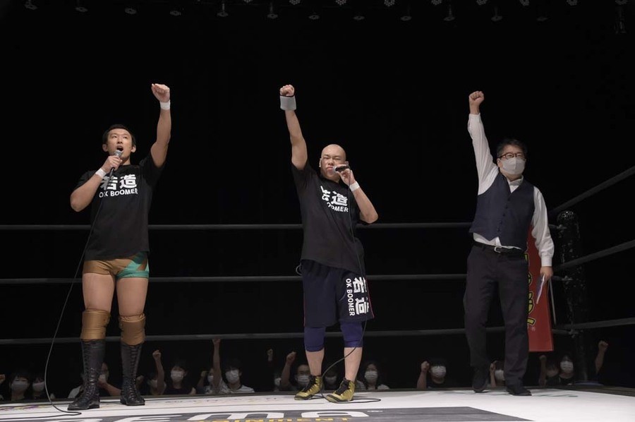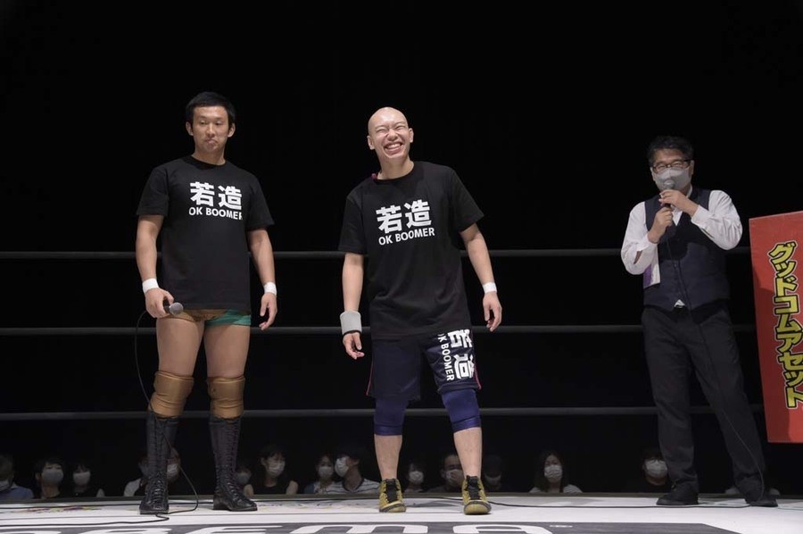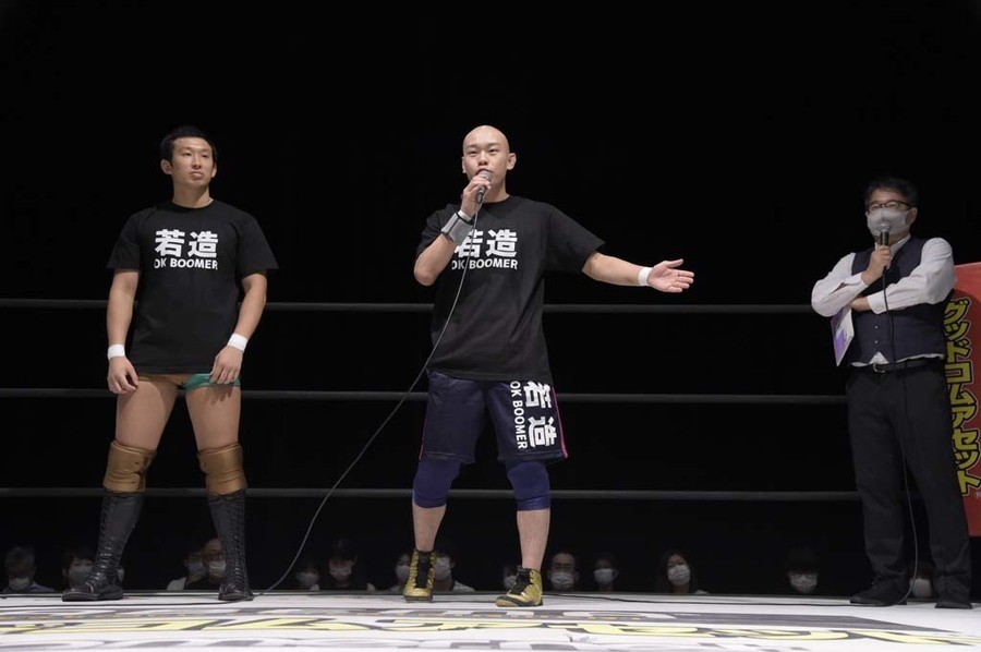 まずは今林久弥アシスタントプロデューサー、井上マイクリングアナウンサーによる前説から。本日の東京女子プロレスを体調不良で欠場した選手が新型コロナウイルス陽性と判定されたとの連絡が大会終了後にあり、東京女子プロレスの選手が濃厚接触に当たる可能性があるため、明日の東京女子プロレス神田明神ホール大会と22日の板橋グリーンホール大会の中止の発表がリリースされたばかりだが、DDT参戦選手との接触はないため、本日のDDT大会と明日のBOYZは予定通り開催される。木曽レフェリーといった一部スタッフは大事を取って欠場。現時点でDDT参戦選手、スタッフは平熱で体調不良者は見受けられないが、今林APからは「今の時点で不安に思われる方は本日のチケットを払い戻しさせていただきますので受付のほうにお越しください」との呼びかけとお詫びが述べられた。さらに本日、腰の不調による飯野雄貴の欠場のお詫びのアナウンス。続いて観戦にあたっての諸注意、本日のリモートサイン会の告知、さらに9・7後楽園大会でのチーム大老害出陣第2戦目として秋山準&高木三四郎vs竹下幸之介&勝俣瞬馬も発表された。中村&岡谷を呼び込む。2人は“若造”Tシャツを着て登場。中村は「会社にいる老害、嫌いですよね? それを倒すんでよろしくお願いします!」岡谷は「相手は老害ということなんで、全力で倒します」とそれぞれ意気込み。2人による「DDT神田明神ホール大会、スタート!」の掛け声で大会はスタート。