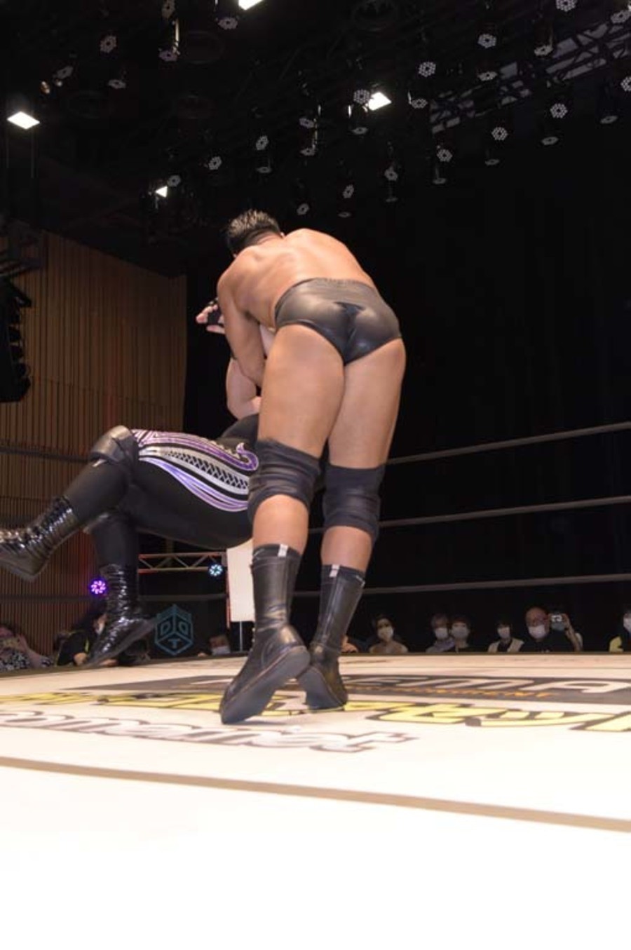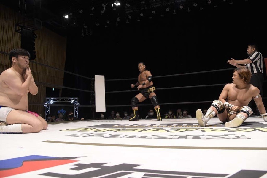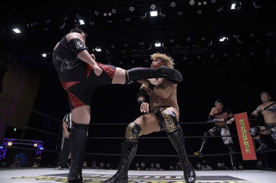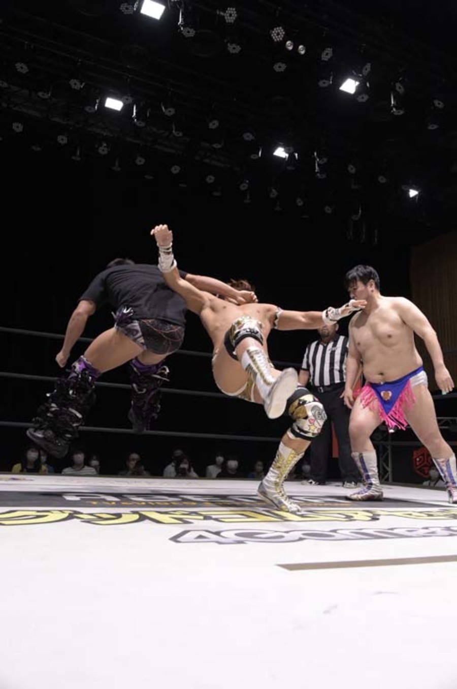 遠藤と樋口で開始のゴング。樋口が腕を取って優位に試合を進めるも、遠藤は髪を掴んで脱出。樋口がチョップを放つと、遠藤は場外に退避。距離を取っていく。ポーリーと坂口にタッチ。坂口が打撃のラッシュを見せると、ポーリーも打撃勝負。蹴り足を掴んだポーリーがぶっこ抜いてフィッシャーマンバスター。ここからDAMNATIONが代わる代わる坂口を捕まえる展開に。坂口がダッシュミドルを決めて樋口にタッチするも、ポーリーがレフェリーの視界を塞いでおりタッチ成立ならず。坂口の苦しい時間が長くなる。坂口が再度ポーリーにダッシュミドルを決めてようやく樋口にタッチ。樋口がタックルでポーリーを吹っ飛ばすと、打撃の打ち合い。しかしポーリーはカウンターのテーズプレス。ポーリーから遠藤にタッチ。遠藤は樋口をコーナーに振ろうとするが、力で逆に振り返し。突っ込む樋口に遠藤は丸め込み、そこからゆりかもめへ。樋口が潰すもカウント2。ポーリーが飛び込み、遠藤がポーリーを踏み台にムーンサルトを狙うも、樋口がフェイスバスターでポーリーに遠藤を叩き付ける。遠藤が場外に退避するが、坂口が攻撃を加えリング内に戻すと、樋口のチョップが遠藤を捕らえる。串刺し攻撃からカナディアン・バックブリーカー。ポーリーがカット。坂口が入ってポーリーを蹴散らすも、遠藤が2人まとめてハンドスプリング・オーバーヘッドキック。ポーリーにタッチ。ポーリーが串刺しボディアタックからボディプレスもカウント2。さらにSTFで樋口を捕らえる。坂口がカットに入ると、遠藤が飛び込み坂口を場外へ。今度こそポーリーを踏み台にムーンサルトを放つが樋口がかわし自爆。樋口が遠藤をチョークスラムでポーリーに叩き付ける。樋口がエプロンからロープを使ってのエルボードロップ。カウント2。さらにブレーンバスターを狙うがポーリーが投げ返す。ポーリーと樋口がラリアット相打ち。坂口が飛び込み、ポーリーの後頭部に神の右膝。樋口がラリアットもカウント2。樋口がパワーボムの体勢に入るも、ポーリーは脱出。ハンマーを連発し、ロープに走ると、樋口は強烈なぶちかまし。ポーリーも返せず3カウント。試合後樋口と遠藤が視殺戦を展開した。